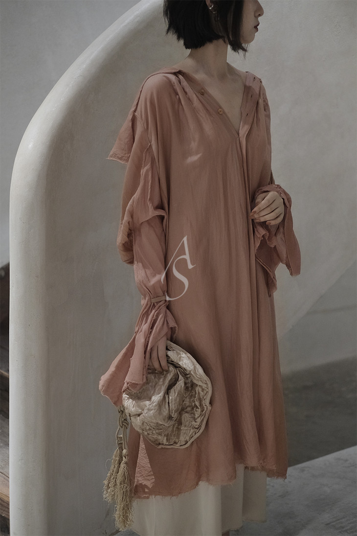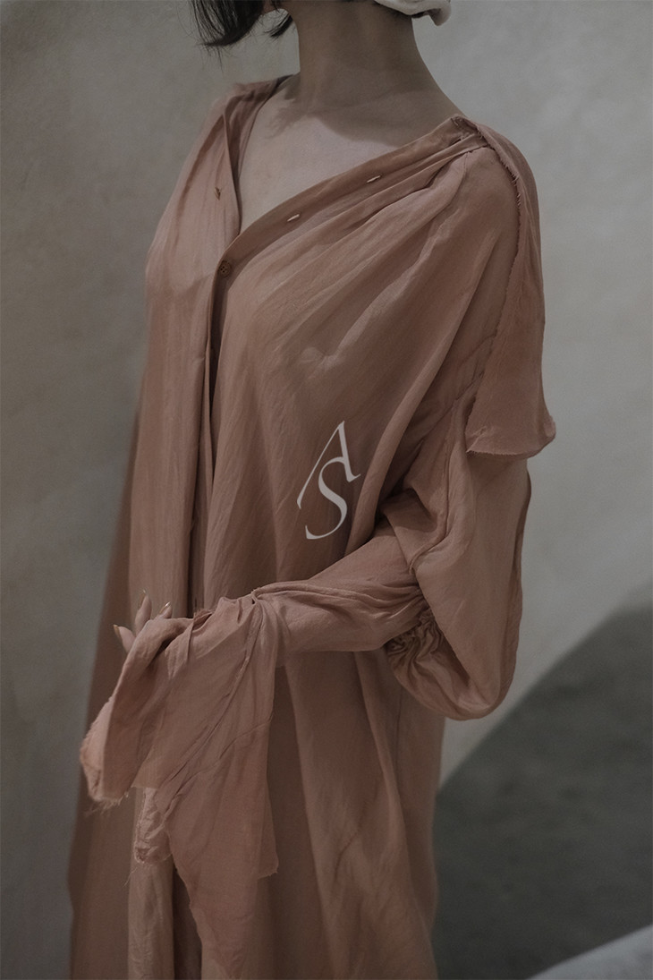 桑蚕丝和羊毛织成的面料温柔暧昧,如夕阳余晖般暖橙色和灰粉色相互交融掩映。柿染后留下独特的色彩纹理。Phaédo将传统羊腿袖解构重组,当代美学与古典浪漫融汇于肩臂一体的剪裁上。单穿长度刚好及腿肚,垂下浪漫的波浪型裙摆,也可作为罩衫穿着。