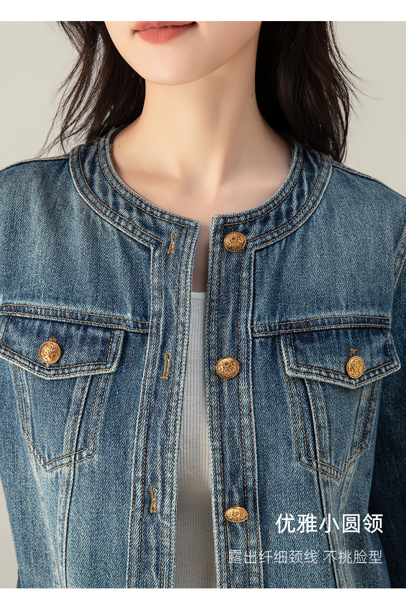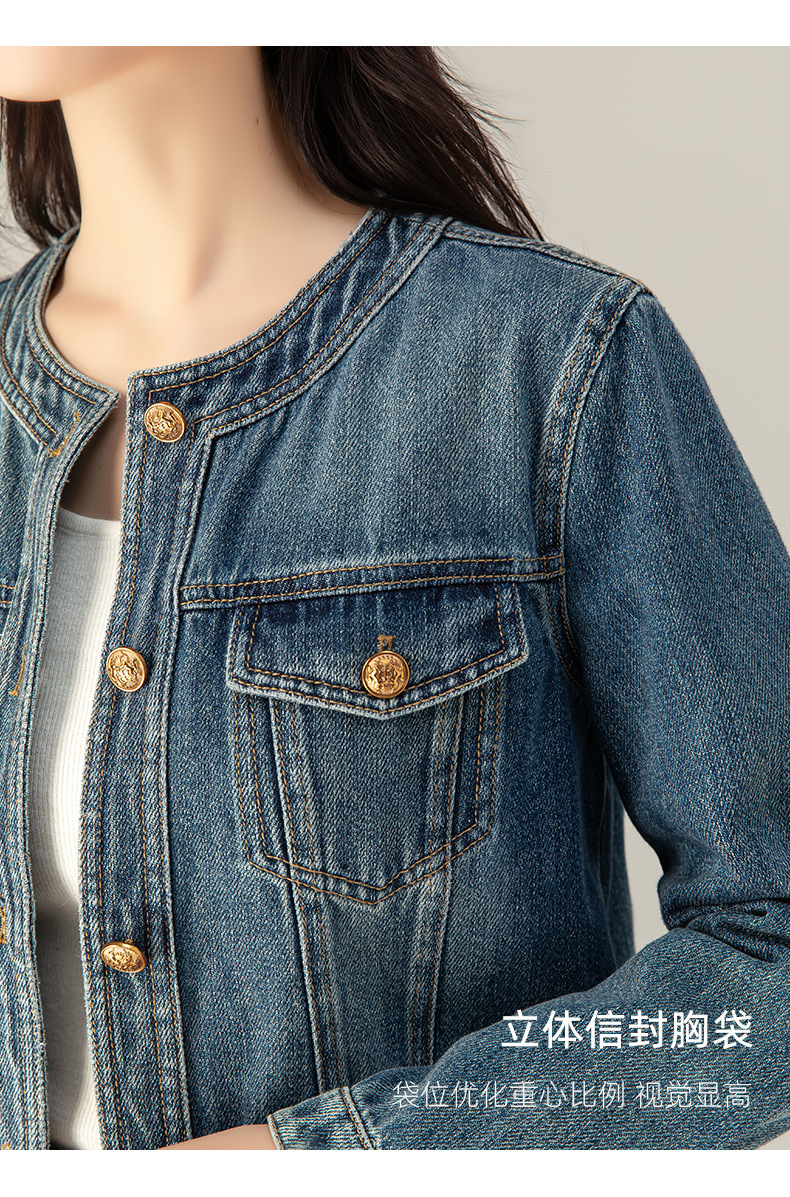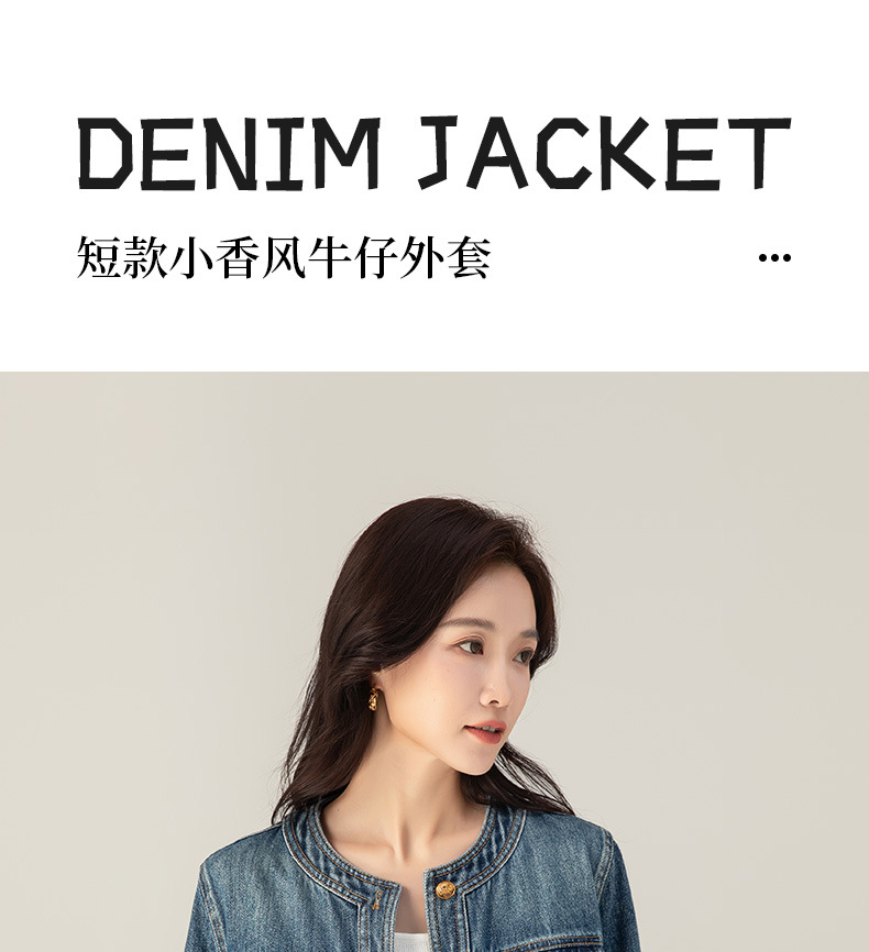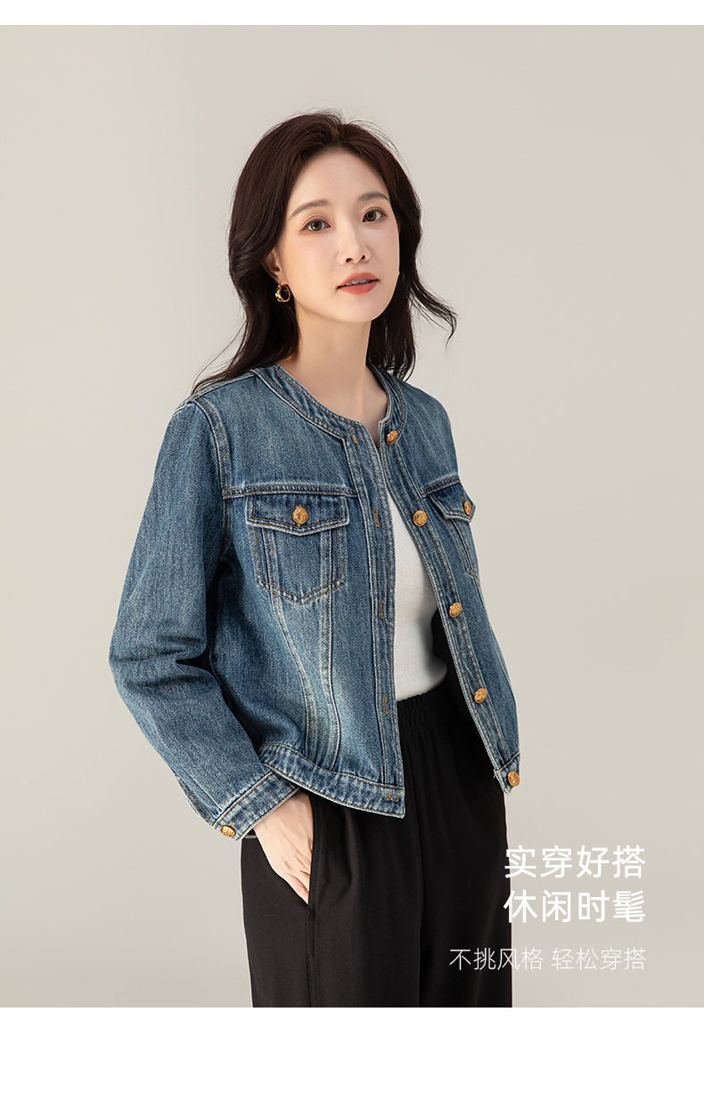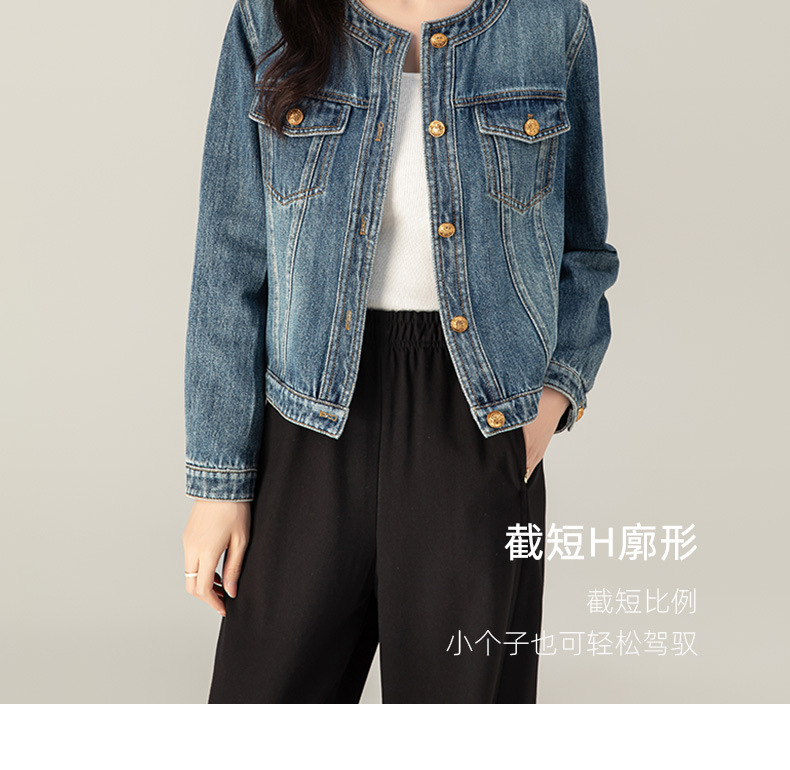 丁摩 圆领小香风牛仔外套女春秋装新款宽松复古水洗气质夹克5ZF-64668