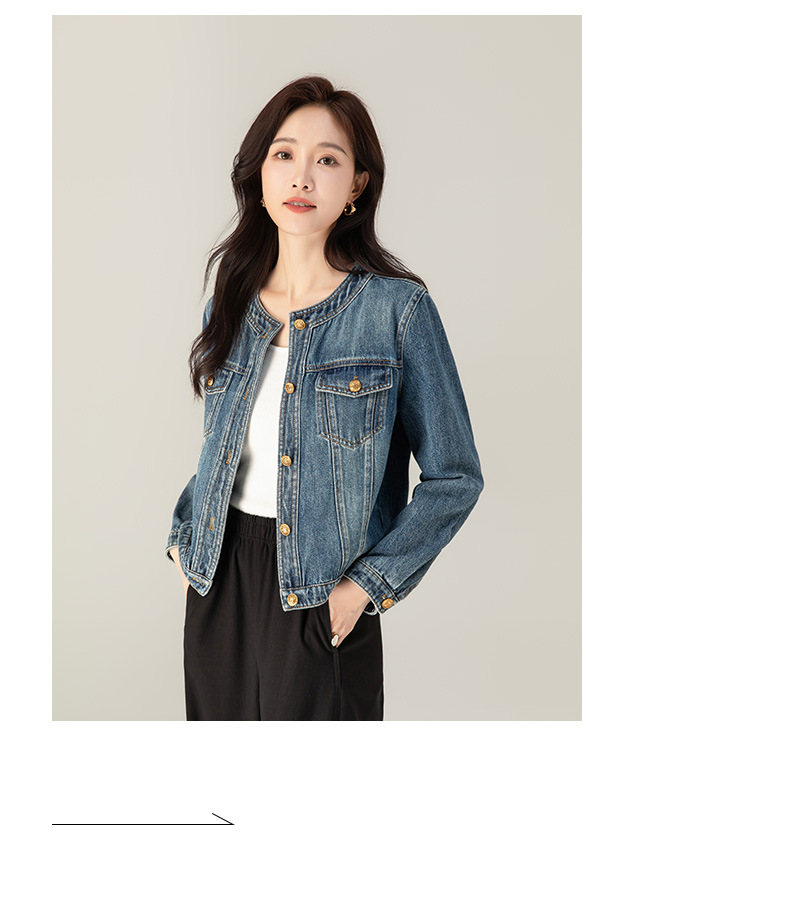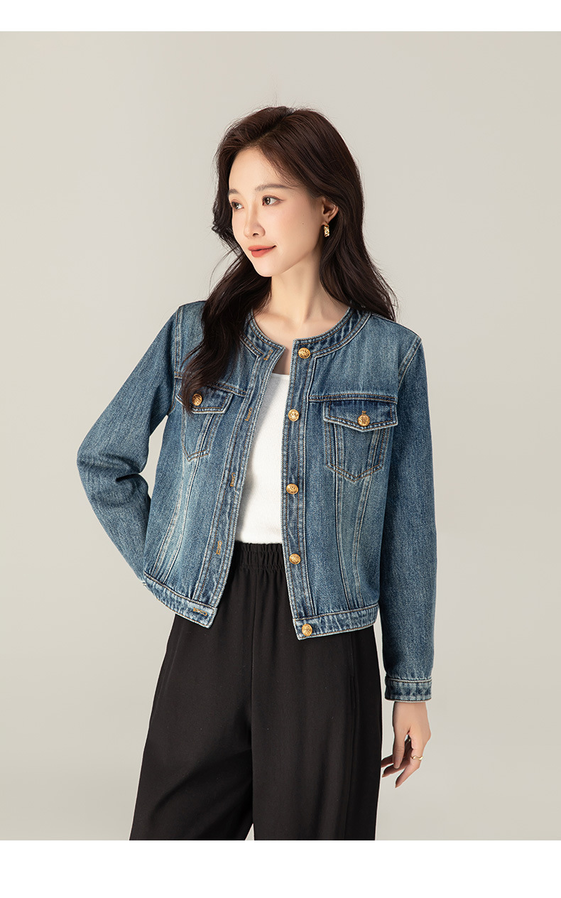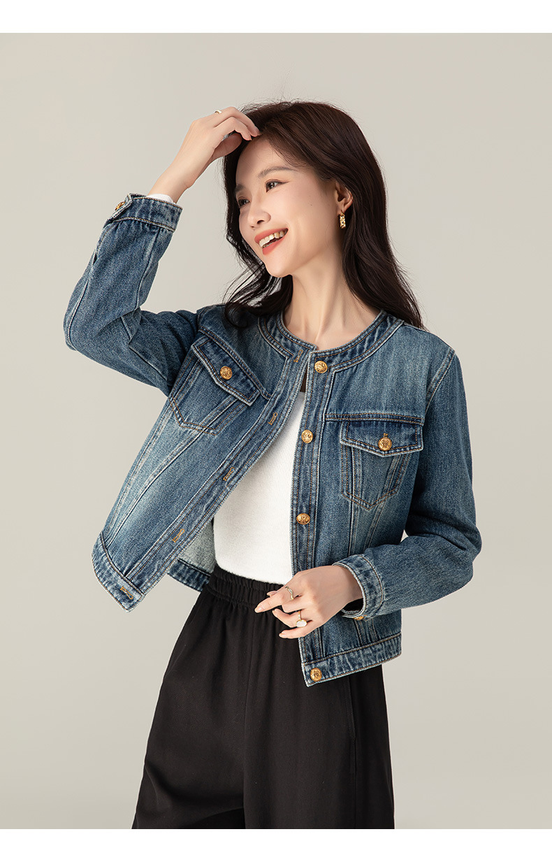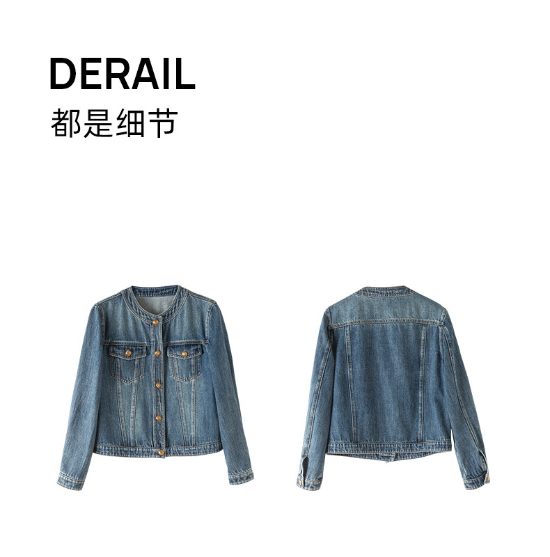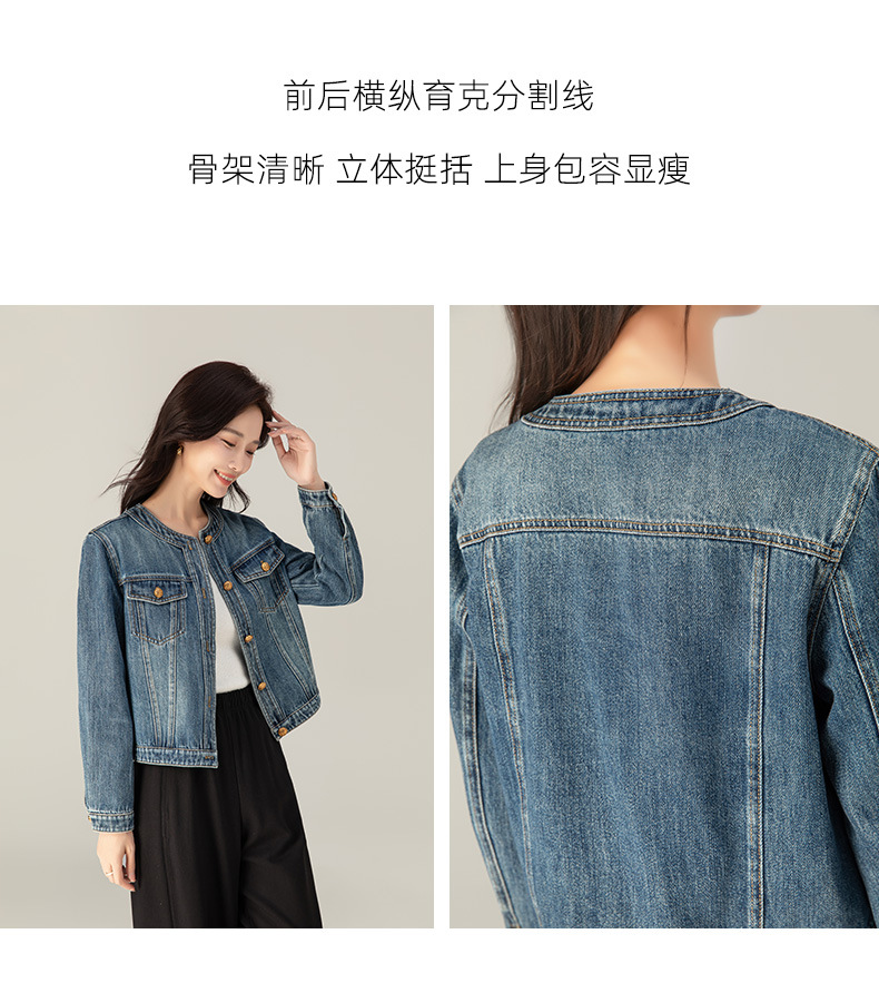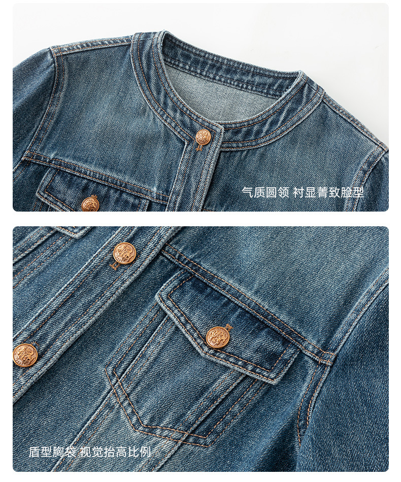 丁摩 圆领小香风牛仔外套女春秋装新款宽松复古水洗气质夹克5ZF-64668