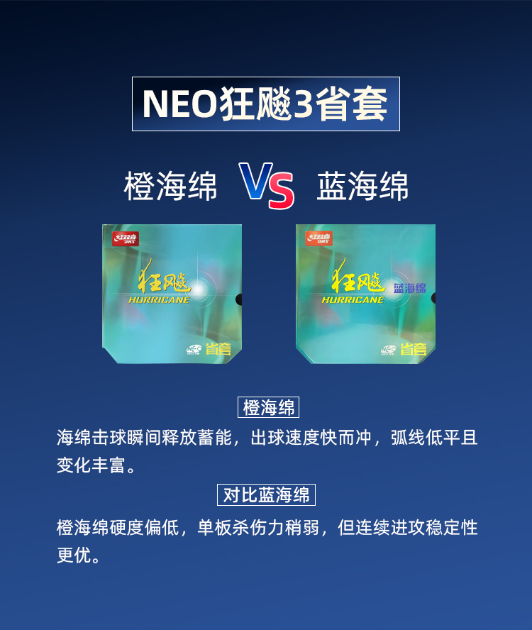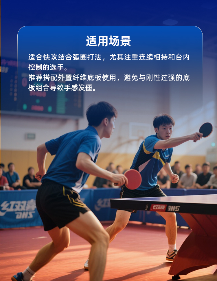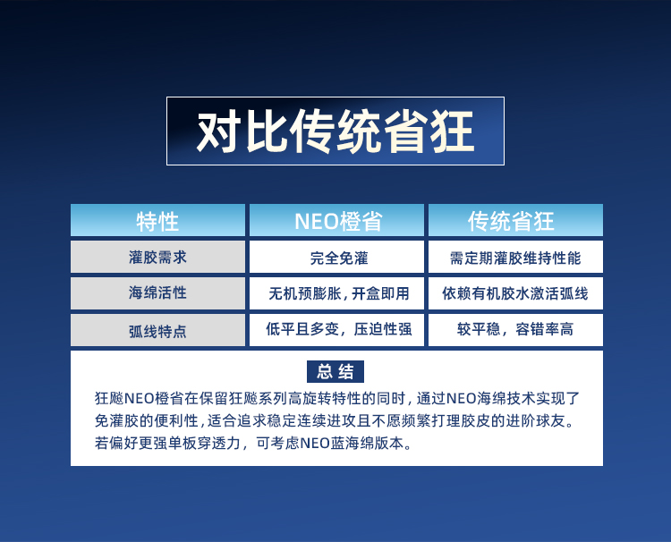 适合快攻弧圈型打法:狂飚3NEO省套套胶适合快攻弧圈型的打法,具有速度与旋转兼备的特点,控球性能极佳