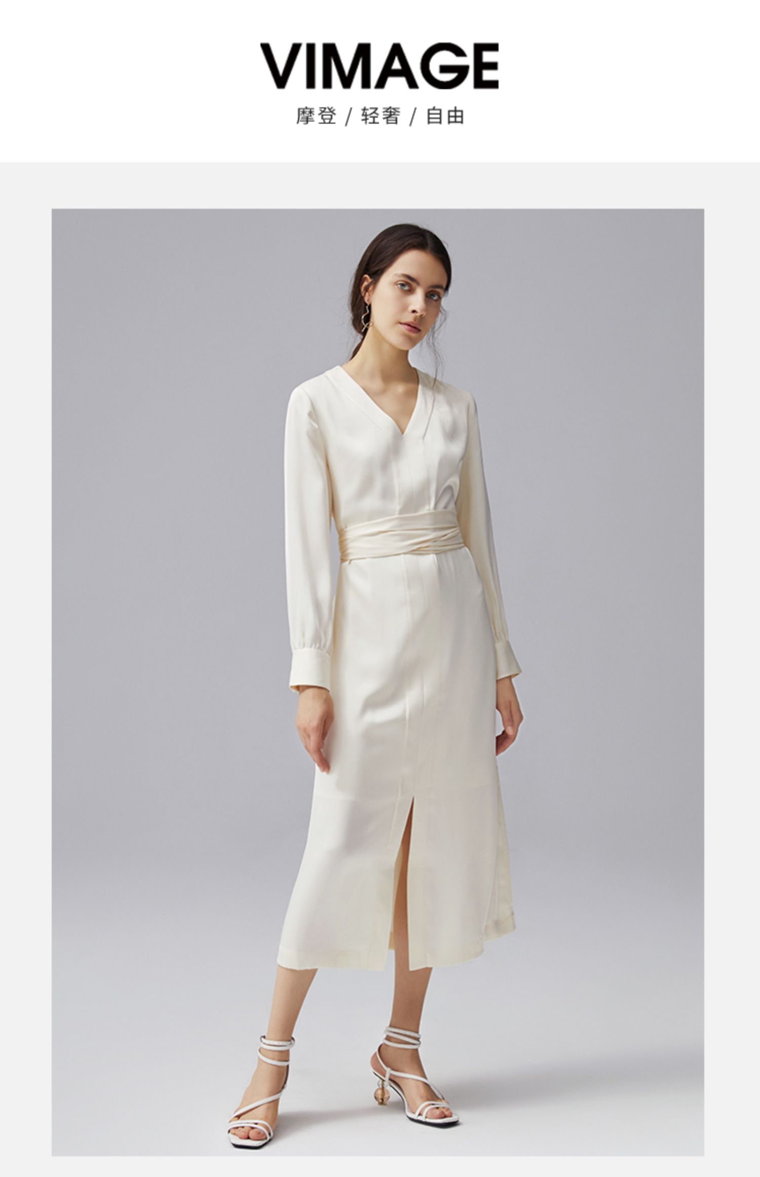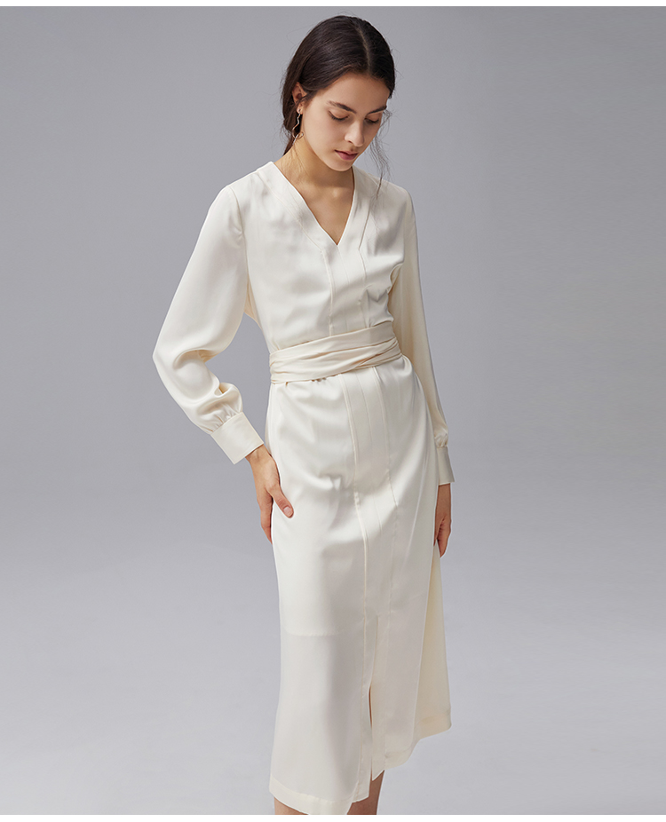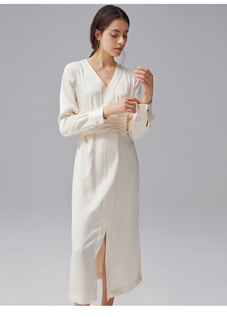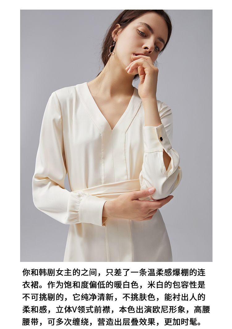 VIMAGE纬漫纪秋季新款V领显瘦高腰纯色开叉长袖连衣裙VC2107222