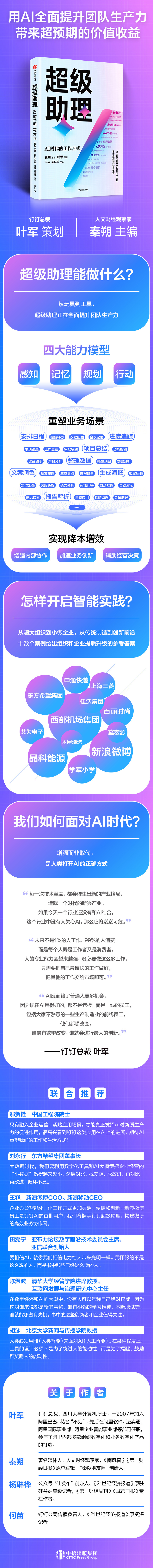 智能办公时代,人工智能正在进入千行百业,成为降本增效的生产力工具。每个企业、每个人都将拥有个性化的超级助理,以“人机协同”的新常态创造AI时代的工作方式。本书以钉钉的探索与实践为基础,展现了基于人工智能的超级助理将为企业和个人带来的巨大变革。从战略制定到业务增长,从组织协同到人事管理,超级助理将利用感知、记忆、规划和行动四种主要能力,在企业协作、创新和决策方面提供更好的支持。