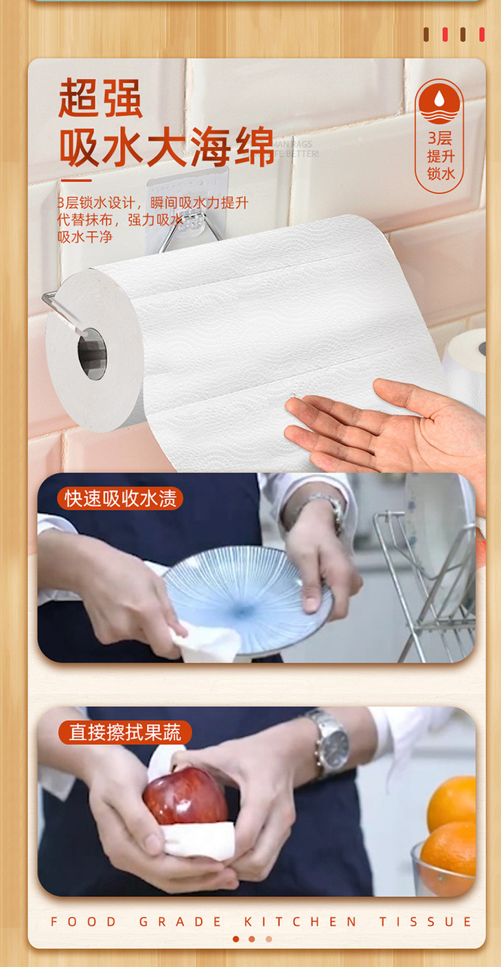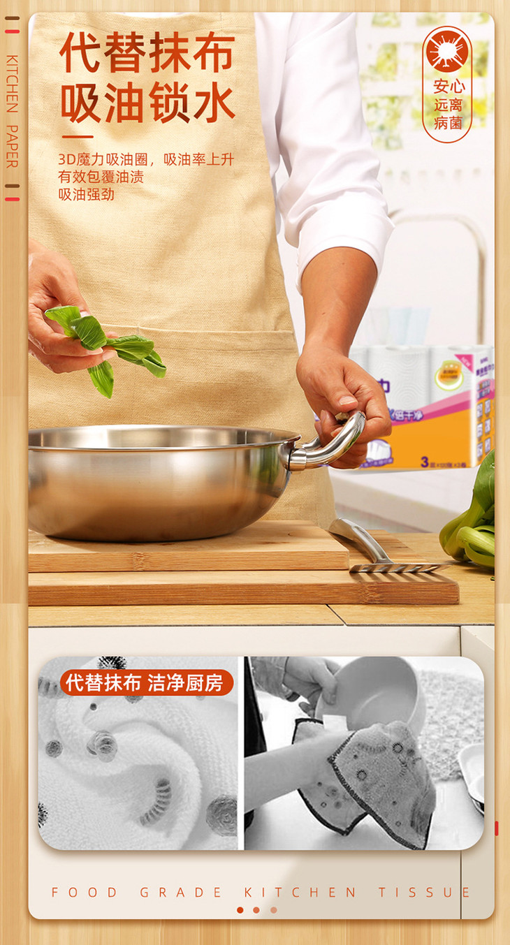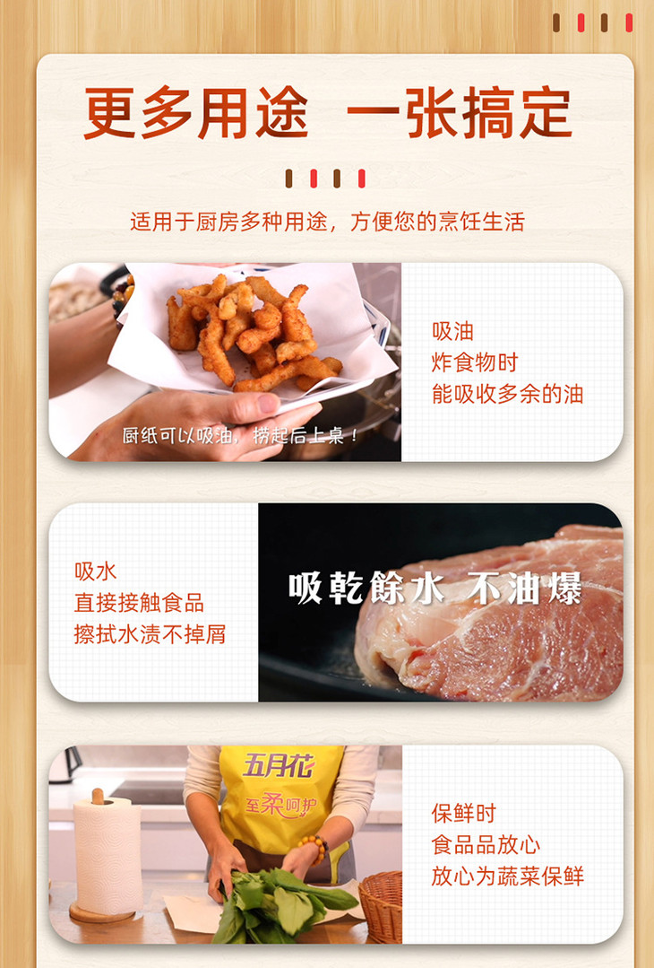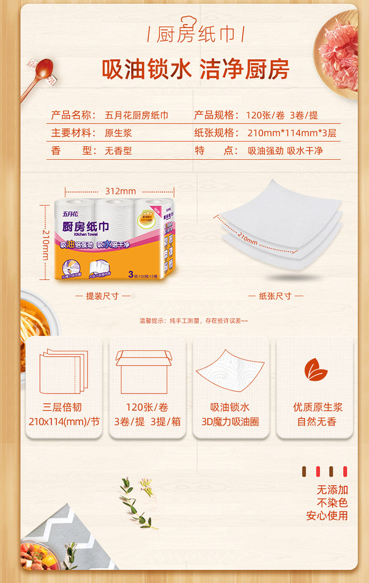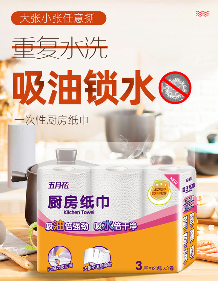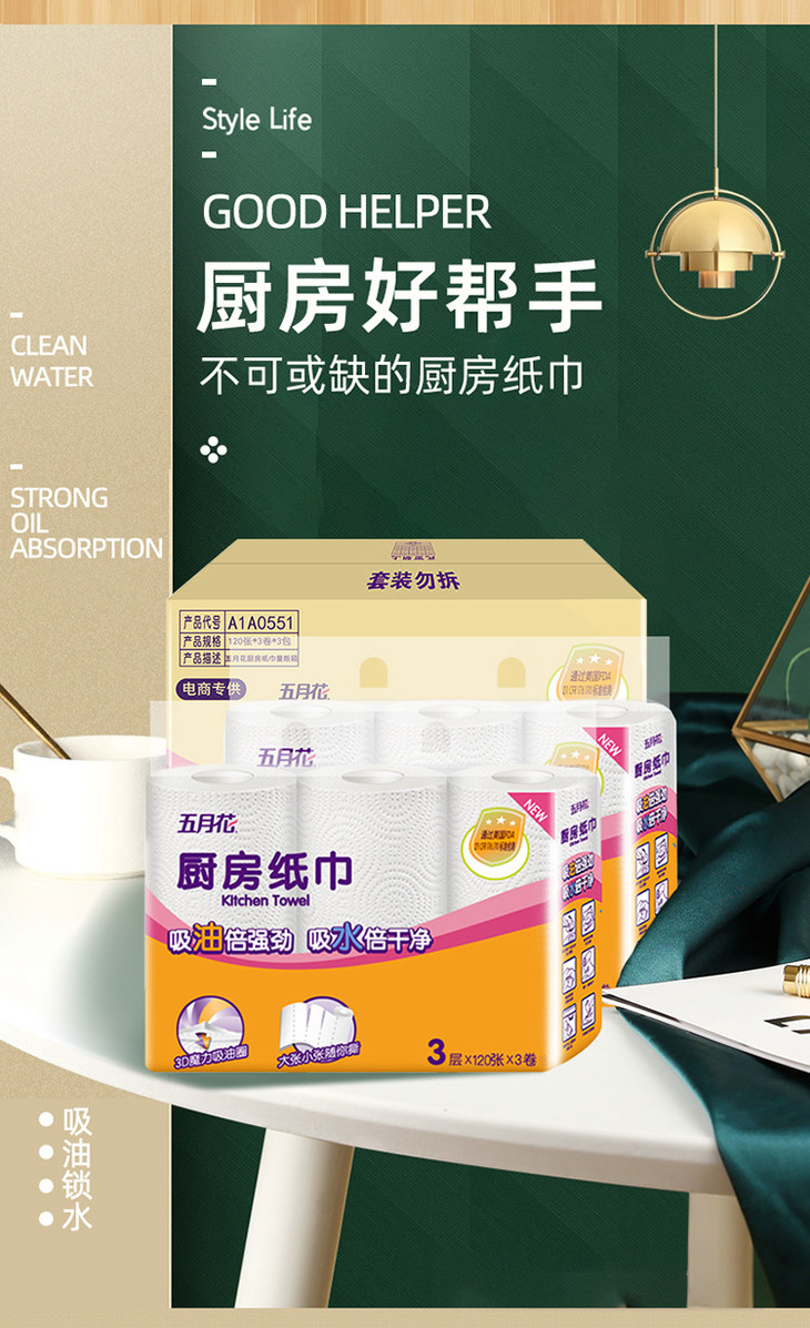 五月花厨房纸巾丨加厚吸油吸水卷纸擦手纸3层120节*3卷