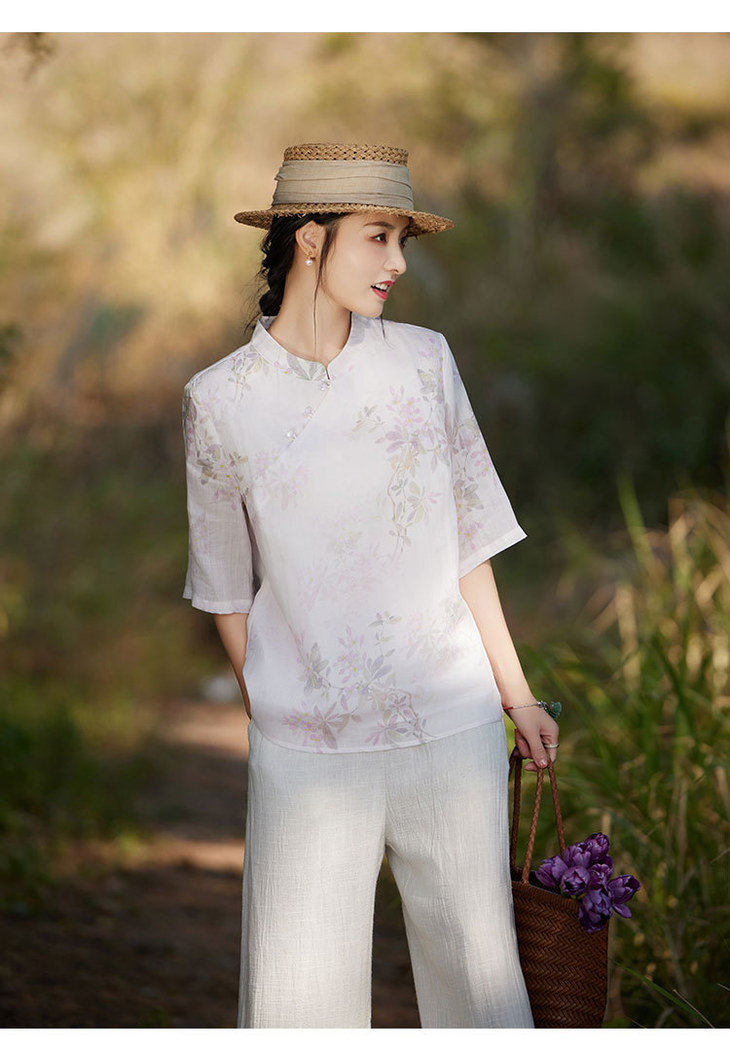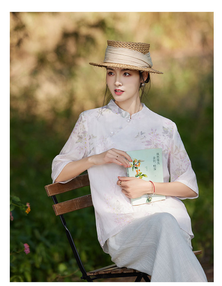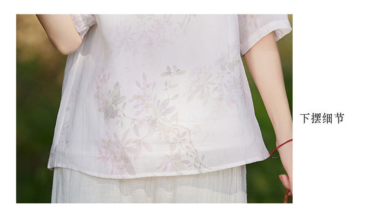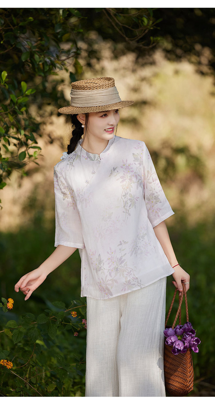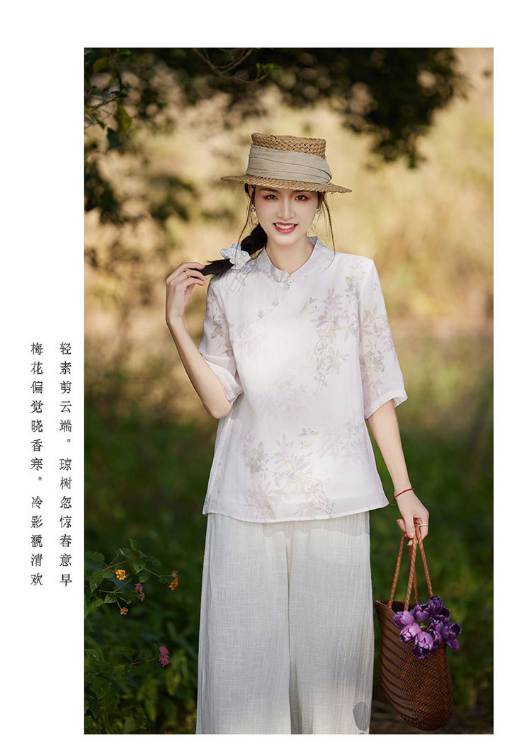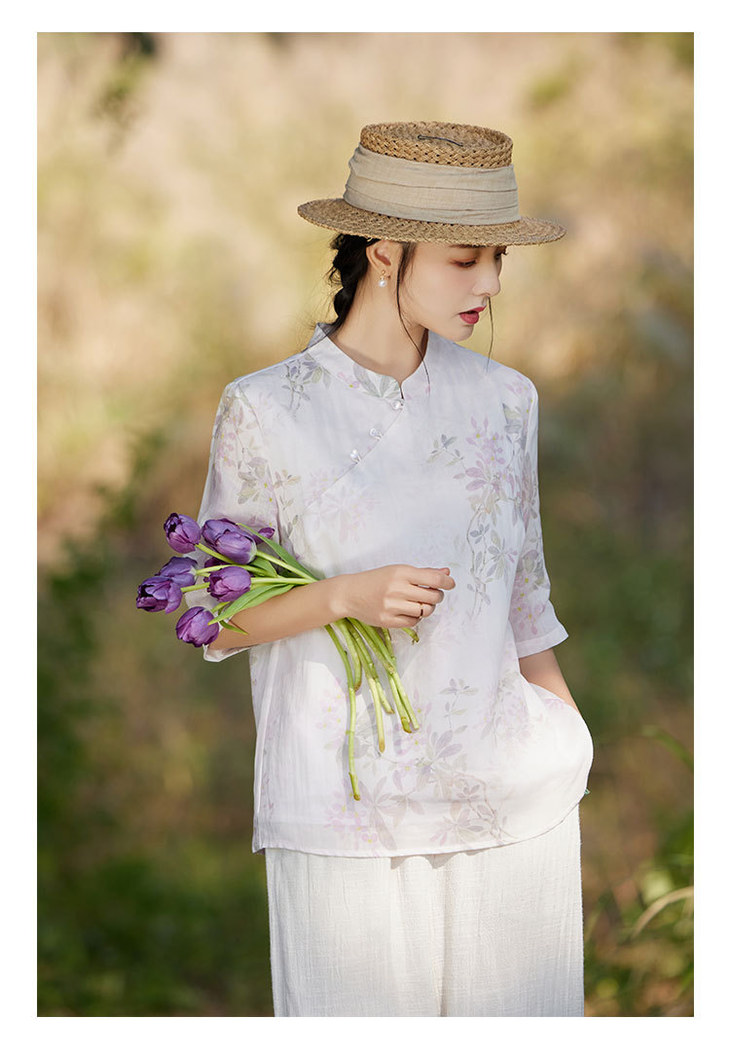 中国风复古小众独特设计立领盘扣,新中式衬衫苎麻印花宽松上衣TT-96311