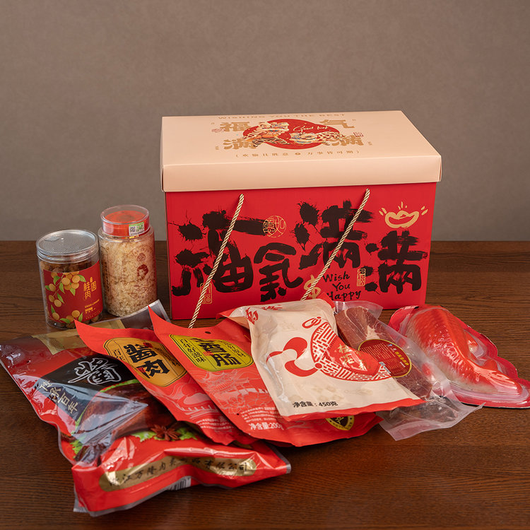 土香肠(非遗) 200克金华火腿自然块(非遗) 250克锦鲤八宝饭(老字号) 350克古田有机本草银耳(国家地理标志产品) 80克高州老树桂圆肉(国家地理标志产品) 200克