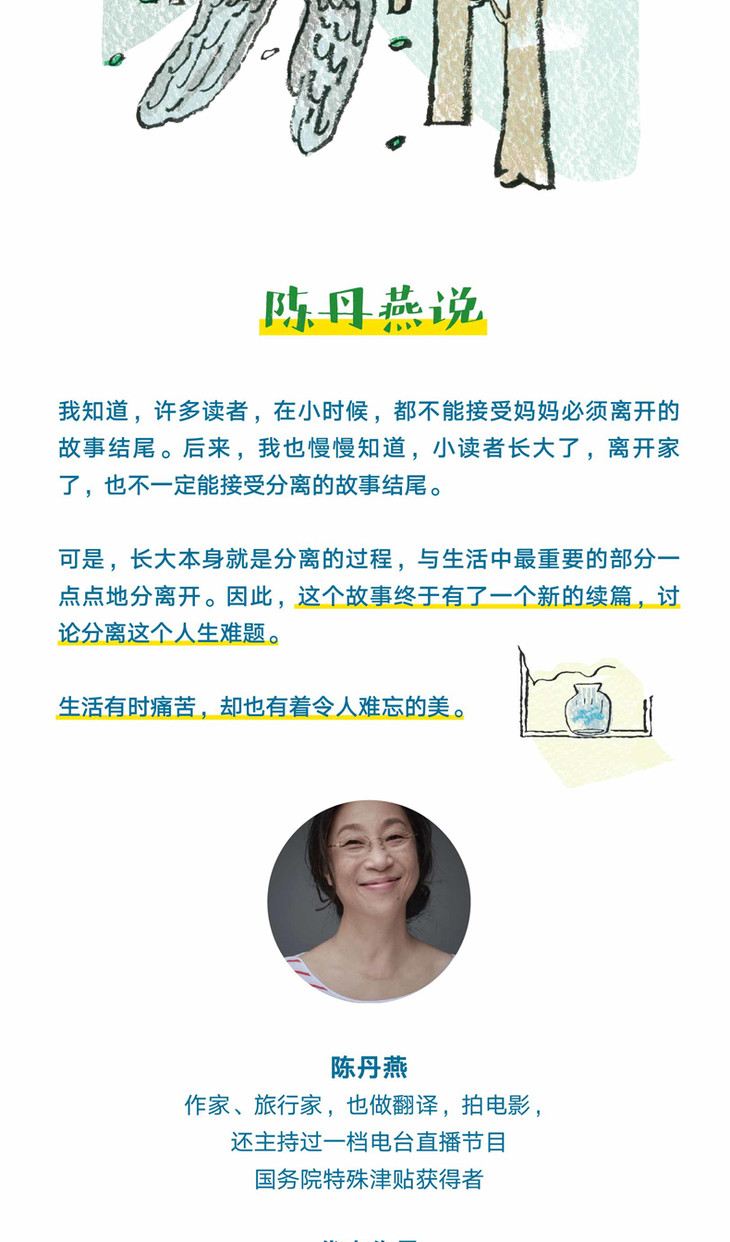 l 一部为孩子拭去泪水、心灵变得坚强的感动之作:“世上没有什么事情,是真正一去就不复返的。”重拾精灵妈妈离开时的悲伤,直面分离这个绕不过去的人生难题——分离,是为了在更美丽的别处重逢;分离,也可以面带彼此祝福的微笑。