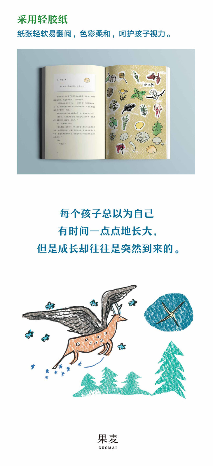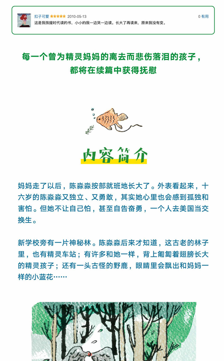 新学校旁有一片神秘林。陈淼淼后来才知道,这古老的林子里,也有精灵车站;有许多和她一样,背上匍匐着翅膀长大的精灵孩子;还有一头古怪的野鹿,眼睛里会飘出和妈妈一样的小蓝花……