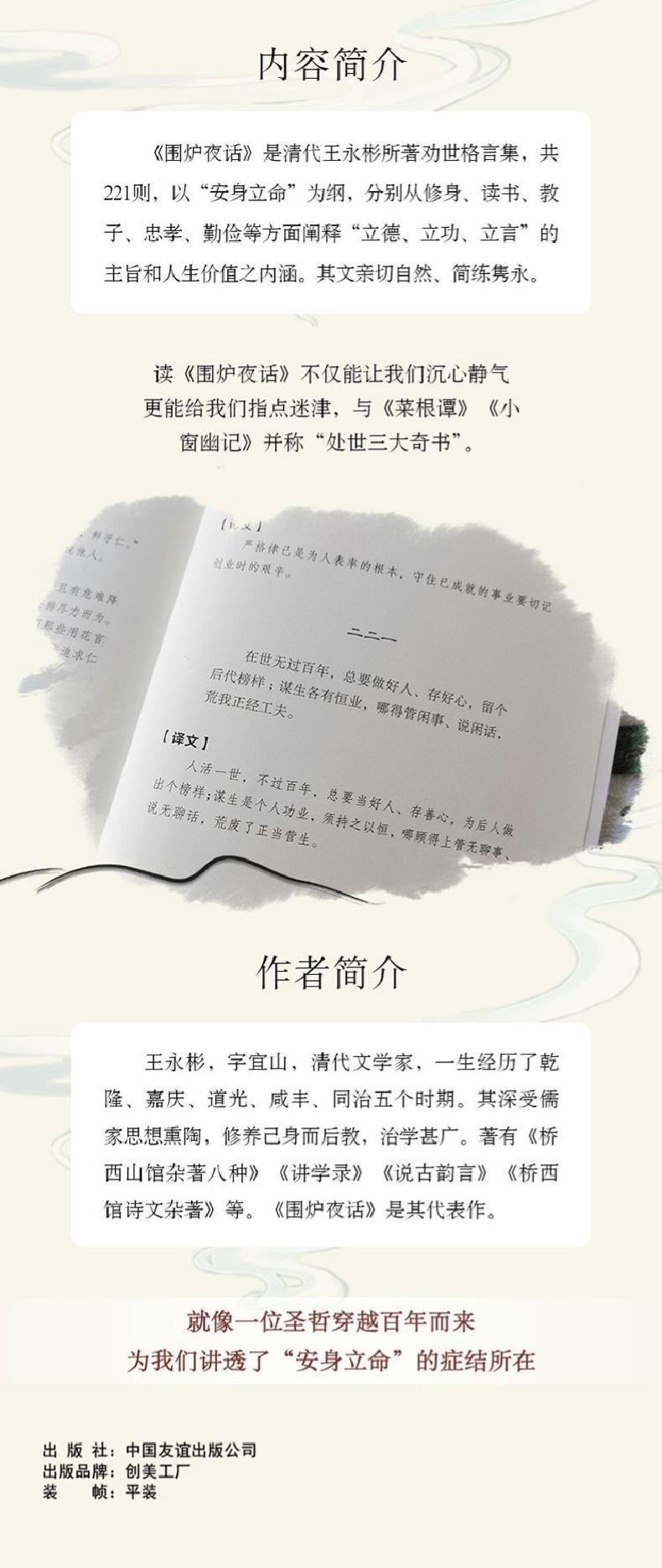 《围炉夜话》是清代王永彬所著劝世格言集,共221则,以“安身立命”为纲,分别从修身、读书、教子、忠孝、勤俭等方面阐释“立德、立功、立言”的主旨和人生价值之内涵。其文亲切自然、简练隽永。