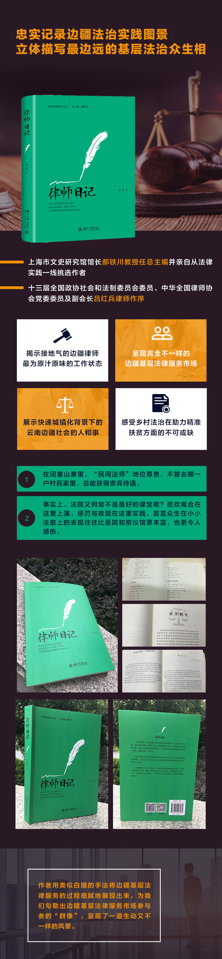 本书以西部少数民族聚居区M县为研究范本,在4年时间内,作者以律师身份参与了该地区诉讼、调解等多种形式的司法实践活动。本书试图通过日记的形式有机多维地呈现西部落后地区诉讼个案全貌和具体法律情境下人、事之间的真实关联,真实还原西部少数民族聚居区较为突出的农民工、离婚、故意伤害、走私等民事、行政、刑事案件的来龙去脉,捕捉包括公检法等国家司法机关、律师群体以及人民群众在基层治理法治化中的镜像。