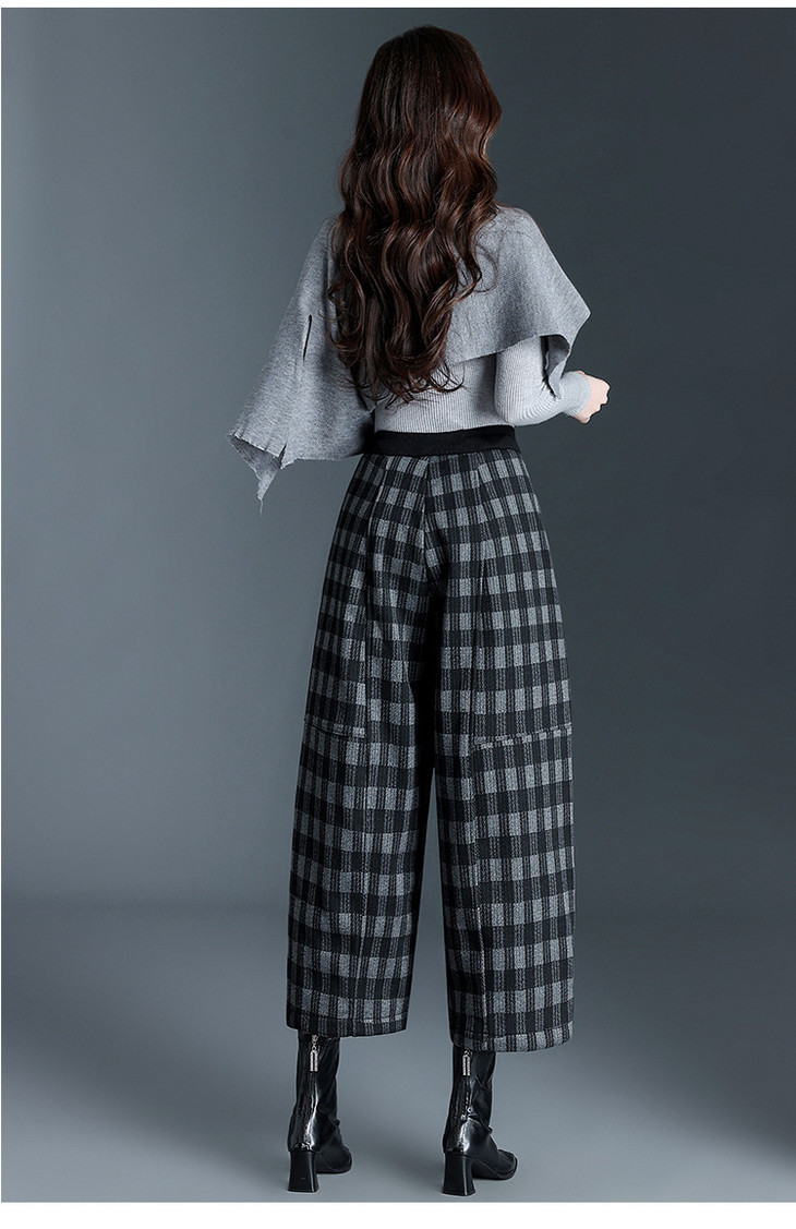 冬款松紧腰格纹加绒弯刀裤遮胯宽松休闲八分裤QYM25886