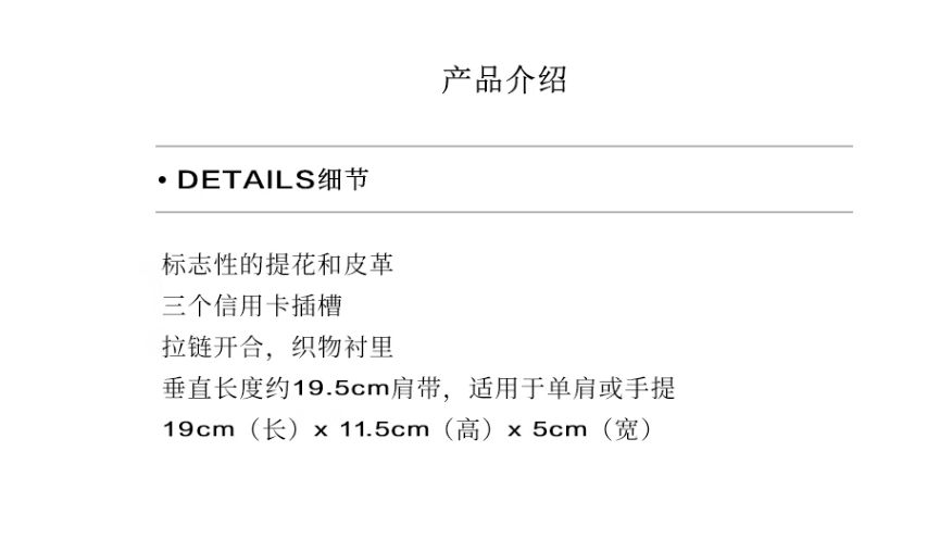 【尺寸】:19*11.5*5cm,短肩带:19.5cm,长肩带:96cm(可调节)