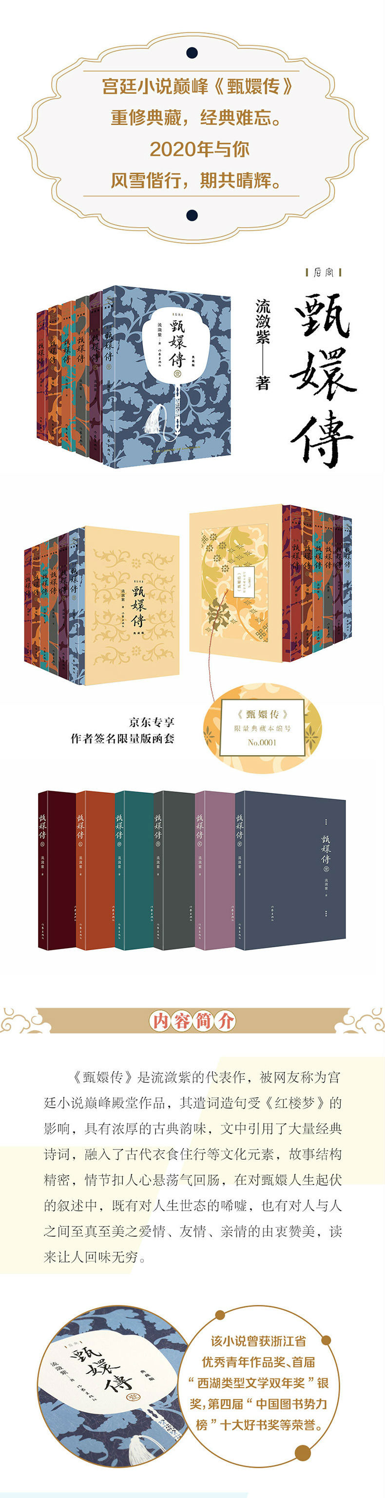 《后宫·甄嬛传》曾获浙江省优秀青年作品奖、首届“西湖类型文学双年奖”银奖,第四届“中国图书势力榜”十大好书奖等荣誉。其编剧作品电视剧《甄嬛传》获得第3届金榕树电视作品佳剧本奖,第26届中国电视金鹰奖优秀电视剧奖,澳门第三届国际电视节佳电视剧奖,第2届搜狐电视剧盛典佳电视剧等。该剧一经播出便以良好的口碑和收视率席卷荧屏,作为一个文化现象为社会各界所研究,并衍生出漫画、游戏、越剧等多种类型的文化艺术形式,电视剧输出港澳台地区及美国、日本、韩国、东南亚等国播出,影响广泛而深远。
