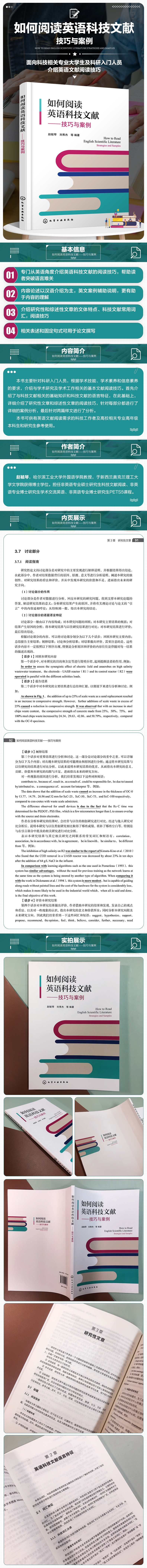 本书的特点,第一,重在规律、一应百通。帮助读者掌握科技文献的普遍规律和阅读方法,实现“掌握规律,一应百通”。第二,注重应用、学以致用。帮助读者将阅读方法应用于自己专业文章的阅读,从而完成从“学懂”到“会用”的转化,最终能够融会贯通,学以致用。