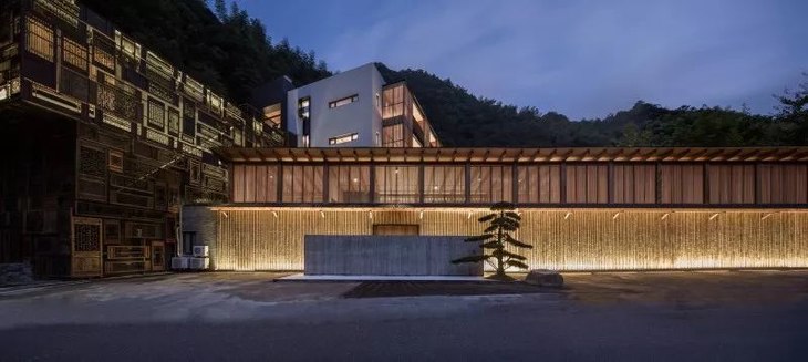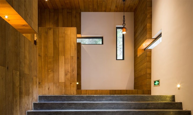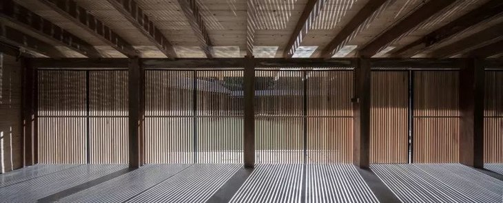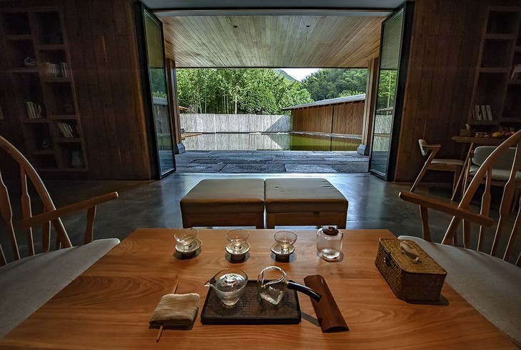 在水镜的一侧,有一处茶室。面向山谷溪流,哗哗的水流声不绝于耳。茶室的木质百叶窗,是最让人心动的设计。一天不同时刻的日光,投射进茶室都是一幅动态的光影画,静谧而美好。