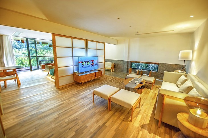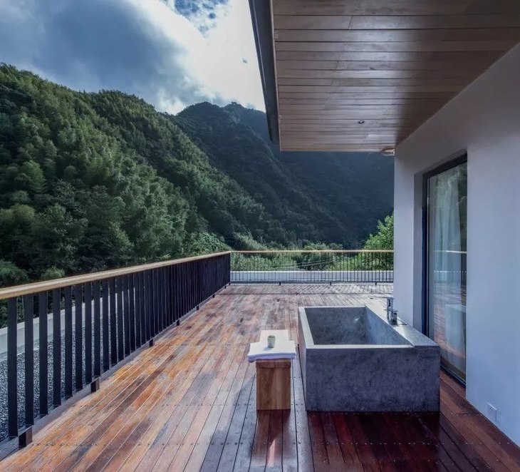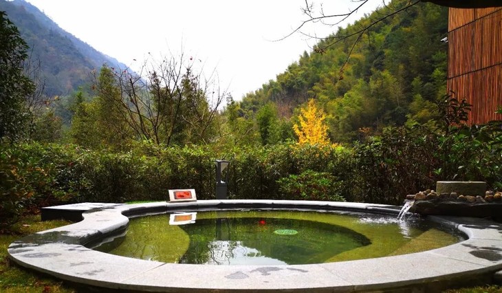 除了每个房间内配置的浴池外,鱼乐山房还有露天景观山泉 SPA泡池。如果饱餐后还没有睡意,不如约小伙伴们一起,泡在院落自然拥抱的露天温泉里。