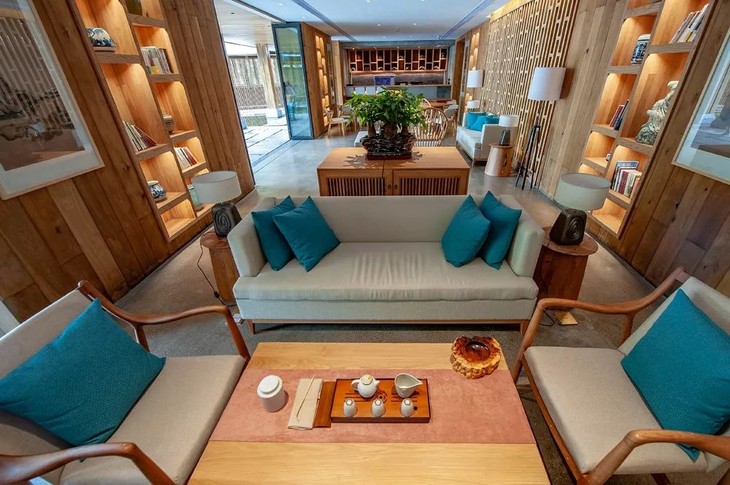 兼具茶室和休息室的公区,软装的桌椅沙发也颇为讲究。既舒适又有设计的质感,又很好地体现了鱼乐山房简约舒适的气质。