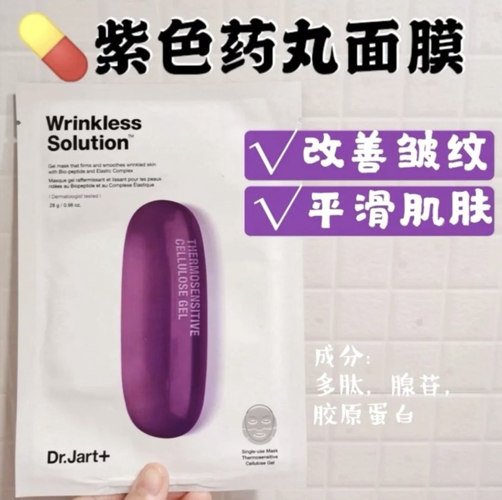 Dr.Jart+ 紫色药丸抗皱面膜👍成分选用高山山泉水,补水效果不容小觑!主打提拉紧致💜,改善松弛提升弹性,修复皱纹细纹,使肌肤恢复平滑细腻、光泽透亮。面膜采用上下分体式设计⬆⬇,能够更好地贴合脸部,做到角角落落都能敷到。水凝胶的面膜材质💦,有效防止精华的蒸发,紧致肌肤,为松弛肌肤赋予弹性。