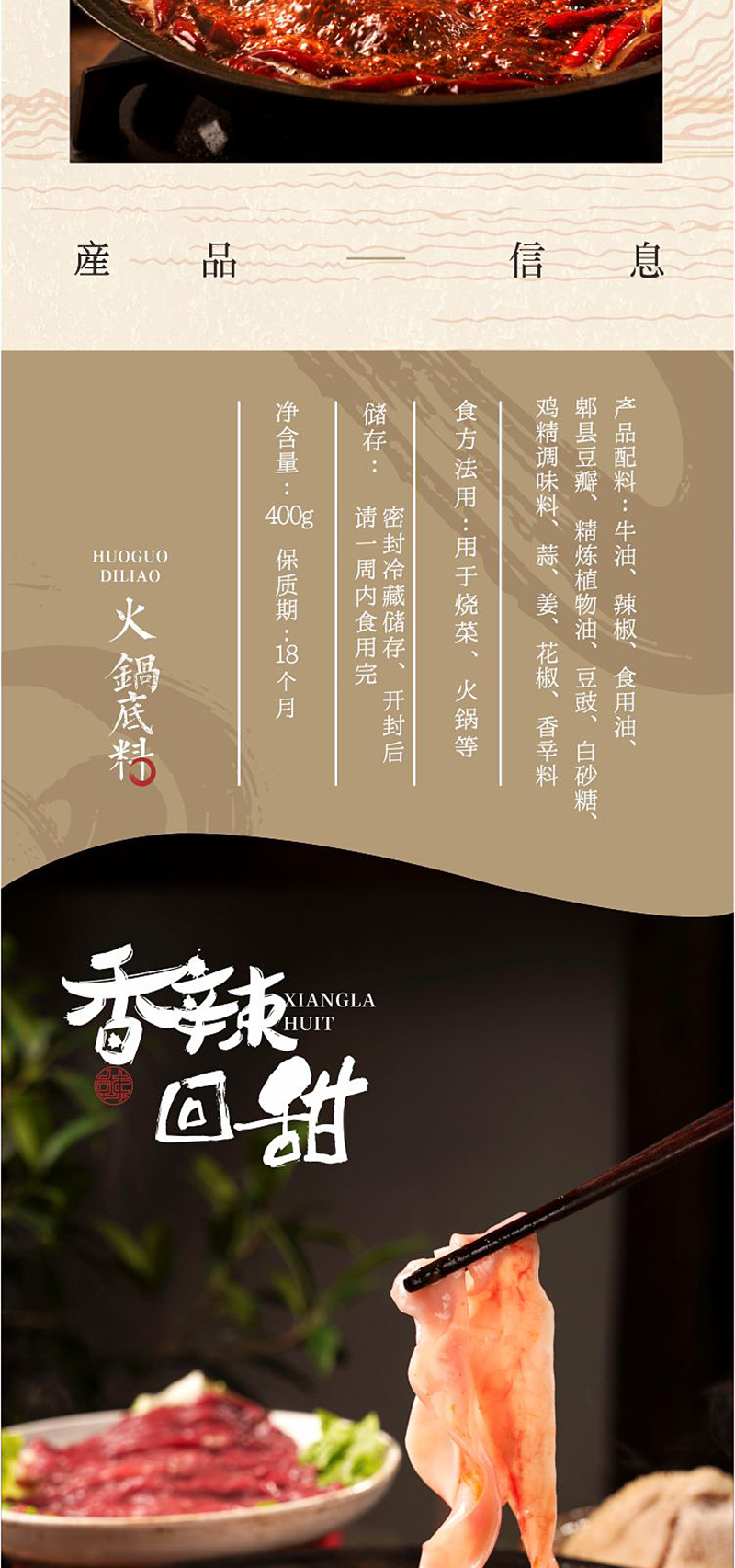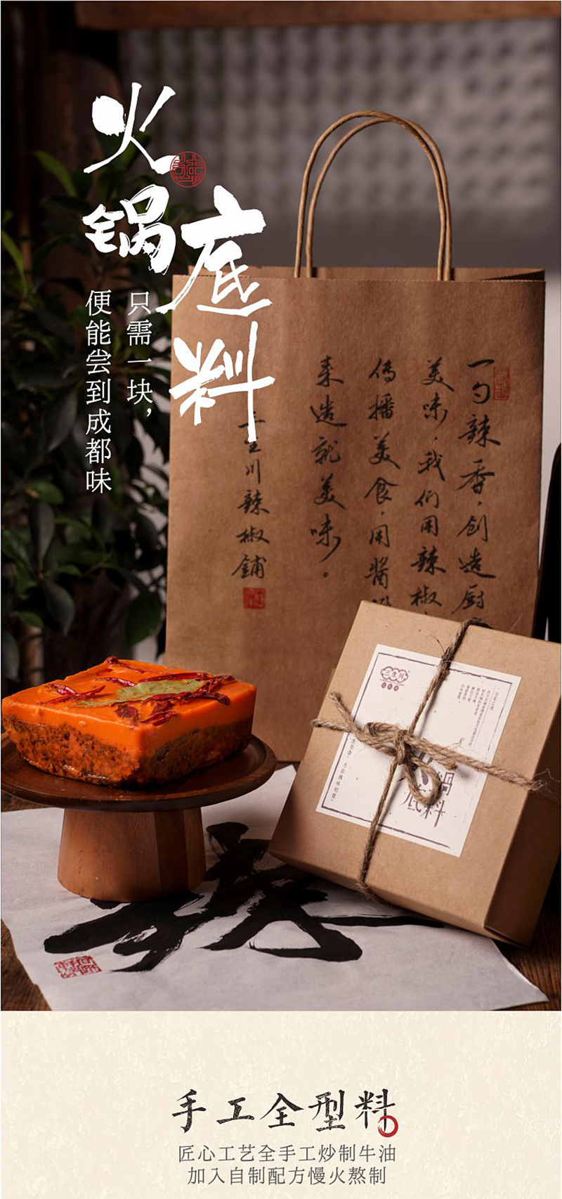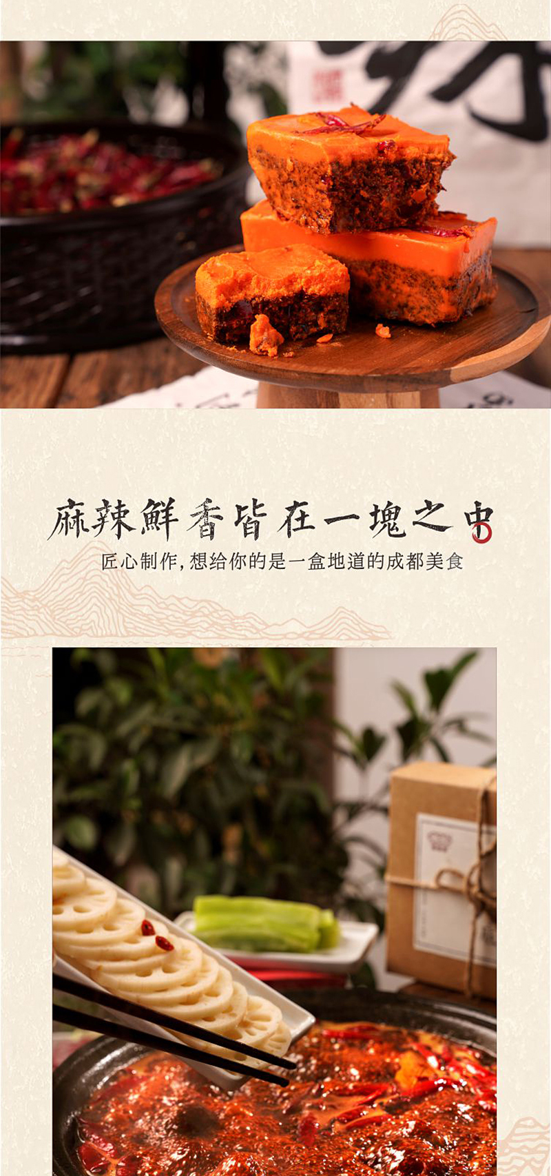 【产品规格】火锅底料400g*1盒装,小粒装80g*4块(每箱都是独立的包装,如购买多件分多个包裹发出,可能会前后陆续到货)。