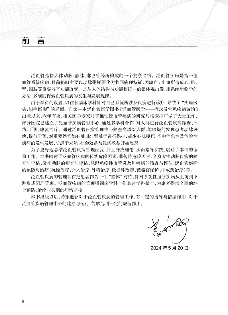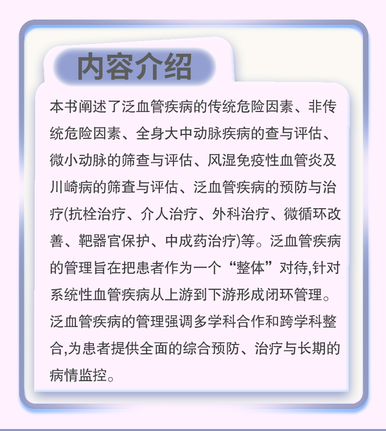 21世纪初国内外学者对心、脑、肾及周围血管等器官疾病的诊治潜趋共识,从血管性疾病的系统性、整体性考虑,提出了泛血管疾病的概念。这本书从系统生物学整体观,以动脉粥样硬化的血管病变及受累靶器官的影响为主线,来认识、理解、探讨他们之间的共性与个性及其相互关联与转归,从而在疾病不同阶段针对不同个体、人群及其所处内外因素等,找出不同层面系统中如何进行"重构与稳态"这一动态平衡过程的关键,制订个体化诊治方案。 本书主要分为6章,即泛血管疾病的防治现状,包括定义及流行病学、诊治现状;泛血管疾病的危险因素,包括传统危险因素(高血压、高血糖、高血脂、吸烟等)和非传统危险因素;泛血管疾病的筛查,包括筛查流程、筛查项目、危险因素评估;泛血管疾病的评估,涉及代谢性疾病、心血管疾病、脑血管疾病、外周血管疾病、肾血管疾病、风湿免疫性血管炎的评估;泛血管疾病的规范化治疗,包括危险因素控制(血脂、血压、血糖)、抗栓治疗(抗凝和抗血小板)、介入治疗、微循环改善和靶器官保护(靶器官保护药物及中成药);泛血管疾病的全程管理,如科普、预防、筛查、康复、后期随访、展望。