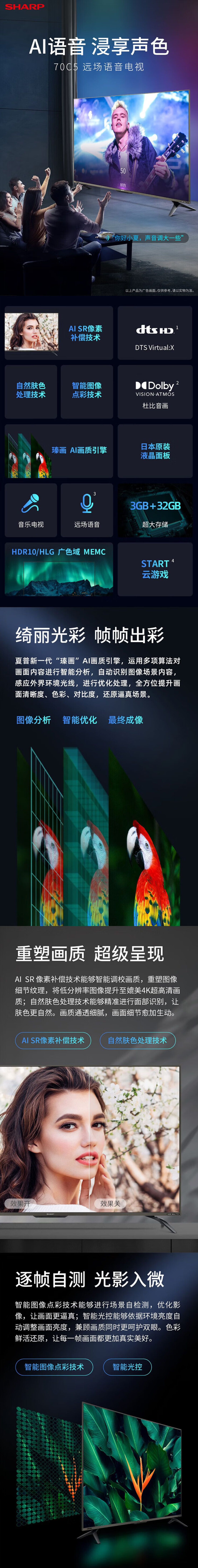 SHARP夏普(13413)70英寸 4K超高清 智能网络平板液晶电视机 70英寸 70D6UA 煌彩技术全面屏展示机