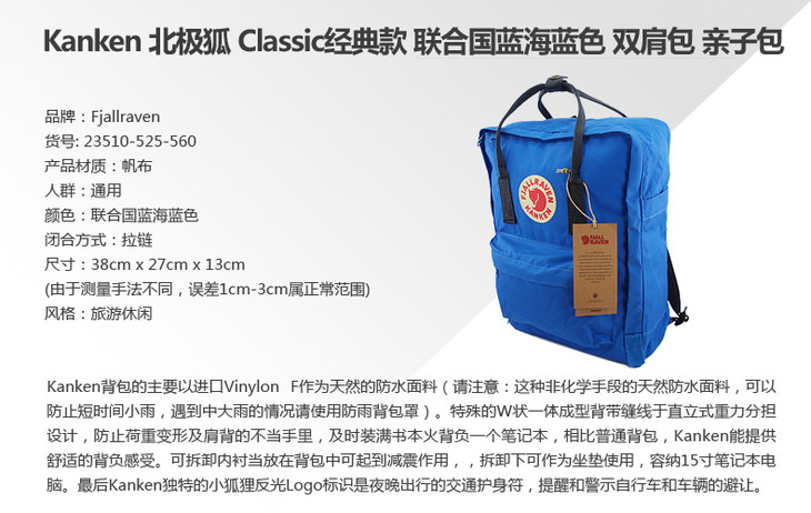 Fjallraven Kanken 北极狐 Classic经典款 联合国蓝海蓝色 双肩包 亲子包 23510-525-560JPY带授权招加盟代理