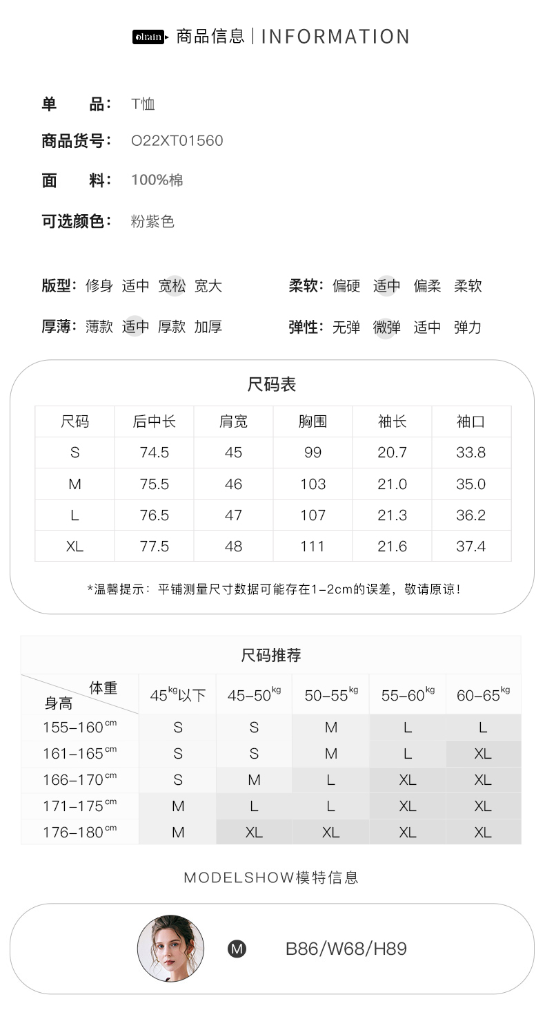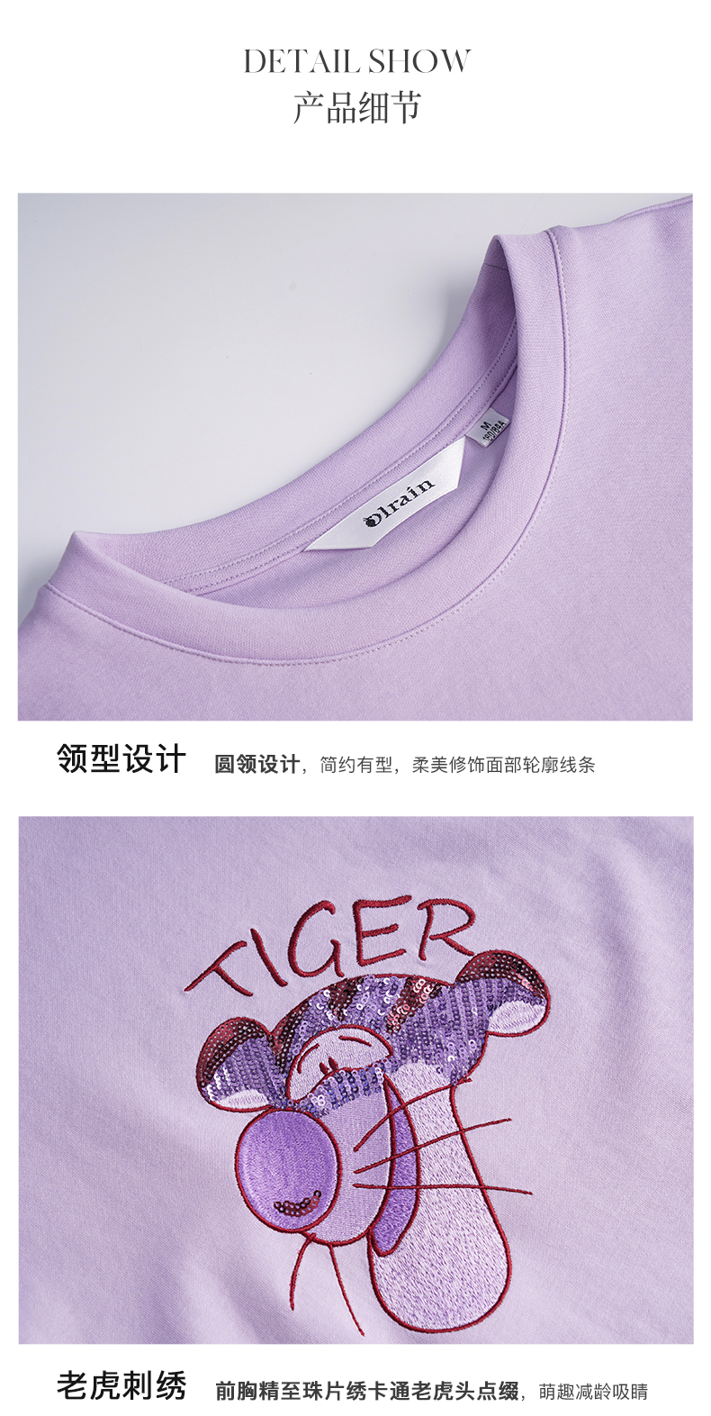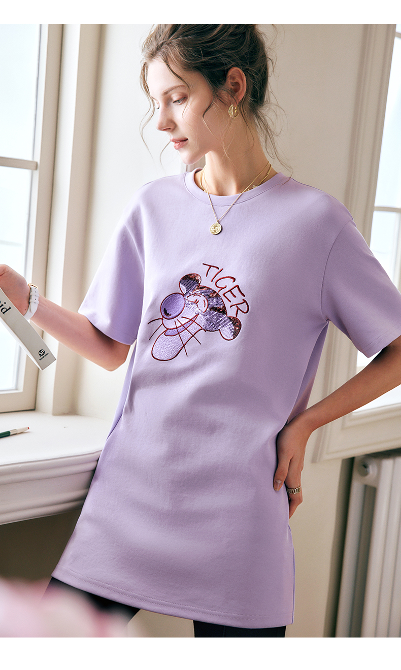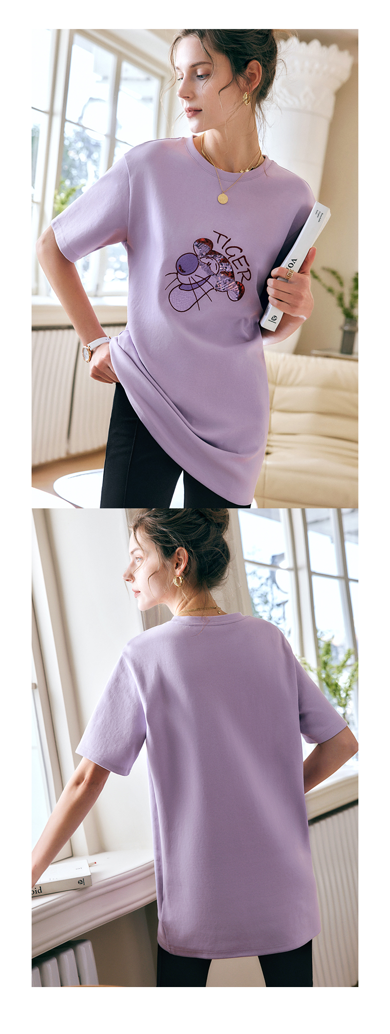 欧芮儿OLrain法式短袖t恤女夏季2022新款宽松刺绣紫色中长上衣
