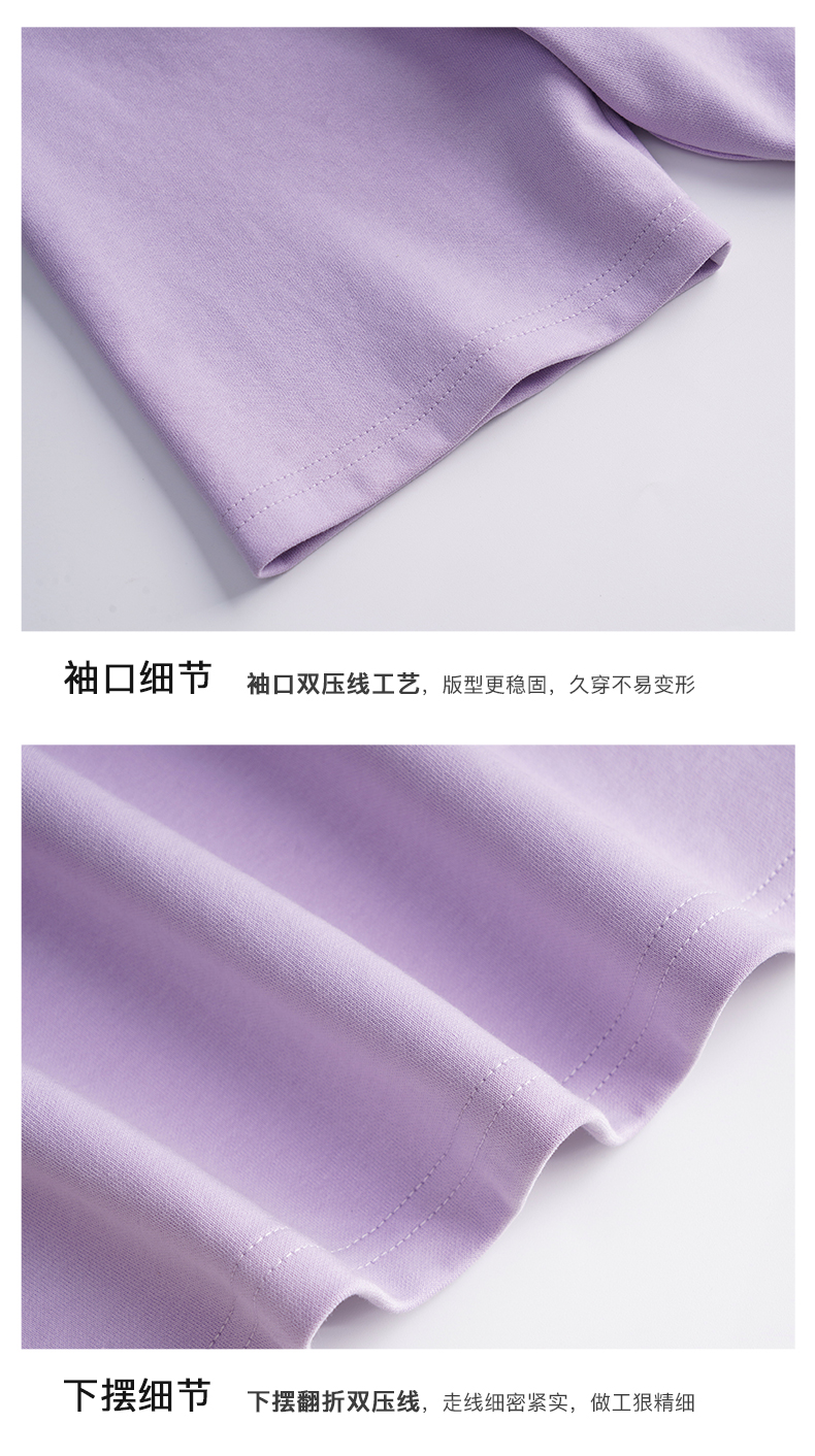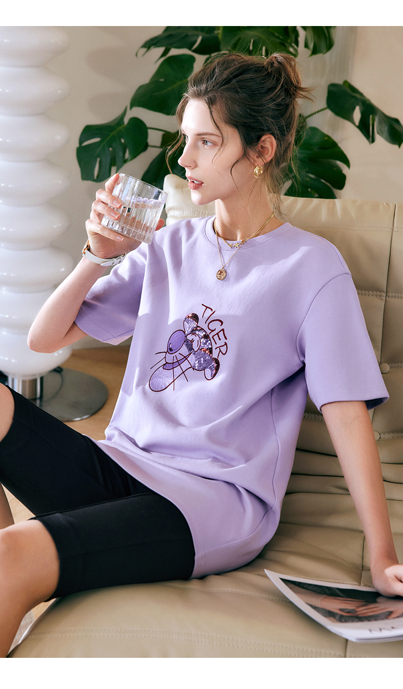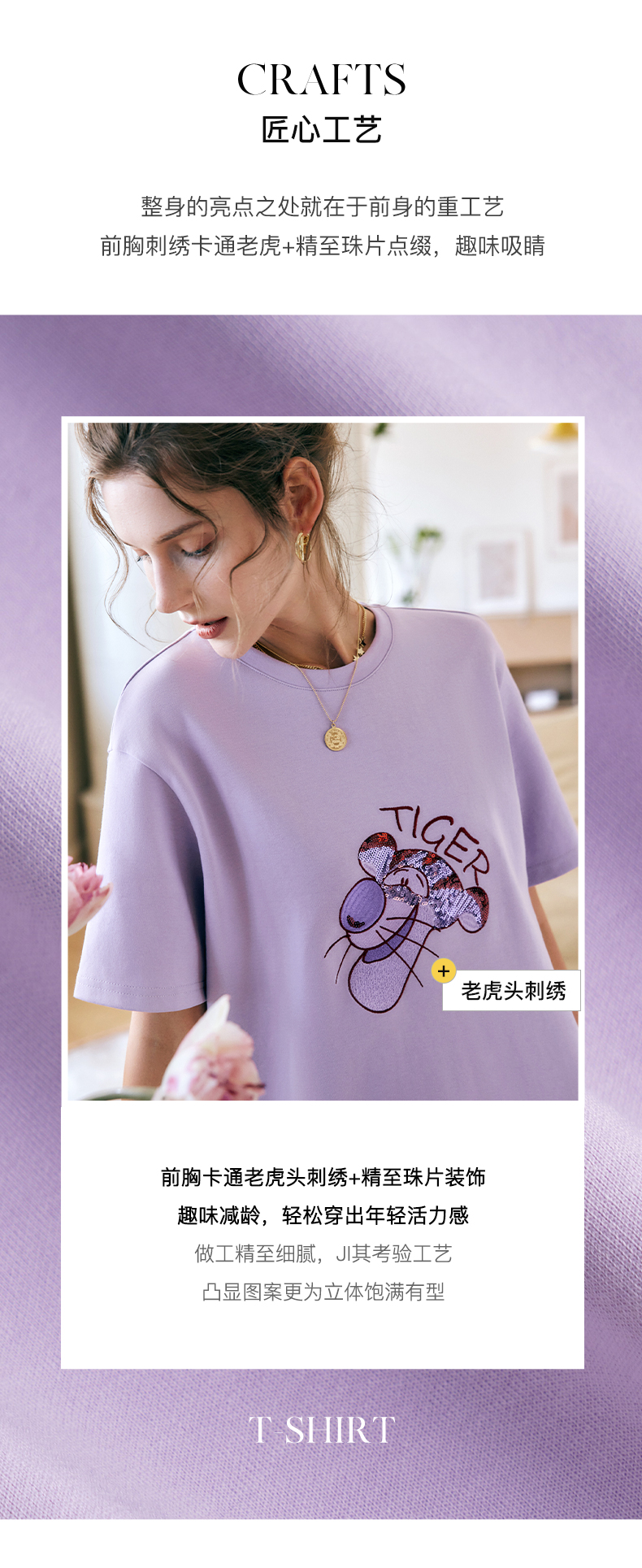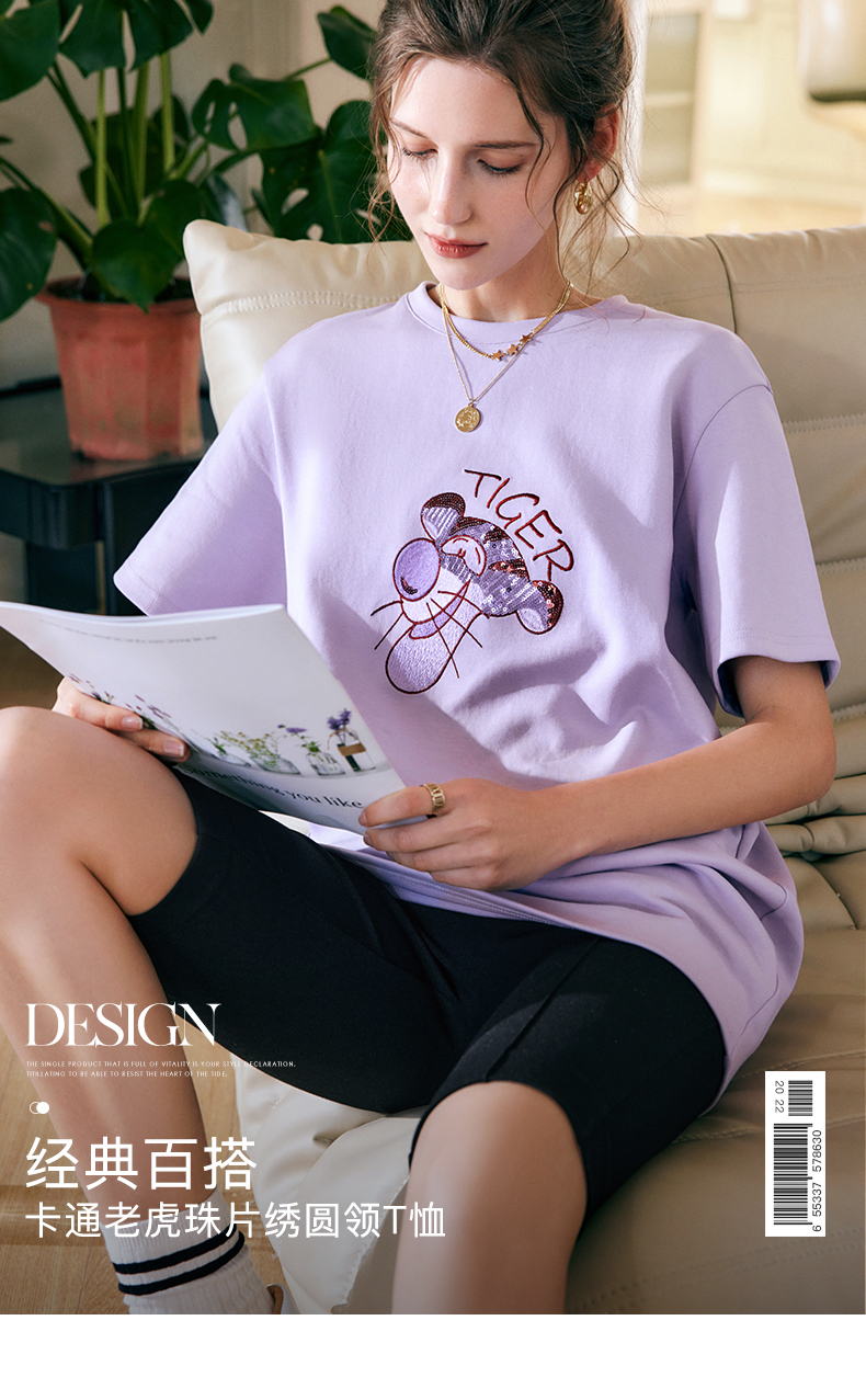 欧芮儿OLrain法式短袖t恤女夏季2022新款宽松刺绣紫色中长上衣