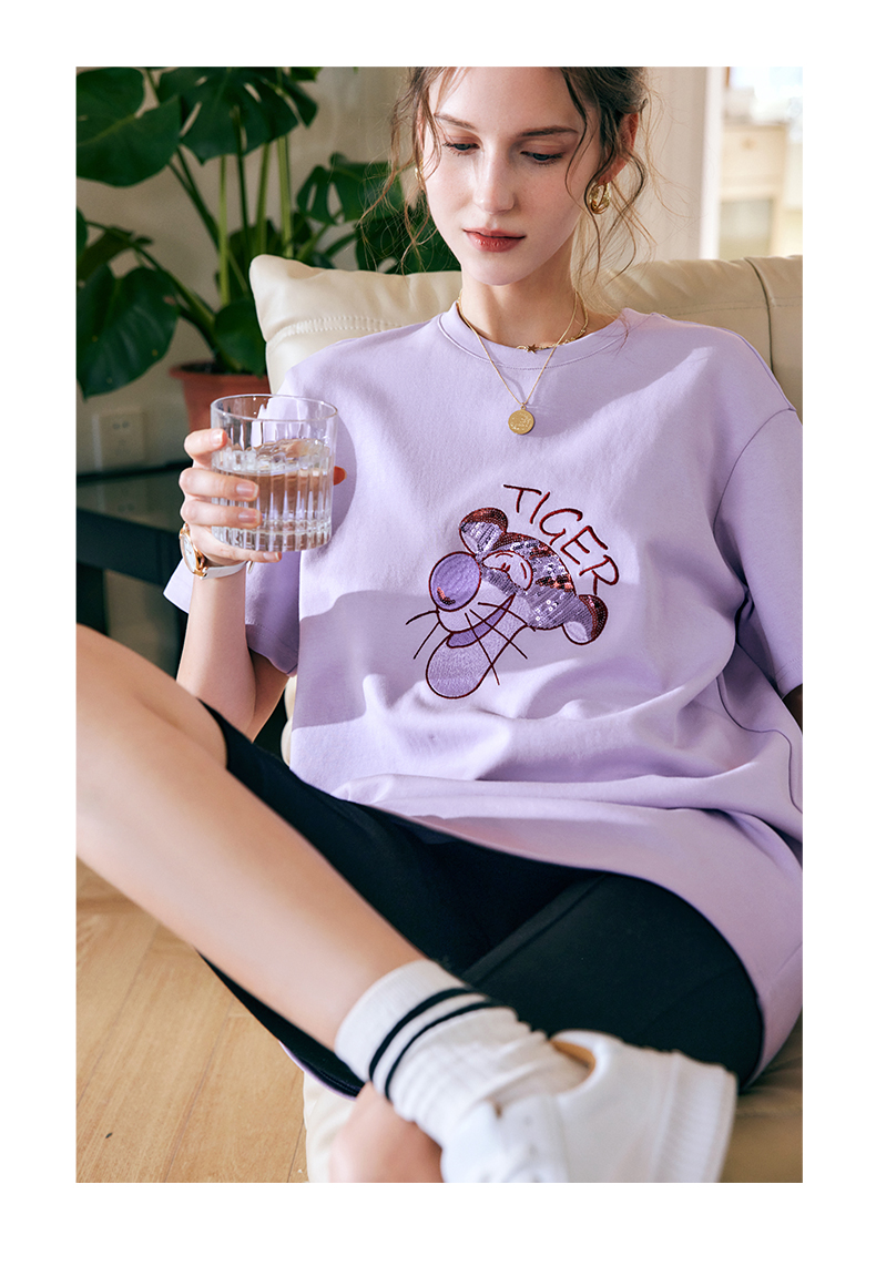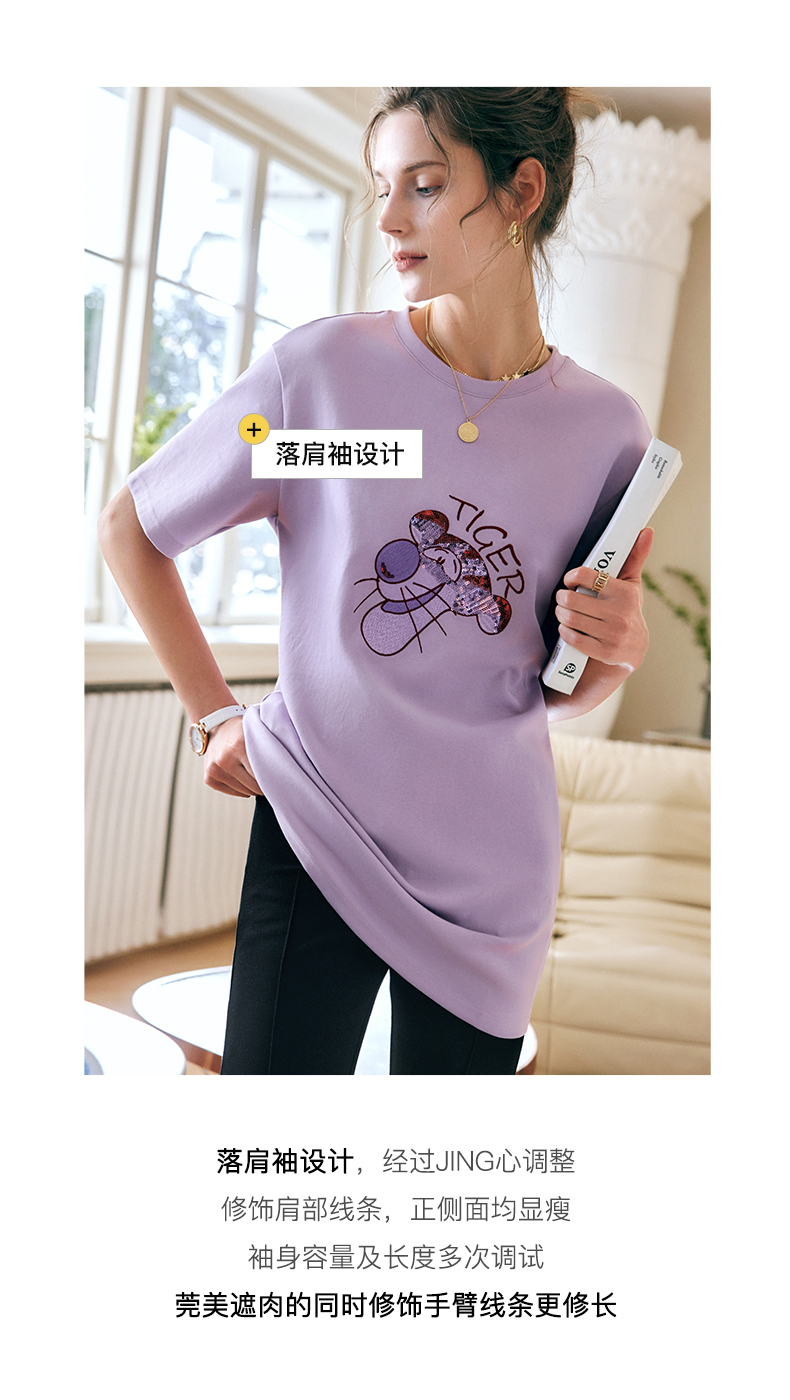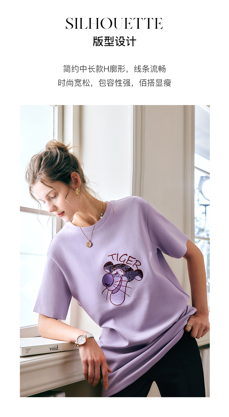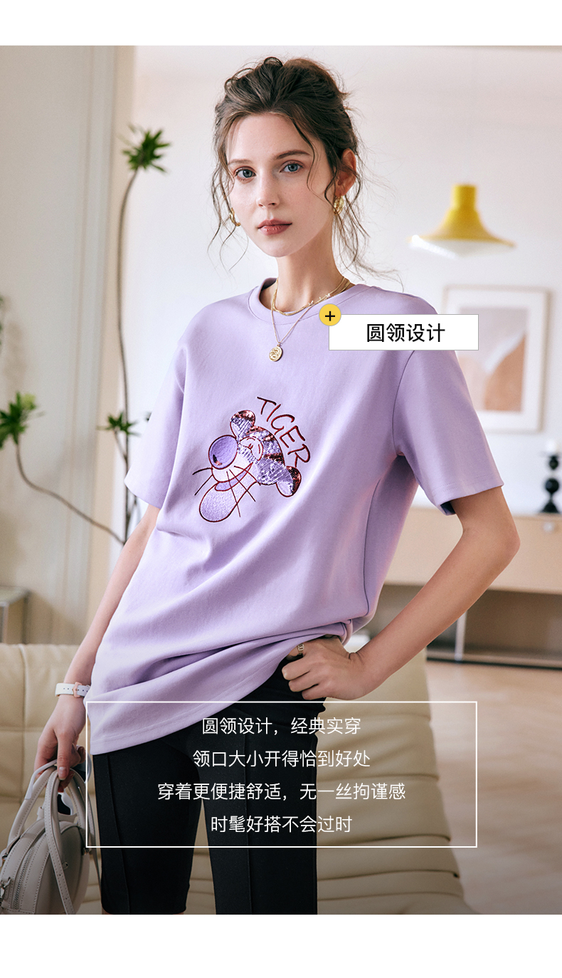 欧芮儿OLrain法式短袖t恤女夏季2022新款宽松刺绣紫色中长上衣