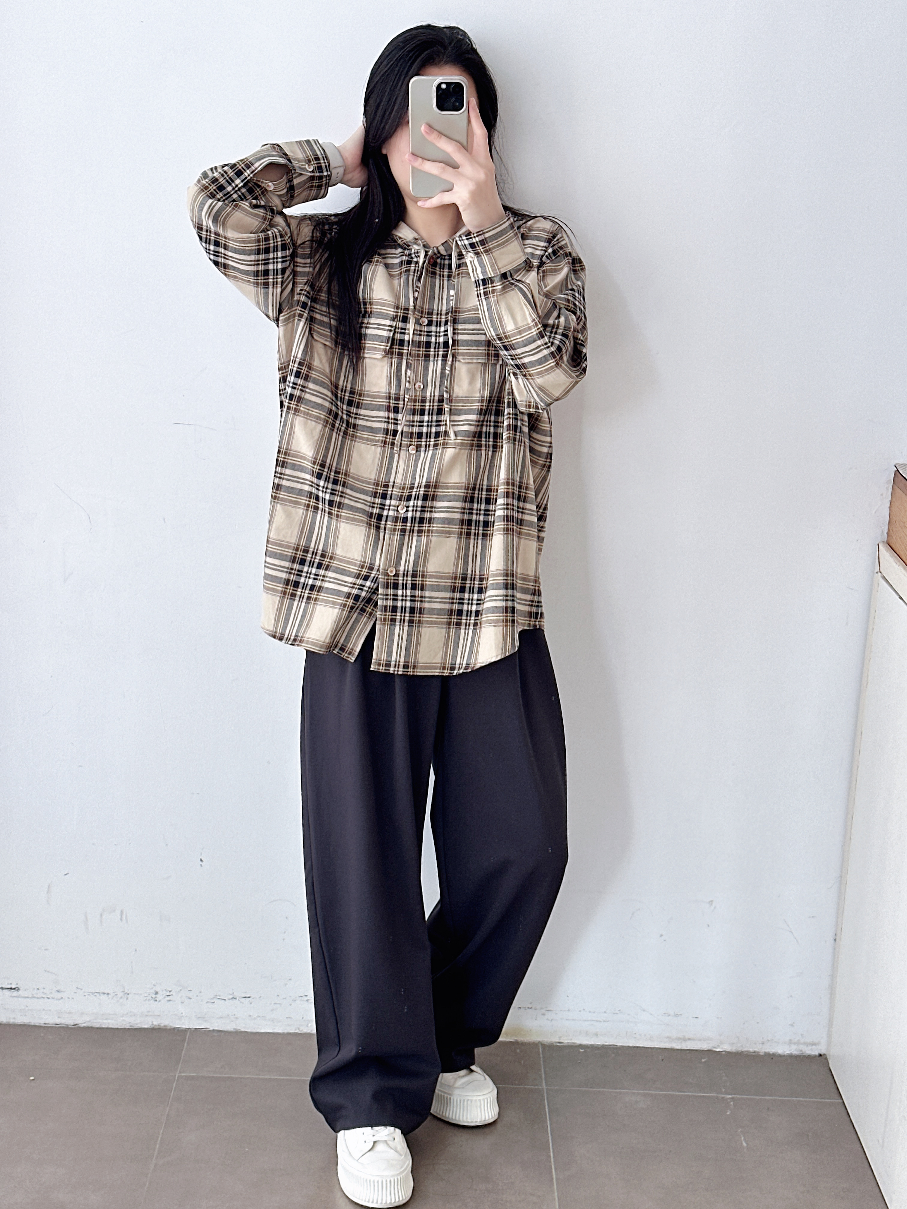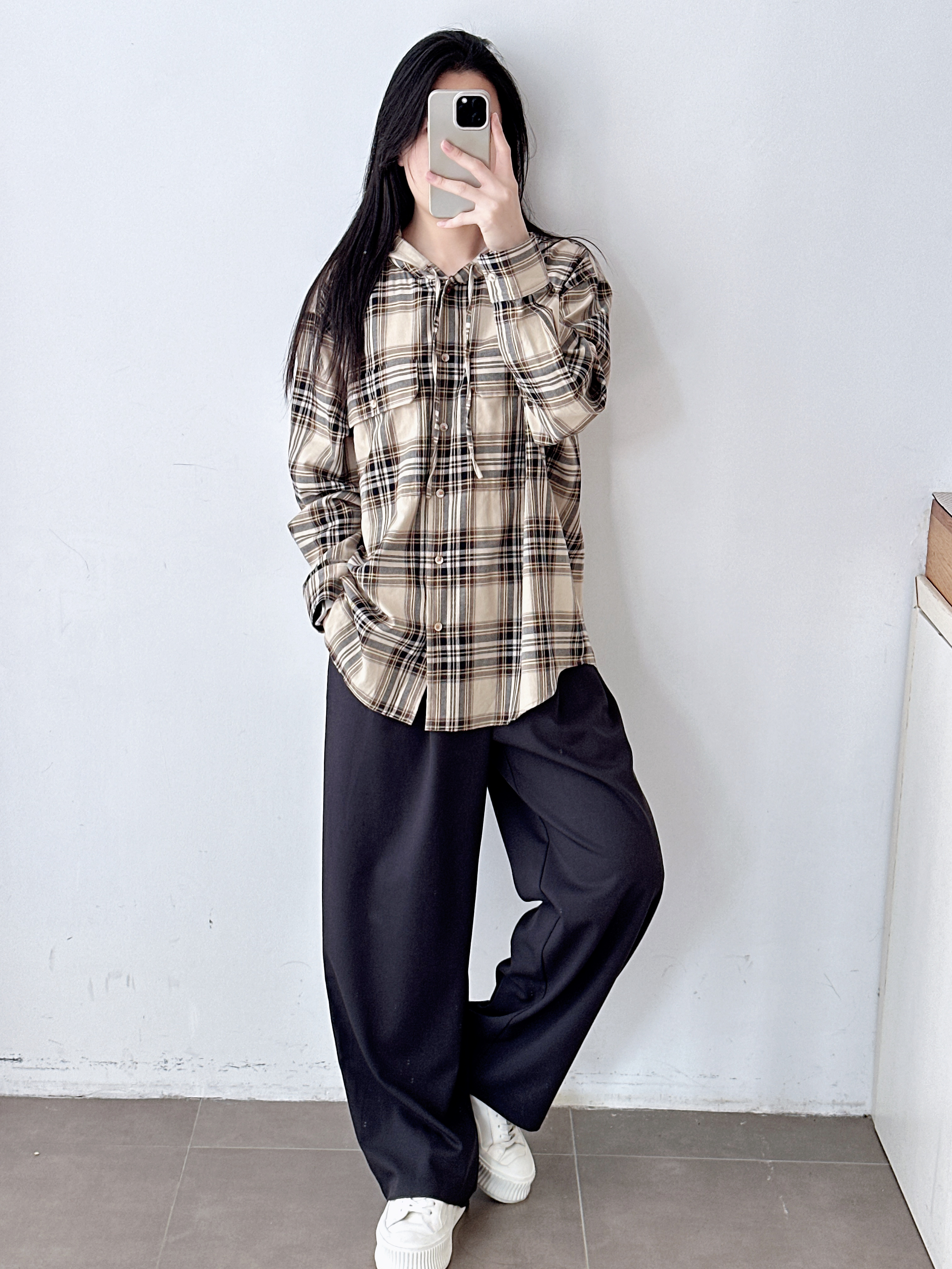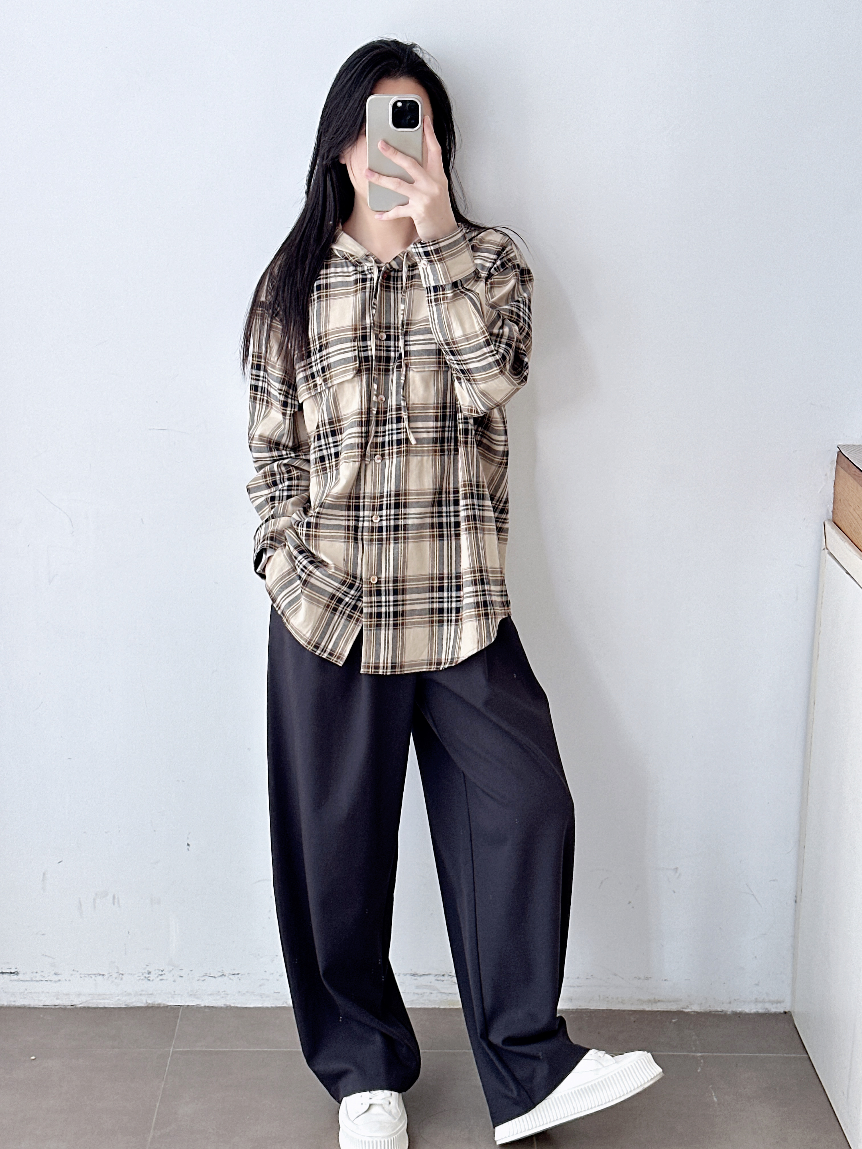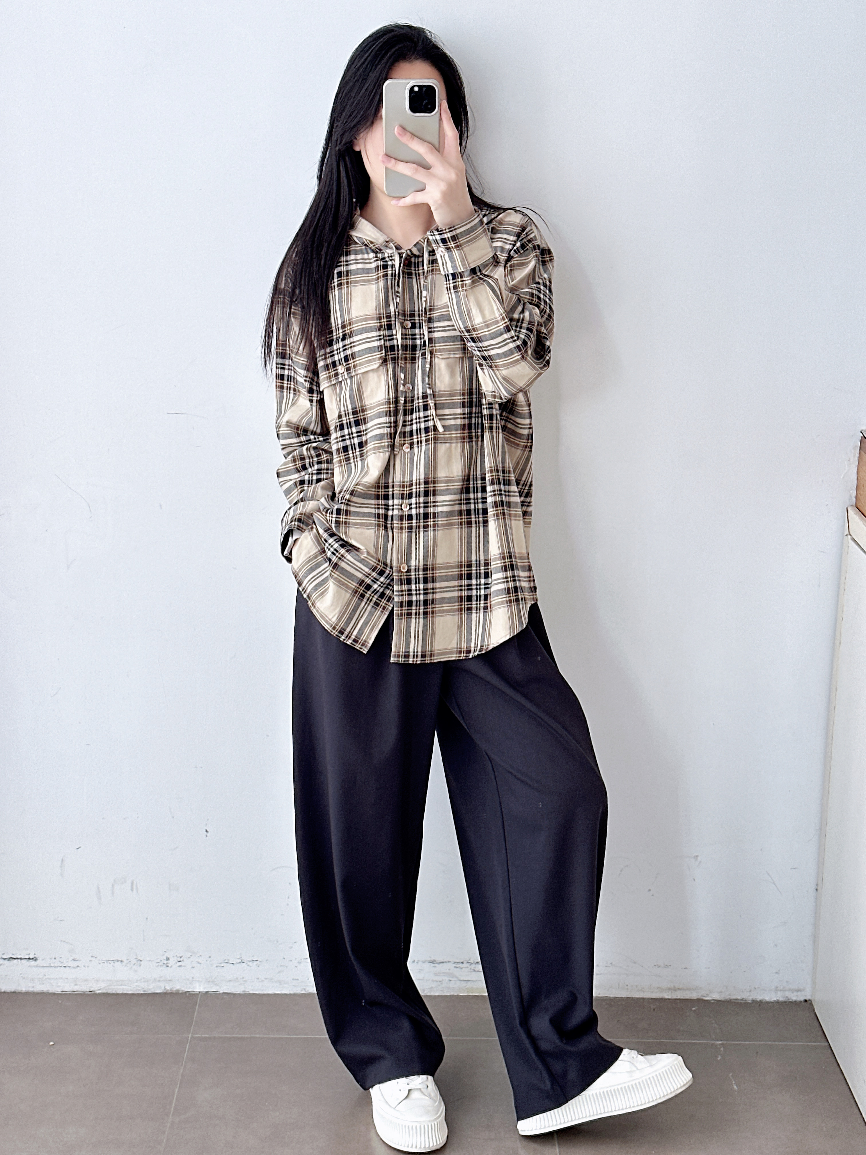 复古撞色格纹连帽长袖衬衫女25新款宽松休闲百搭中长款衬衣