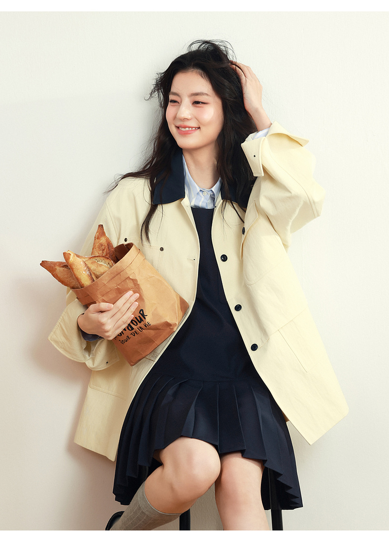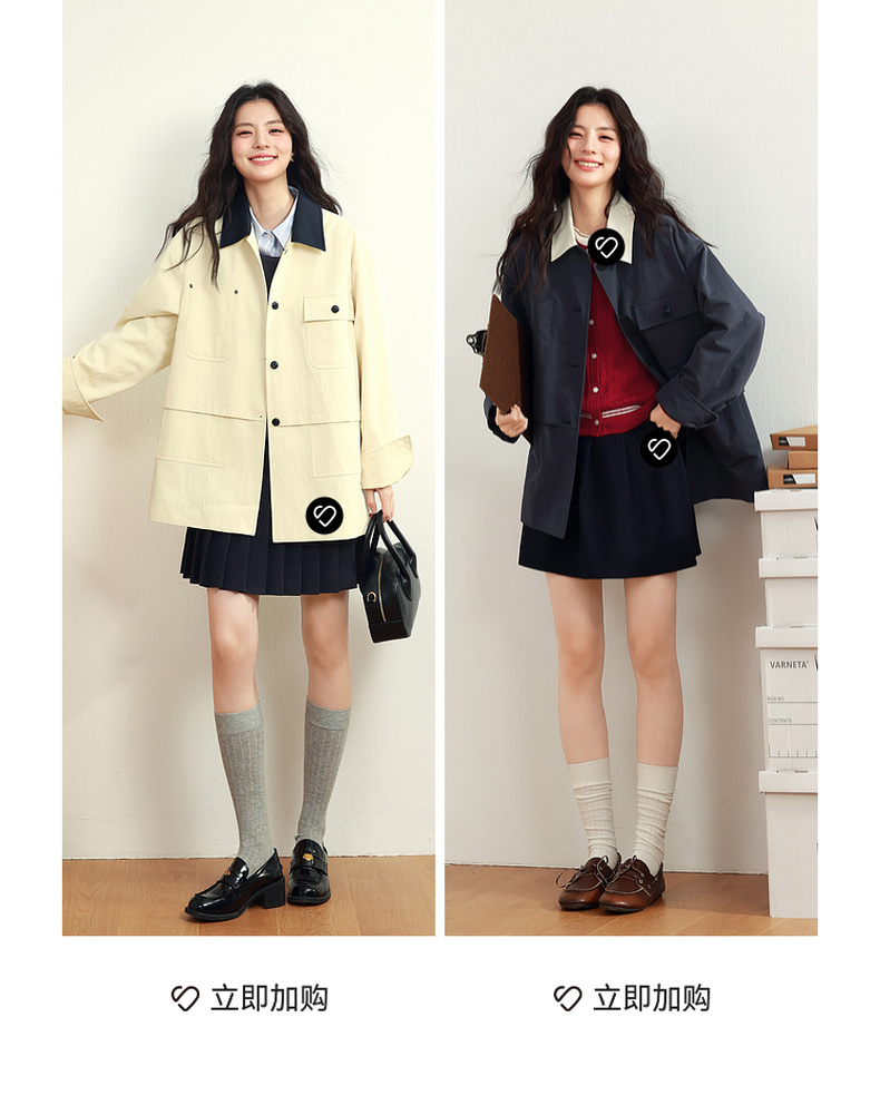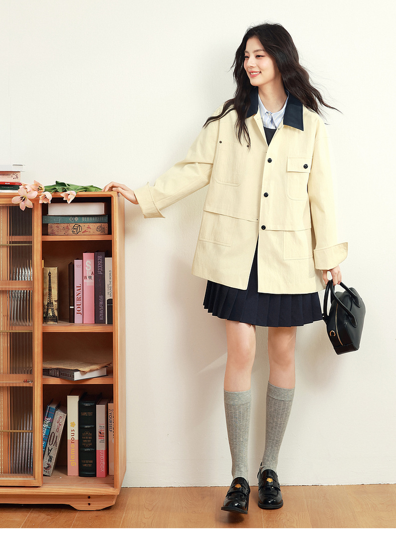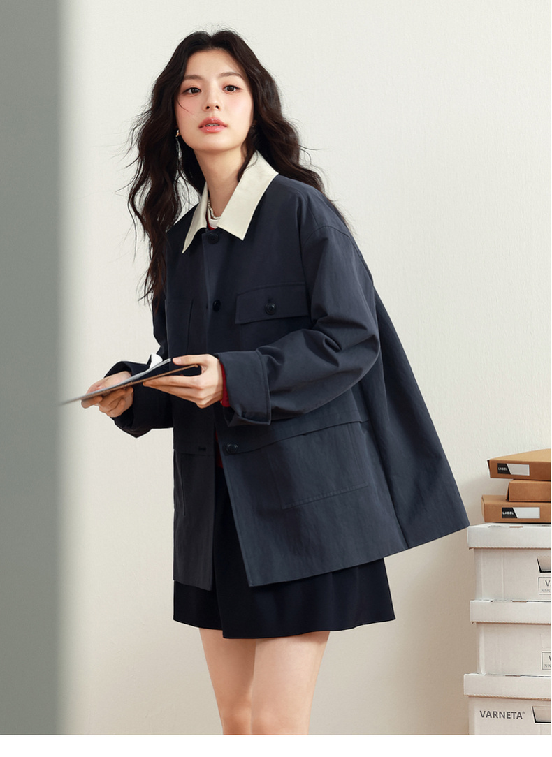 【严选】诗凡黎撞色翻领设计感风衣2025年春新款复古风别致质感中长款外套7G1160021
