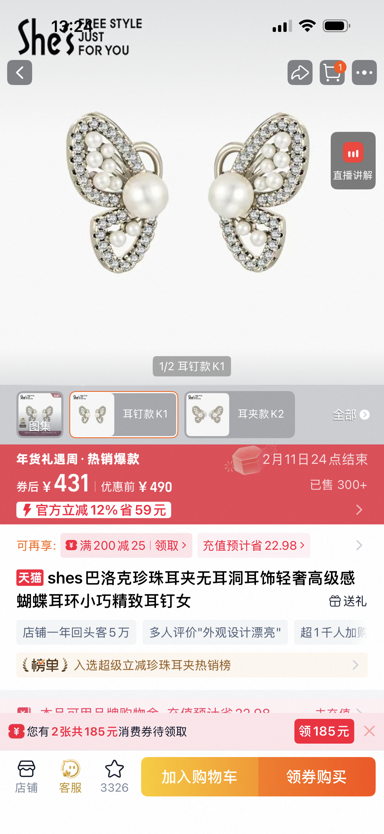 产品名称:She's 巴洛克珍珠蝴蝶耳钉