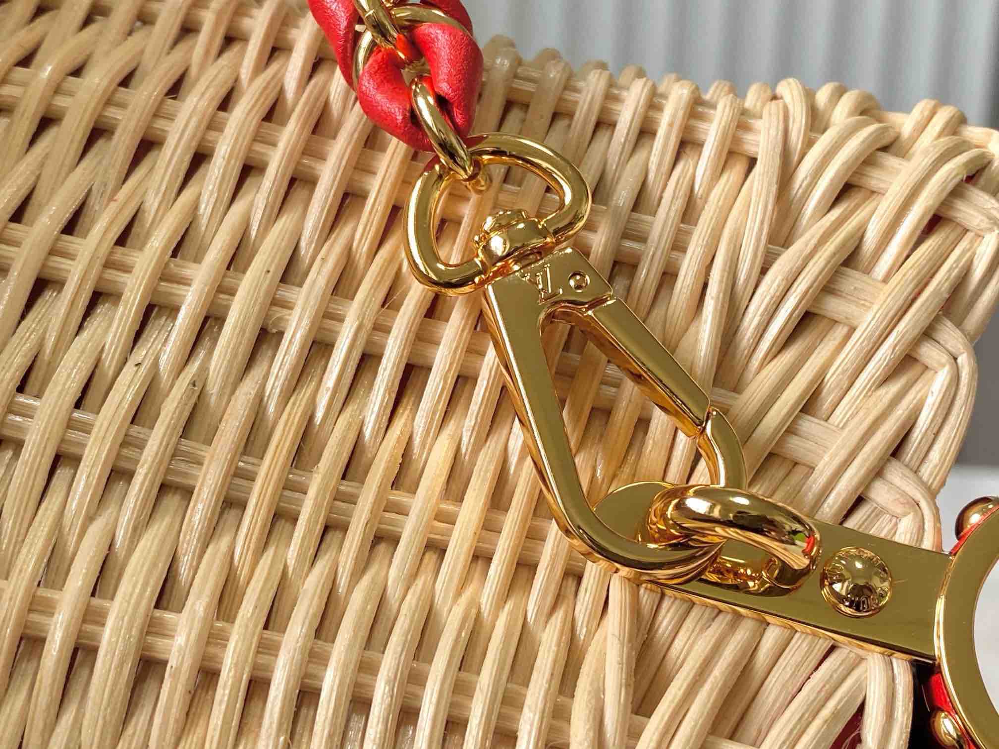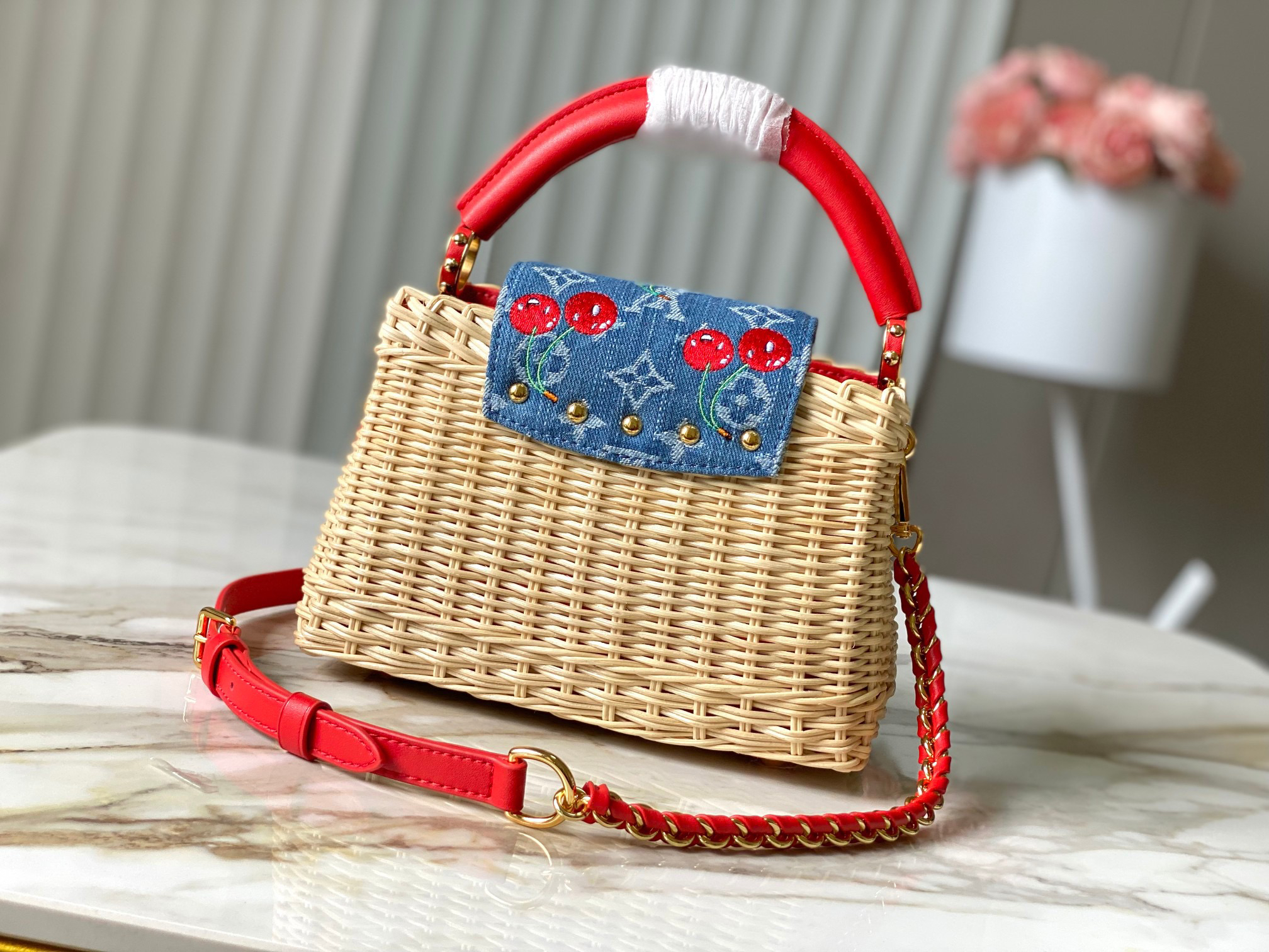 秋冬特惠💰1650 渠道级LV 新品 te级LV 动态芯片 LV X TM CAPUCINES 手袋 M14295/M48865红色樱桃竹篮 本款Capucines手袋邂逅路易x村上隆系列的瞩目细节 以清新元素烘托潮流格调 藤条包身与手柄、编织肩带和LV字母相得益彰 ding部翻盖细腻点缀樱桃图案 Size : 21 * 14 * 8 CM