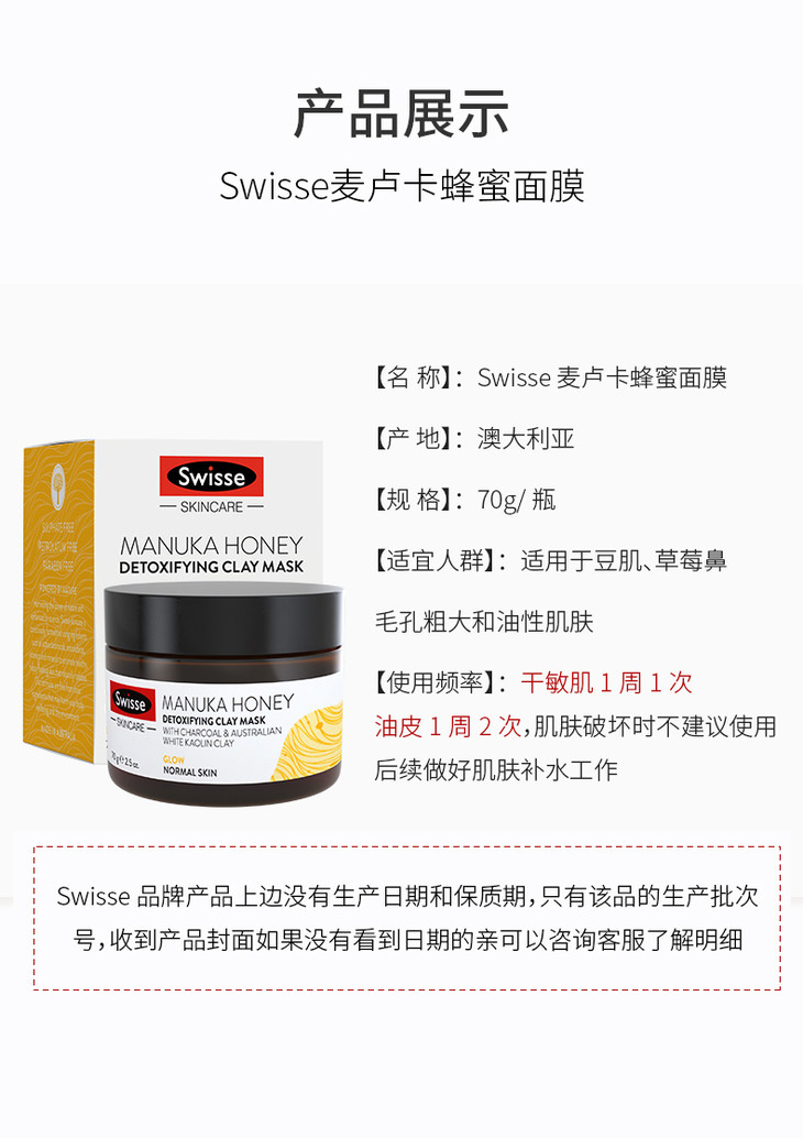 澳洲 Swisse斯维诗 麦卢卡蜂蜜/蔓越莓/抹茶涂抹面膜 70g