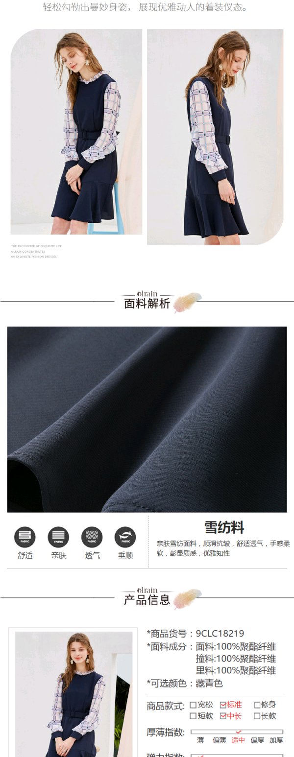 欧芮儿 新款纯色拼接格子连衣裙女显瘦收腰a字中长款裙子