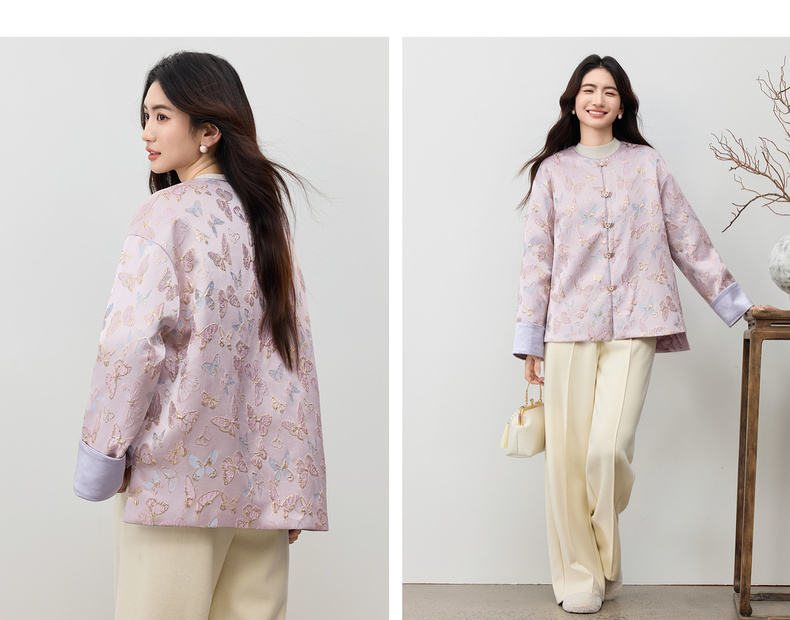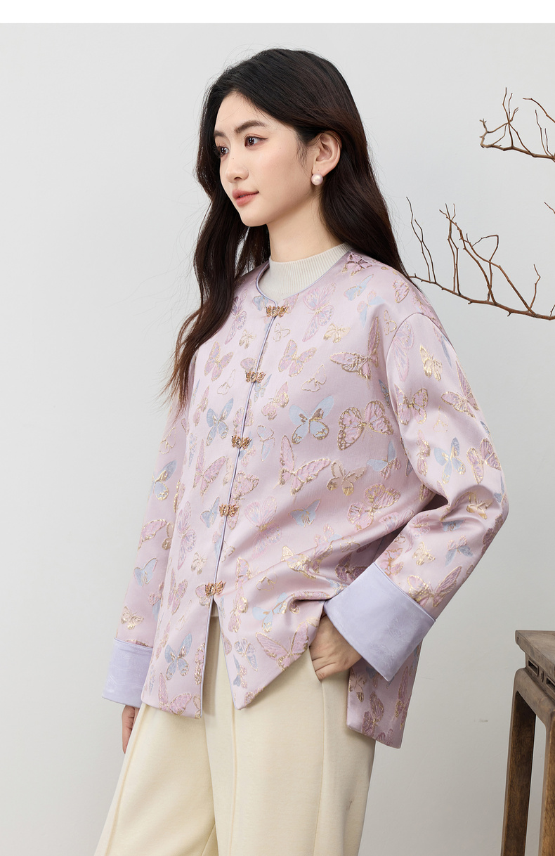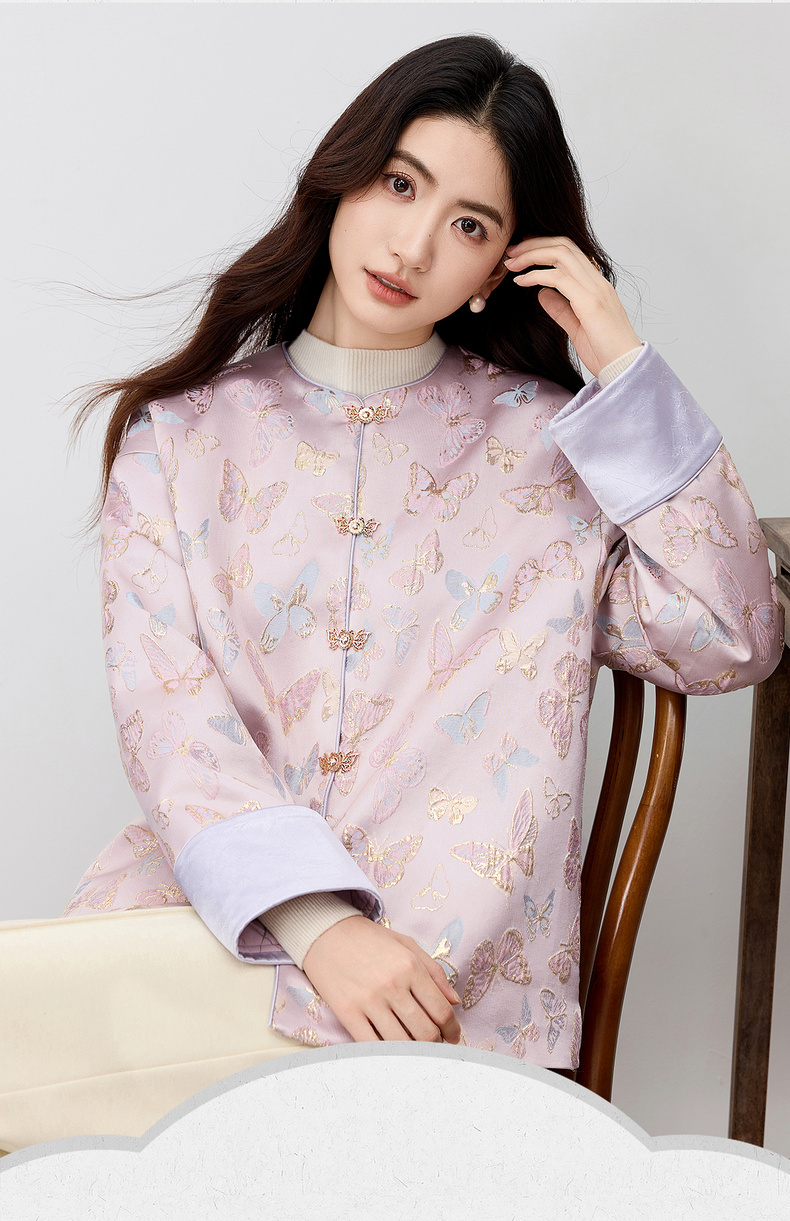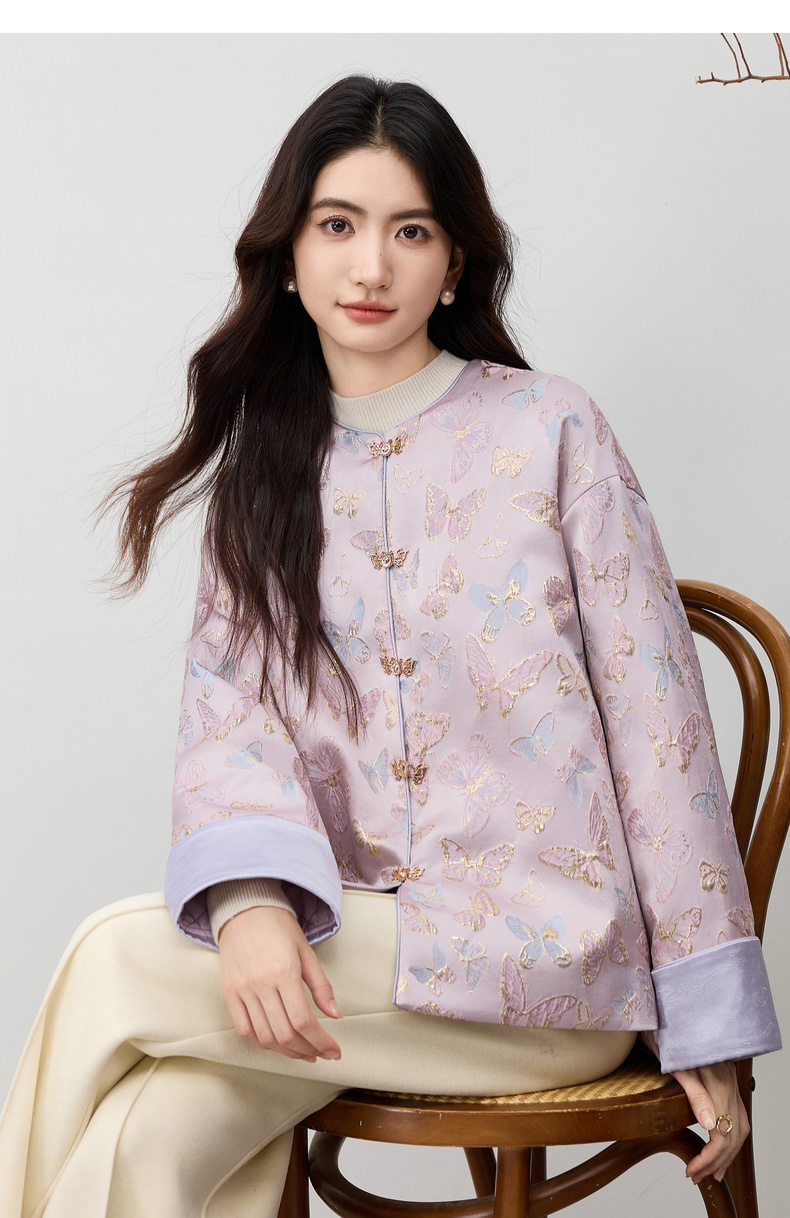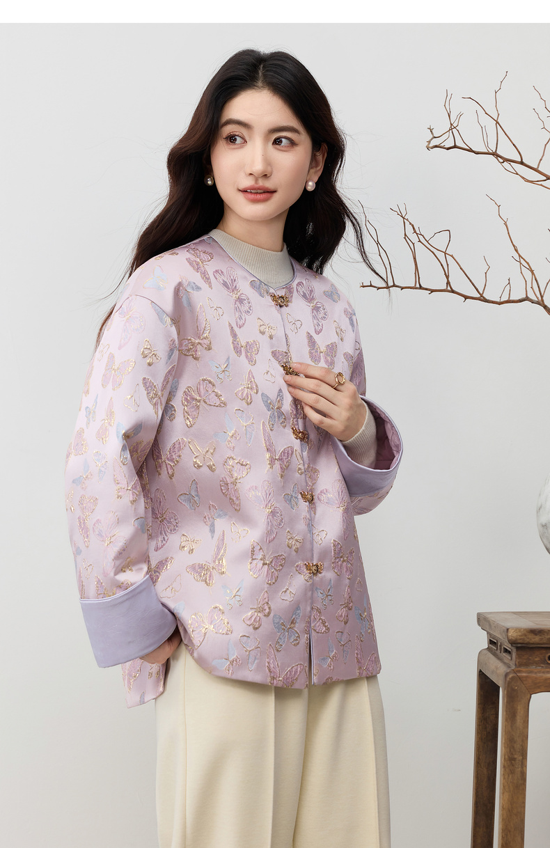 【内购】【夹棉保暖】优雅国风盘扣圆领蝴蝶织锦提花不规则下摆宽松外套-154WP3994