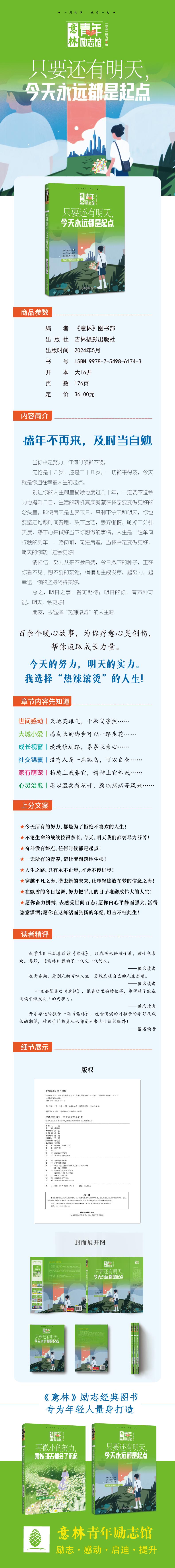 本书延续青年励志馆一贯的励志风格,聚焦个人成长,内容涉及学习、心态、成长、处世、思维模式等多个方面,给青年人以积极向上的精神力量,鼓励青年人努力、励志、积极同上。本书从“成长感动”的视角出发,用一百多篇精选文章描述了许多人在成长途中曾收获的感动。人生是一场跋涉,不能选择放弃的路,不能拒绝成长的路。选择一条适合自己的路,远比选择一条好走的路要重要得多。但更重要的是走好自己选择的路。做生命的强者,且行且歌!