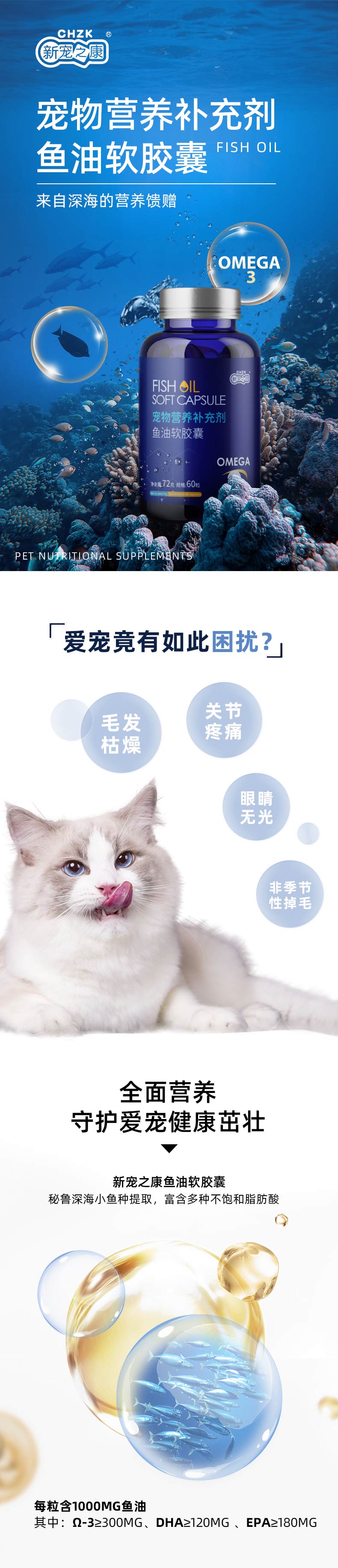新宠之康 鱼油软胶囊72g营养补充剂 牛磺酸 多种维生素滋养毛发犬猫通用
