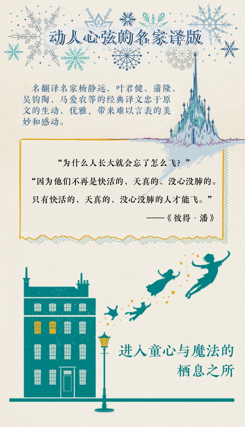 《彼得·潘》是英国著名剧作家和小说家詹姆斯·马修·巴里的代表作,自出版以来,畅销不衰,并多次被改变成电影和戏剧。这是一个充满幻想的故事,讲述了达林先生家的三个小孩,夜里背着父母,跟着一个神秘的小男孩飞向神奇的“永无乡”。那里有凶猛的野兽,有原始部落中的印第安人,有可怕的海盗,当然还有仙子和美人鱼,儿童幻想中的一切都在这里。在永无乡,他们“过家家”,与猛兽搏斗,与海盗打响战争……这个神秘男孩就是彼得·潘,这个永远长不大,永远不回家的孩子,把一代又一代的孩子带离家庭,让他们在永无乡度过了自由自在的童年时光。