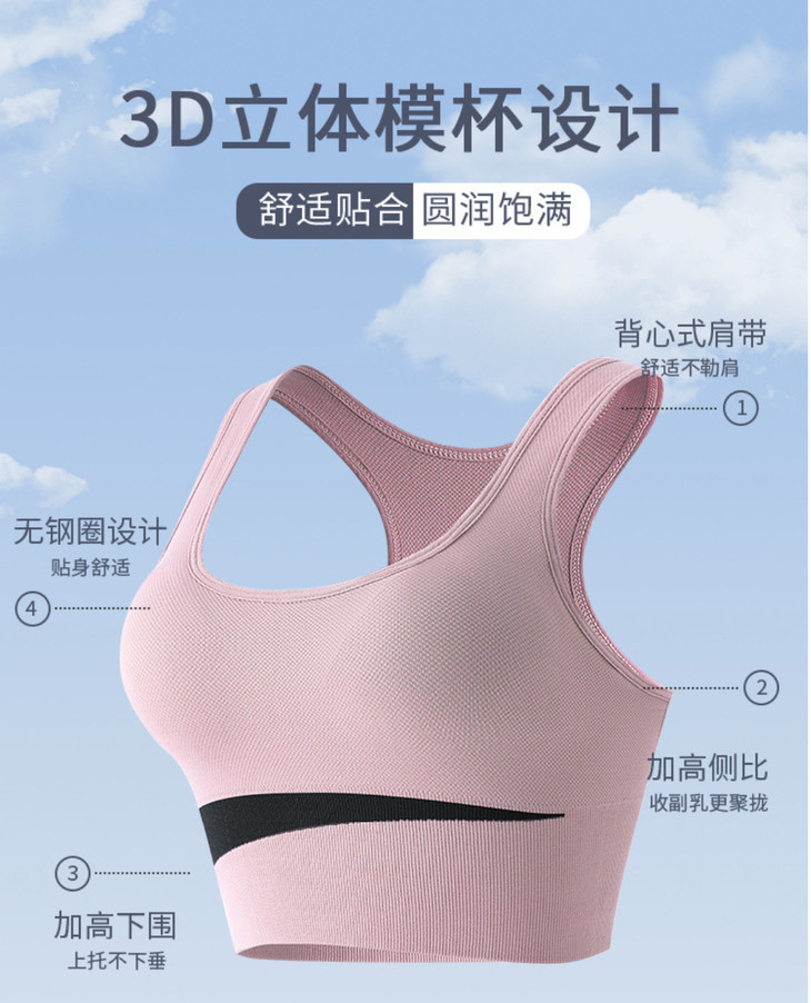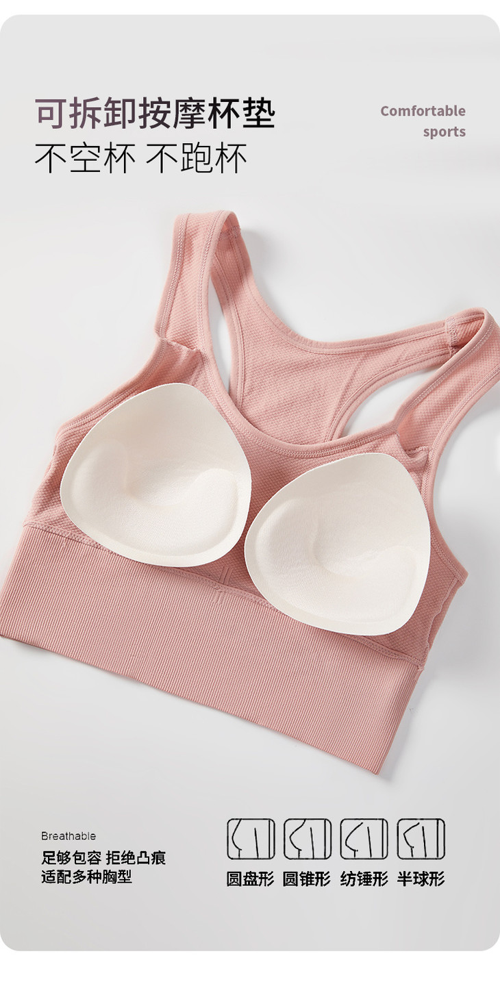 这款背心整体采用的是AAAAA级抑菌裸感面料 对常见的细菌具有有效的抗菌力 很适合稍微动一动就出汗的姐妹 流汗不留味,减少肌肤过敏的概率 胸垫是固定的,运动不会移位变形,和胸部紧密贴合,不凸点,也不会跑来跑去的,还很好机洗。