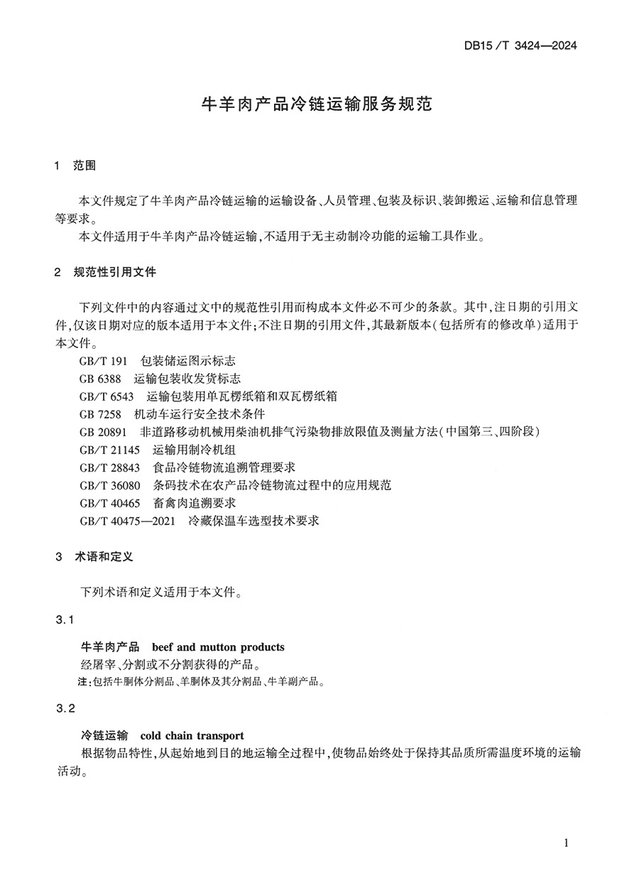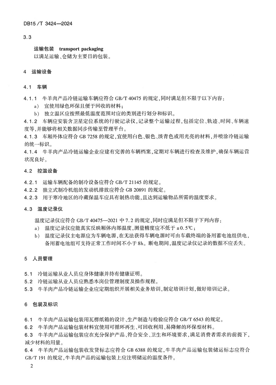 牛羊肉产品冷链运输服务规范(DB15/T 3424-2024)