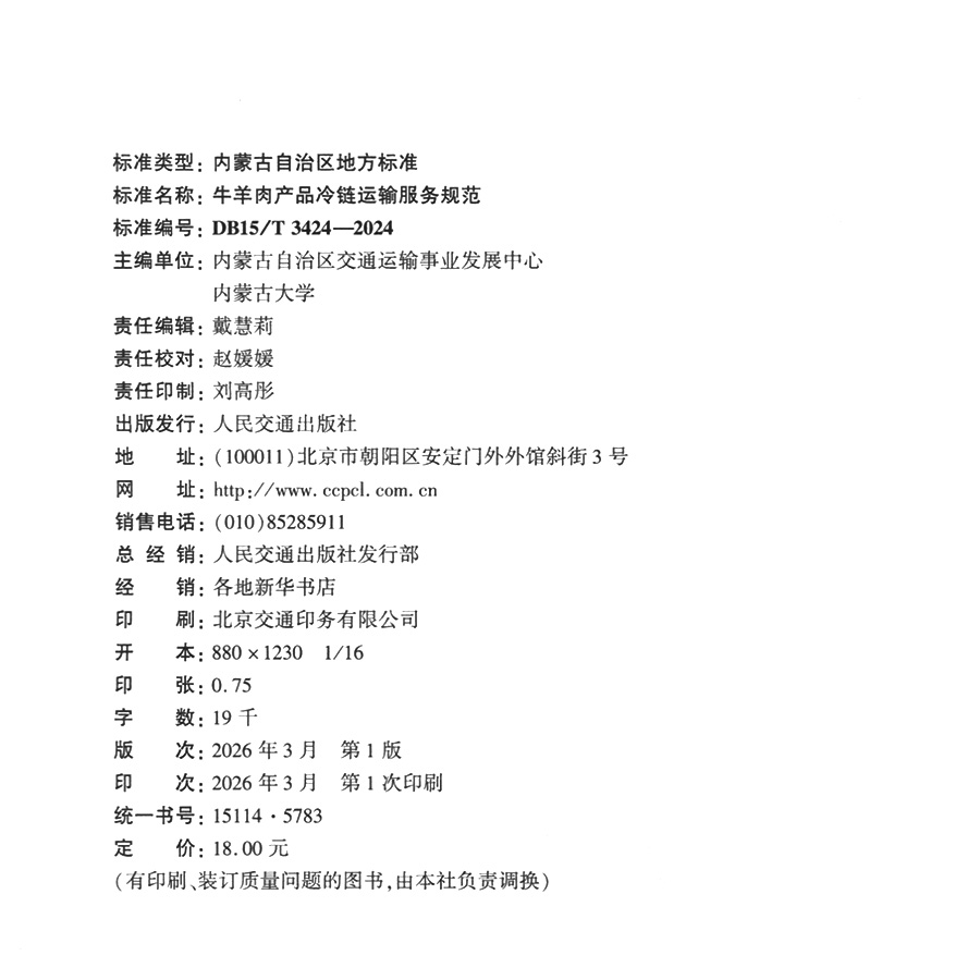 书名:牛羊肉产品冷链运输服务规范(DB15/T 3424-2024)