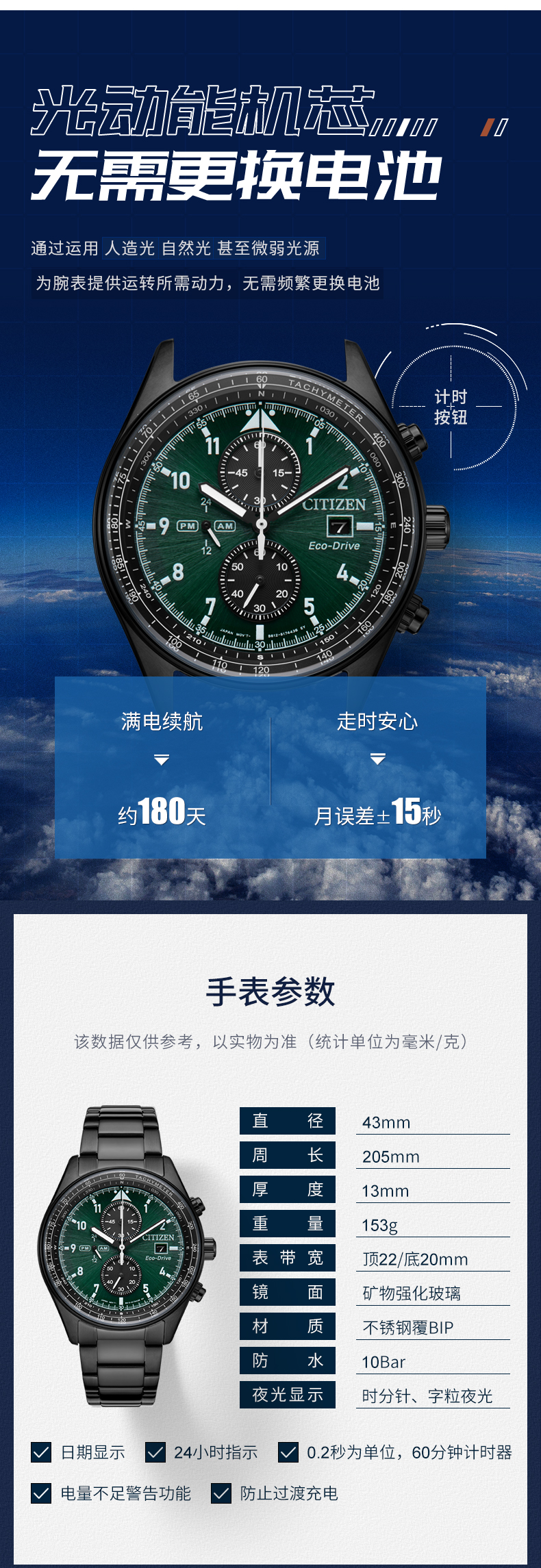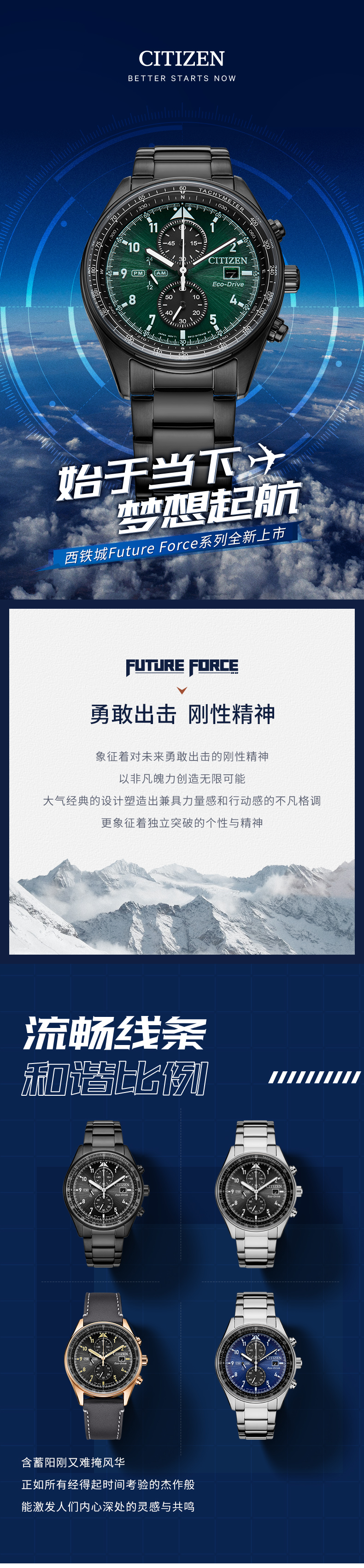 西铁城日本官方正品新款FF系列飞行风钢带光动能手表男CA0775-87X
