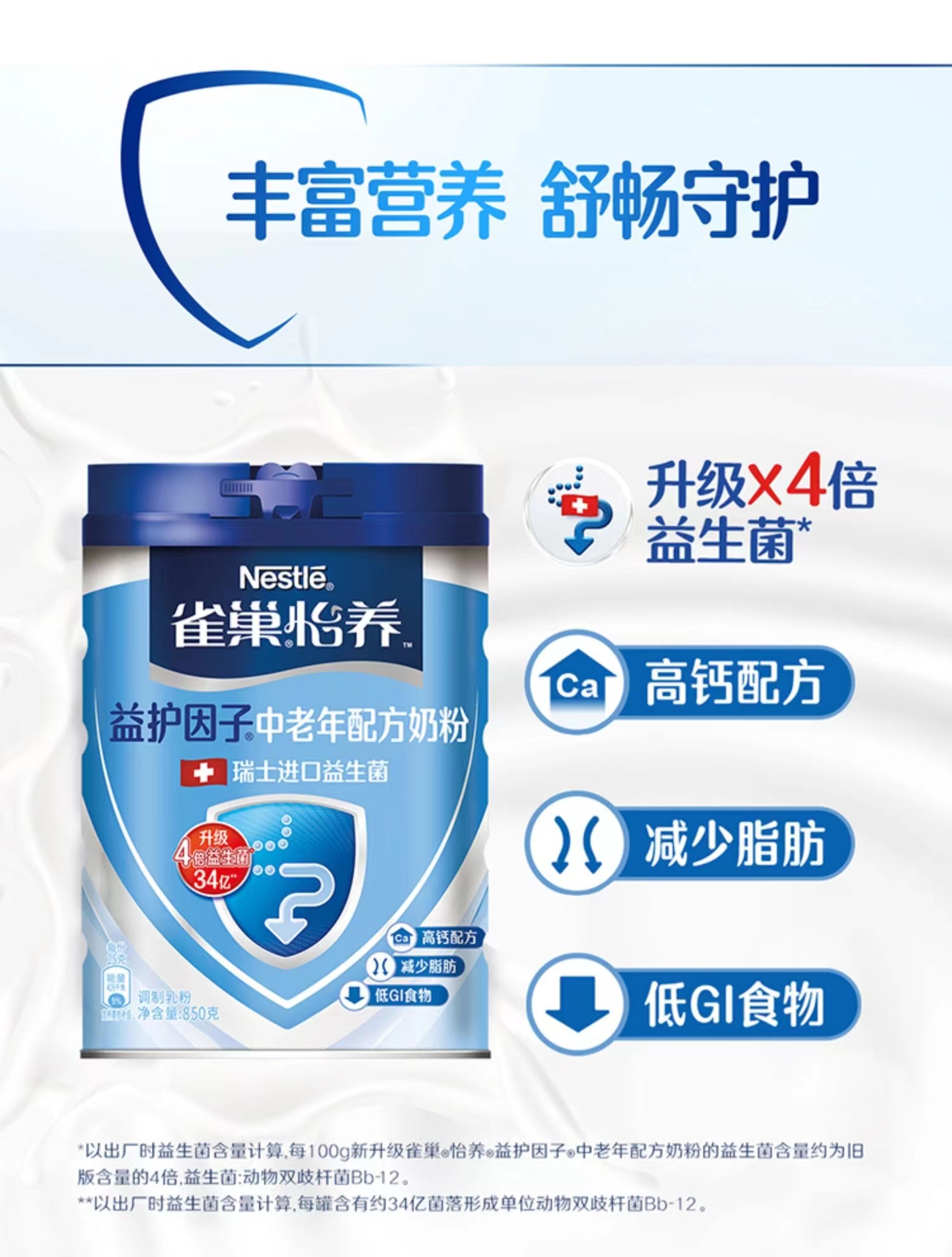 雀巢怡养中老年高钙奶粉益护因子益生菌奶粉850g
