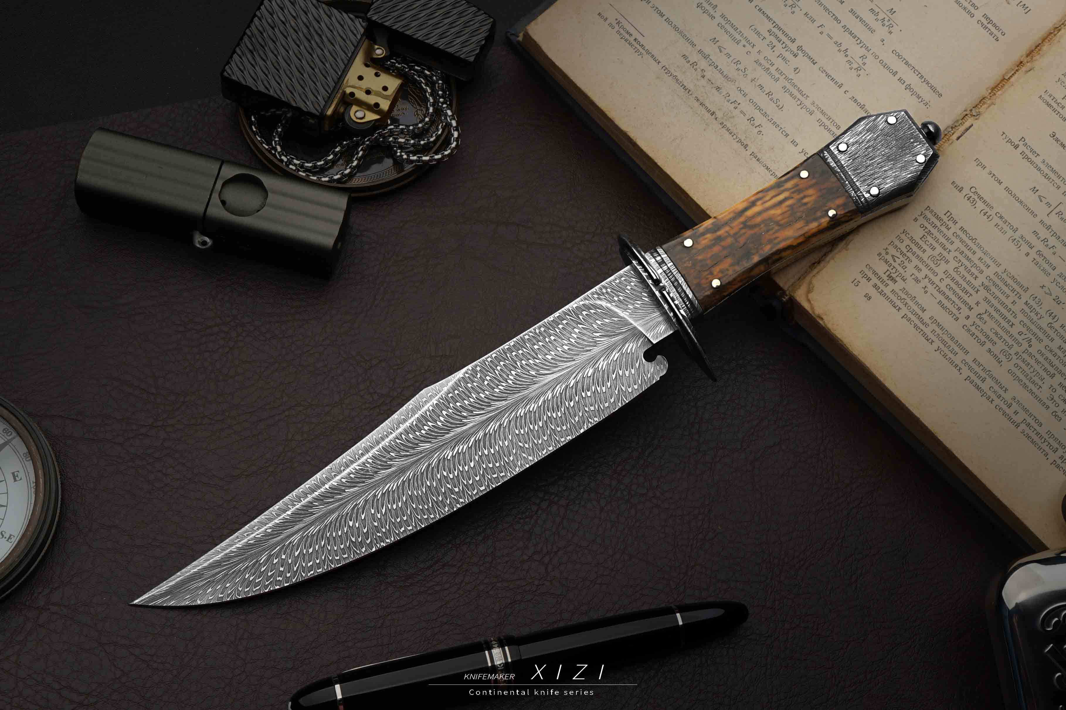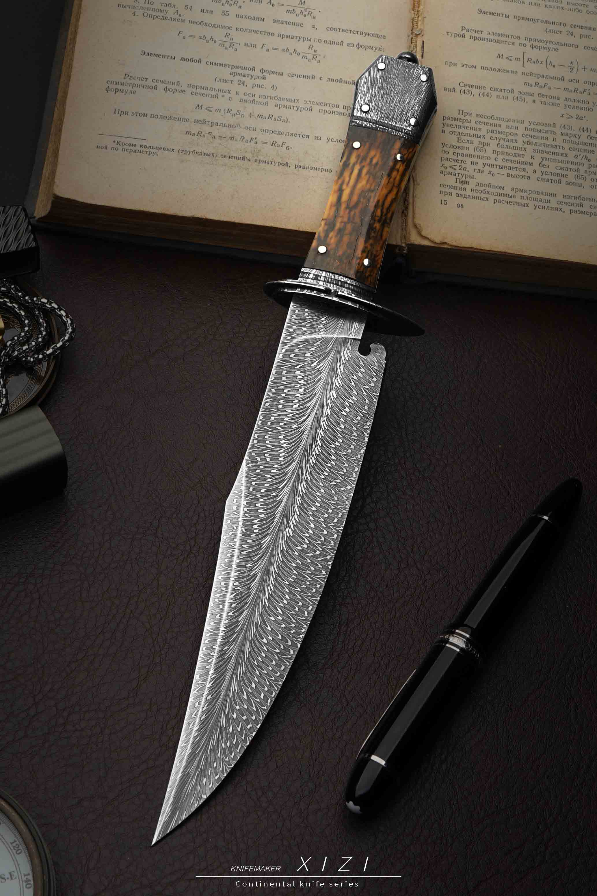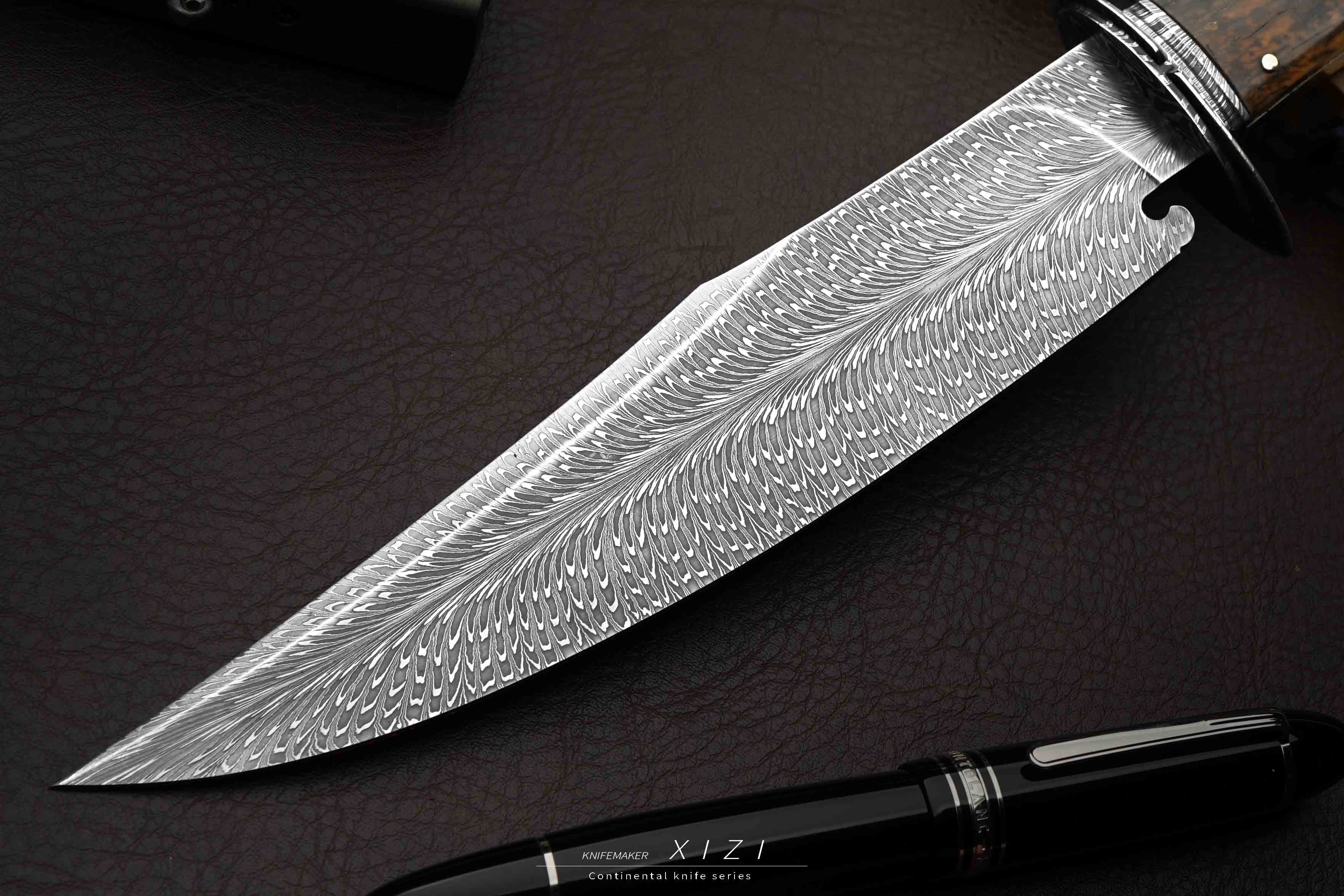2024龙年到,这是我专门为龙年制作的作品,整只作品造型酷似恶龙的牙齿,而且诚意满满,用了之前做三万多的配置,大家有预算的都推荐入手一只。美国边境英雄吉姆博弈发明的战斗刀,诞生于19世纪30年代,1827年吉姆博弈在一次故土保卫战中挥舞手中刀,以一敌三将三人开膛破肚身首异处,此后人们为了纪念他就把这种刀称为博伊刀,它的设计极具搏斗性和攻击性。我们自己锻打的经典羽毛纹大马士革钢,黑白灰三色分明,纹路清晰自然、栩栩如生,放大看依旧美丽,用了很厚的一块钢,大家从背部可以看得出来,料子很扎实。经典刃形,刀尖有加强,长长的切割线用于户外切割也非常合适,根部做了一个卡槽,实际战斗中能把对方的刀卡住(虽然现在用不到这个功能了,但是想了下还是得有)。全套的大马士革配件,护手和尾巴都是大马的,并且纹路和刃部配套一起锻打的,有点原汤化原食的意思。新年作品做就要做最经典的,使用了1837年James Black为吉姆博弈做的“棺材”柄型制,因其酷似西方棺材而得名,当把刀柄和棺材联系在一起,好像会传递给人一种邪恶美学的感觉,对于我们国人来说,棺材嘛,升官发财。这种手柄不光好看,而且质量非常扎实,并且它轻量,设计还是对称性的,左右手可以随时切换使用,不需要适应过程,美观与功能性并存。给大家配一个纯手工做的真皮鞘,各位自己收藏或者送人都合适!!!