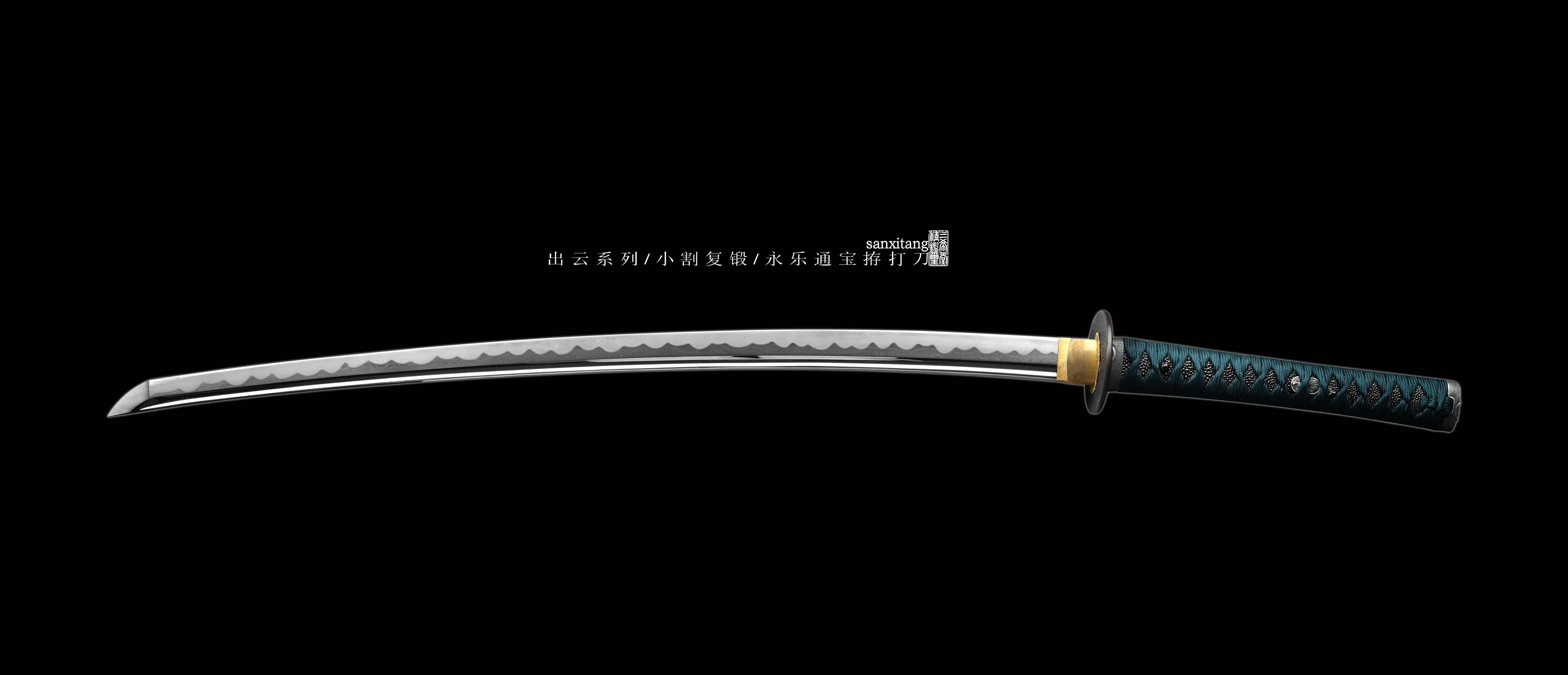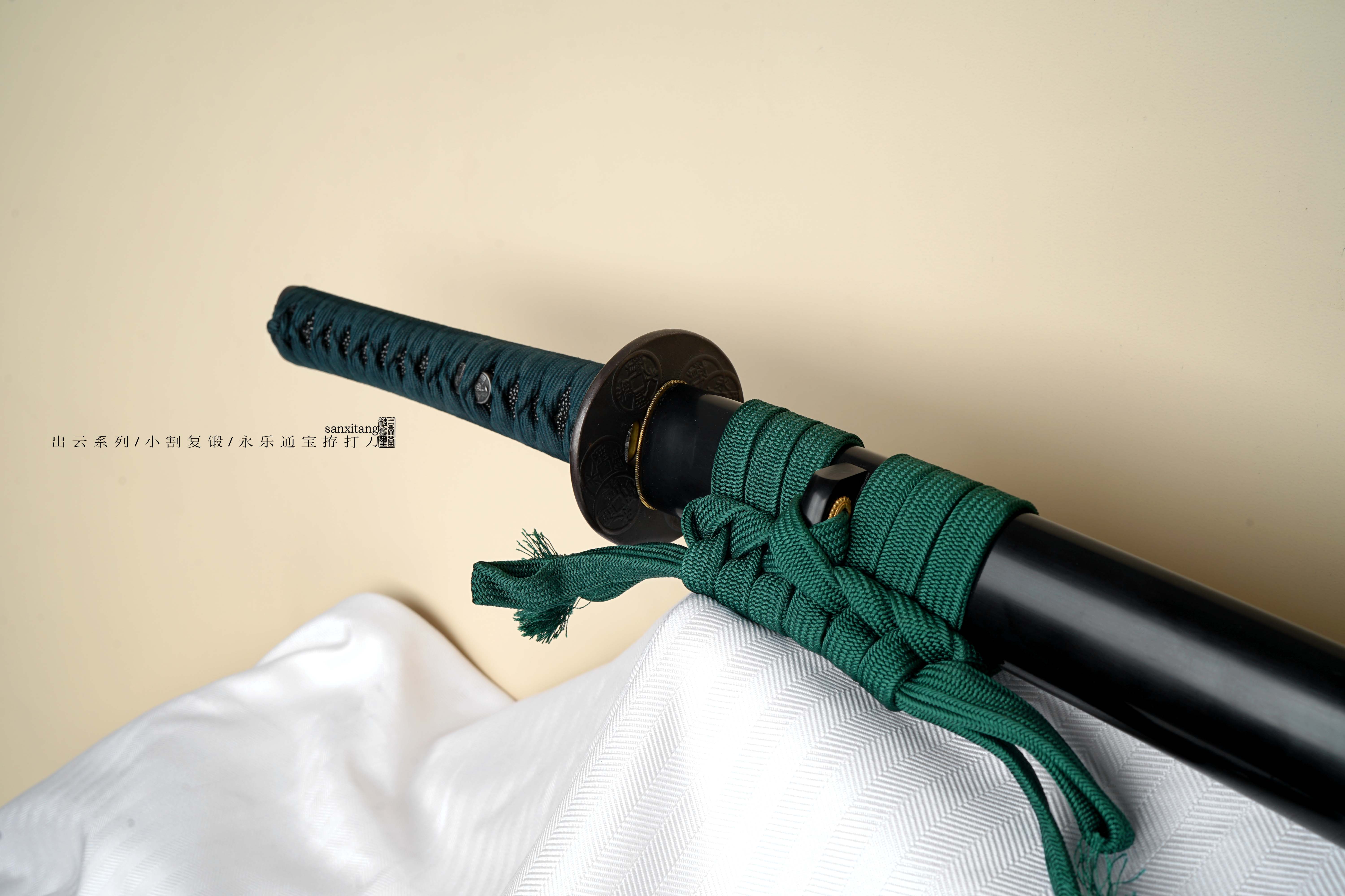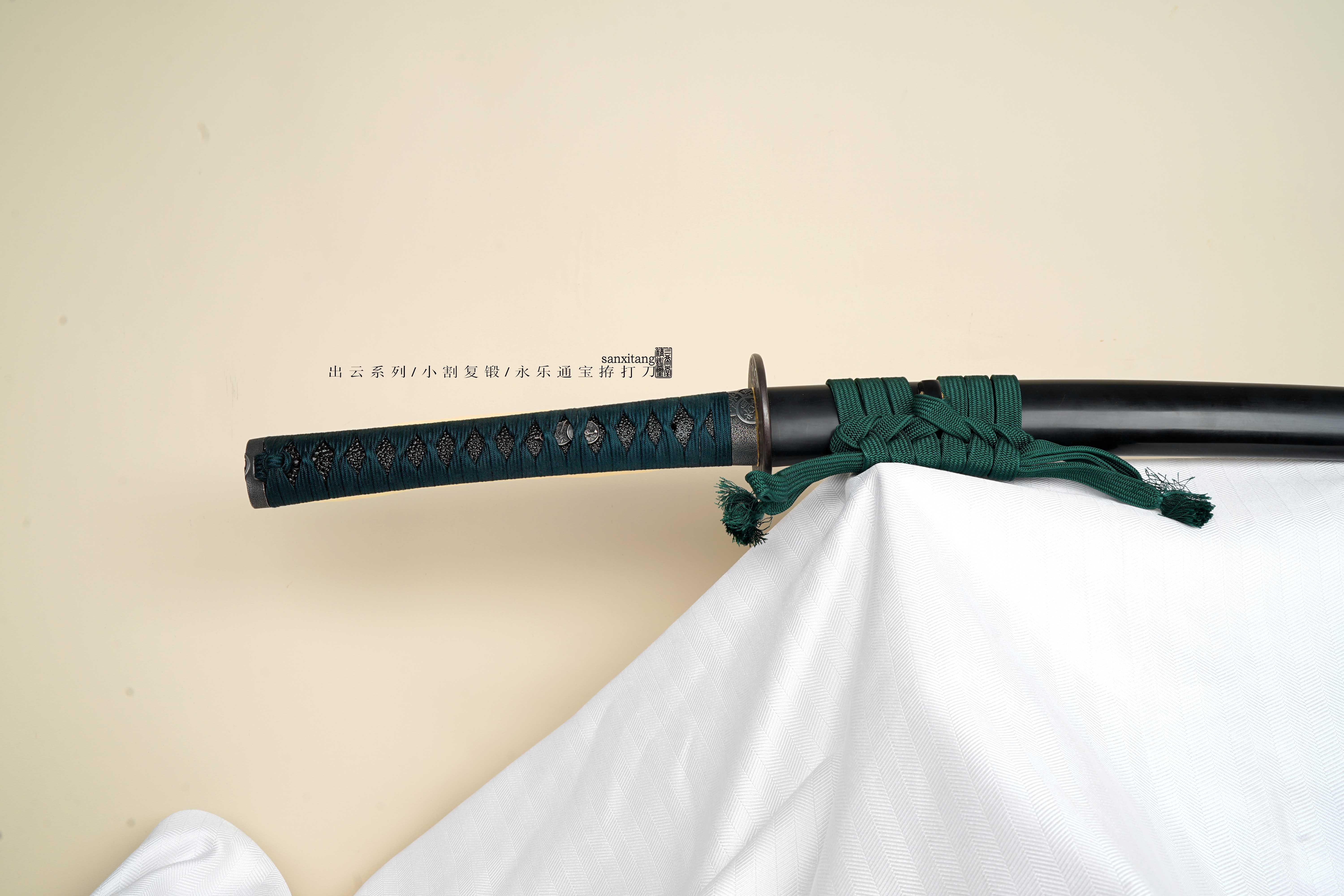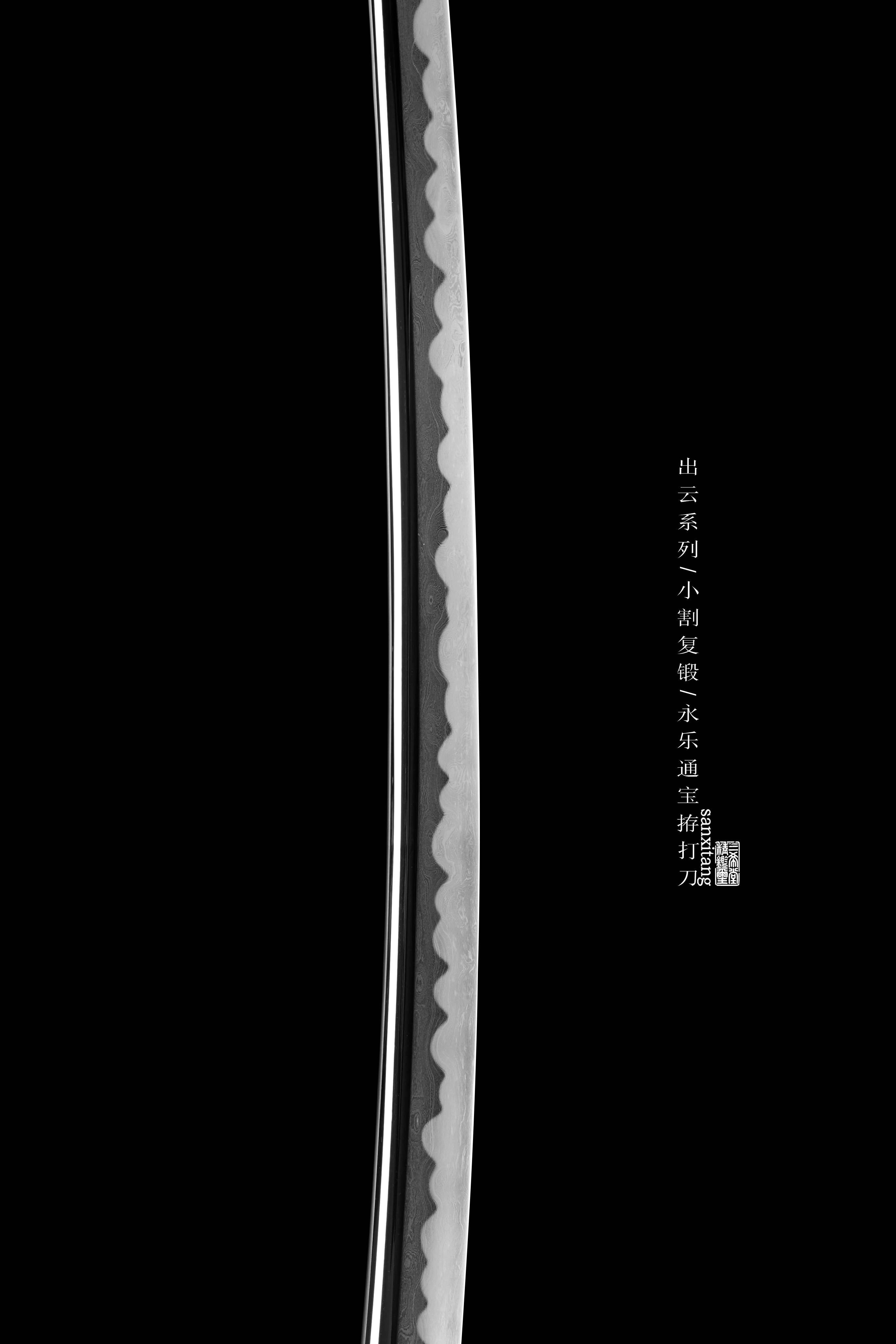 传统方法炼的玉钢 纹路细腻清晰 特别制作了一下刀姿 反(弧度)比一般的大一些开了镜面樋(槽)整把刀所有的点线面之间都立体分明 上研后钢的细节完全被展现出来 黑白灰三色明显 表面的质感相当柔顺 清澈如水 全套织田信长金具 当时永乐通宝在日本伊势流行 永乐钱的影响非常大 要想达到“天下布武” 金钱财富的支撑必不可少 所以信长把永乐通宝作为旗帜 展示家格和实力 用于震慑对手 这只作品所有配件都是单独制作的 鞘和柄用的日本的朴木手工一点点削出来的 和刀条一比一匹配 插进鞘里刀一点都不会晃 柄可以达到完全可拆卸的程度 用整张大亲粒的上等珍珠鱼皮包裹日本进口真丝柄卷 绑柄的方法也是纯日式的非常紧 无论手指怎么按压都不会有形变 这只作品整体就是两个字 干净 各位有想入手好一些日本刀可以滴滴我了