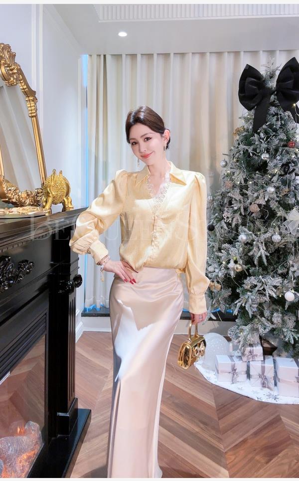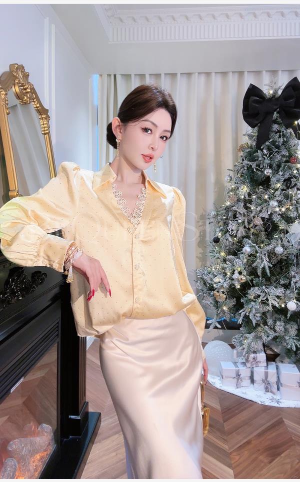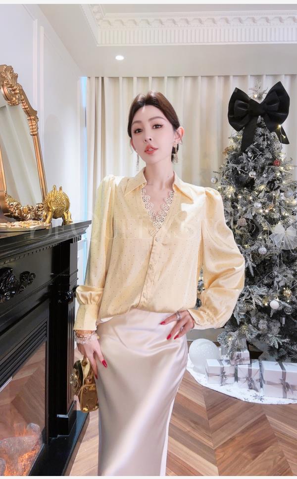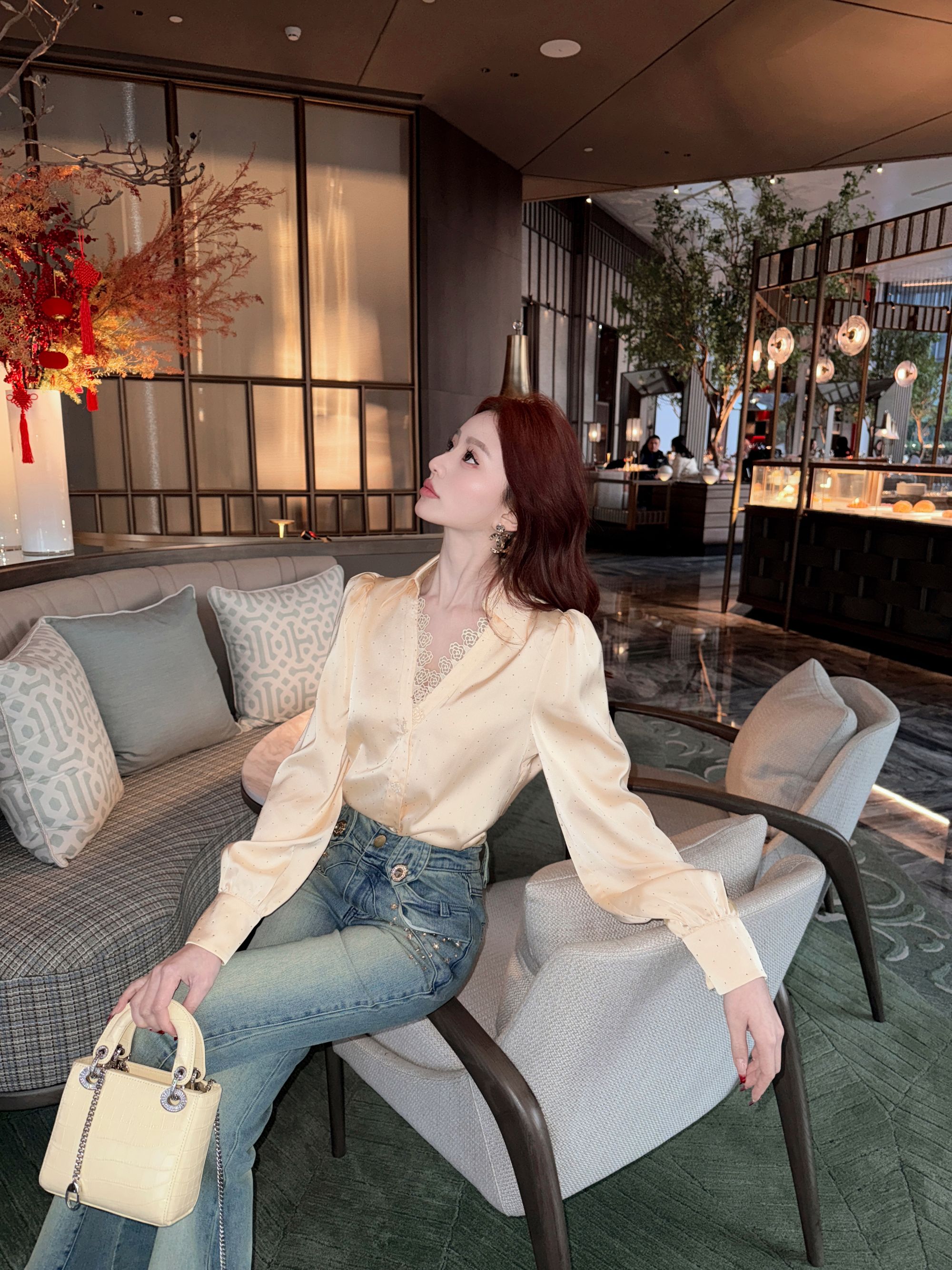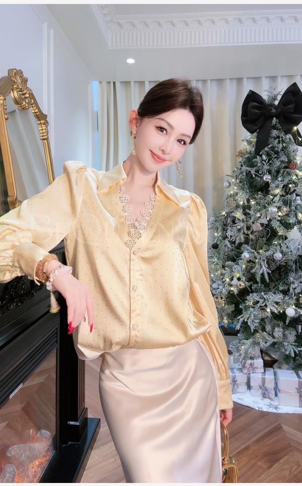 【孤品样衣,不退不换】【浪漫春波】2025年早春新品轻奢重工烫钻拼接花边翻领衬衫