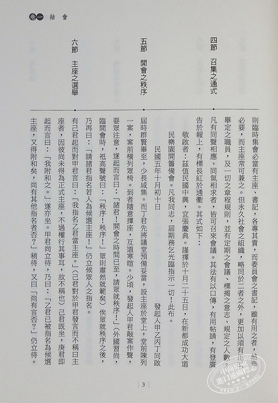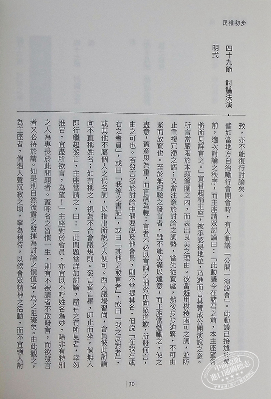 《民權初步》是孫文先生思想中建國方略之社會建設,這本書於1917年2月發表於上海,是孫文先生參考美國學者沙德女士之會議規則而來。孫文先生在其自敘中說道,這本書是教吾國人民行使民權的第*部方法,所以名為《民權初步》。他認為,我國舊社會凌亂散漫、毫無組織,常被恥笑為一盤散沙;復興民族,必自改造社會做起,使我們的社會成為有秩序、有紀律,合乎現代化的新社會。孫文先生鑒於中國人一向缺乏組織習慣和團體生活訓練,常連z基本的議事規則也不懂,乃著成此書,希望全民按照《民權初步》的訓練,使之成為我們生活習慣的一部分,然後可以塑造出一個有組織的國家和民族。