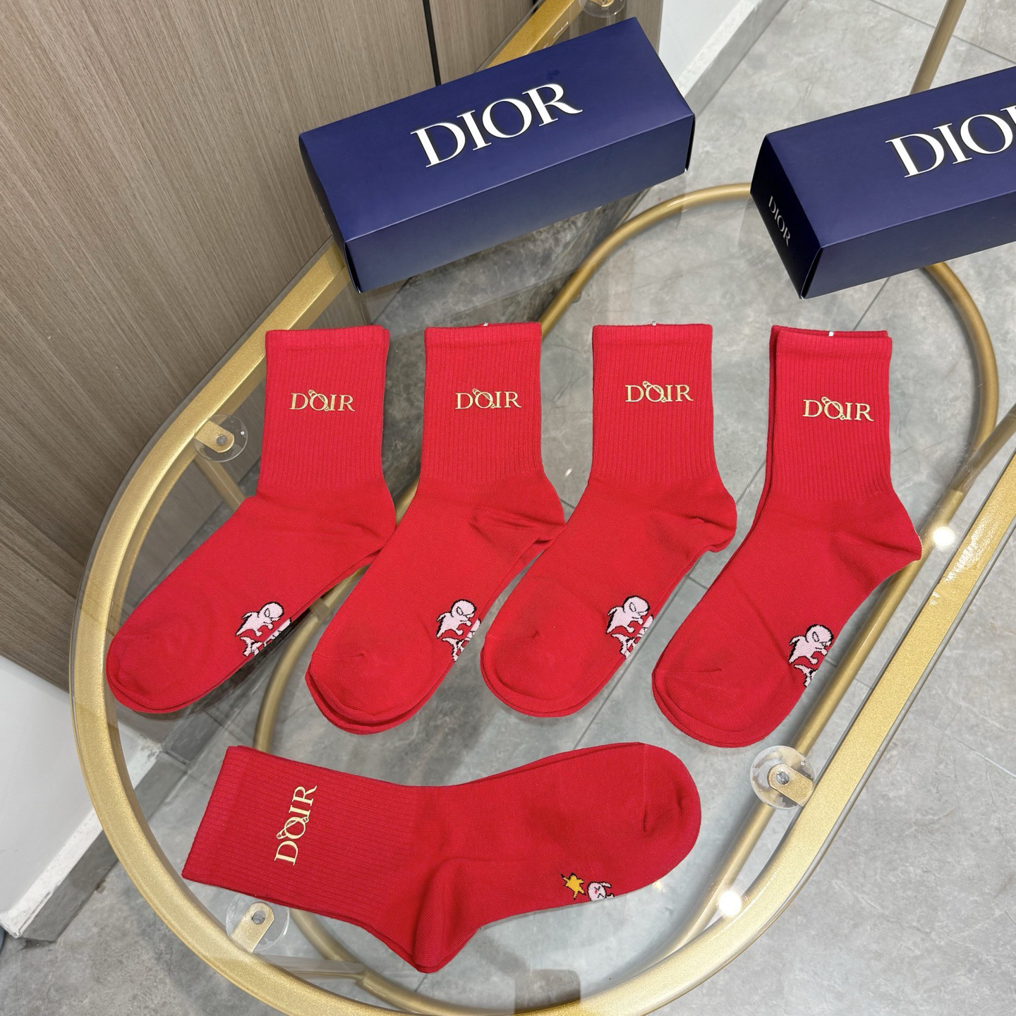 秋冬特惠💰140【一盒五双】迪家袜子 红红火火过年袜 专柜同款字母烫金中长款袜子!罗口刺绣品牌简称字母ins装饰,专柜同步筒袜袜子,大牌出街,潮人必备 超好搭