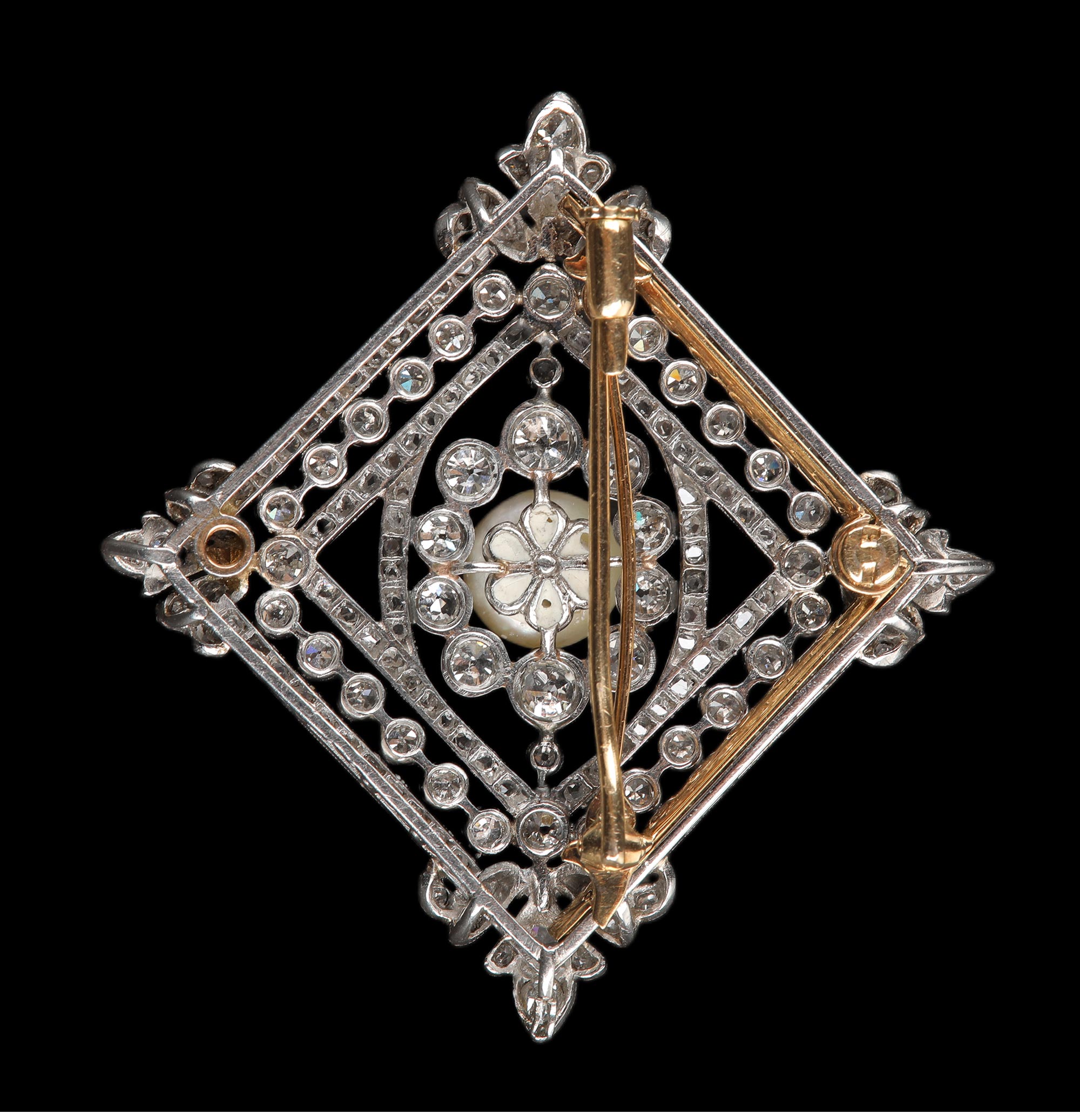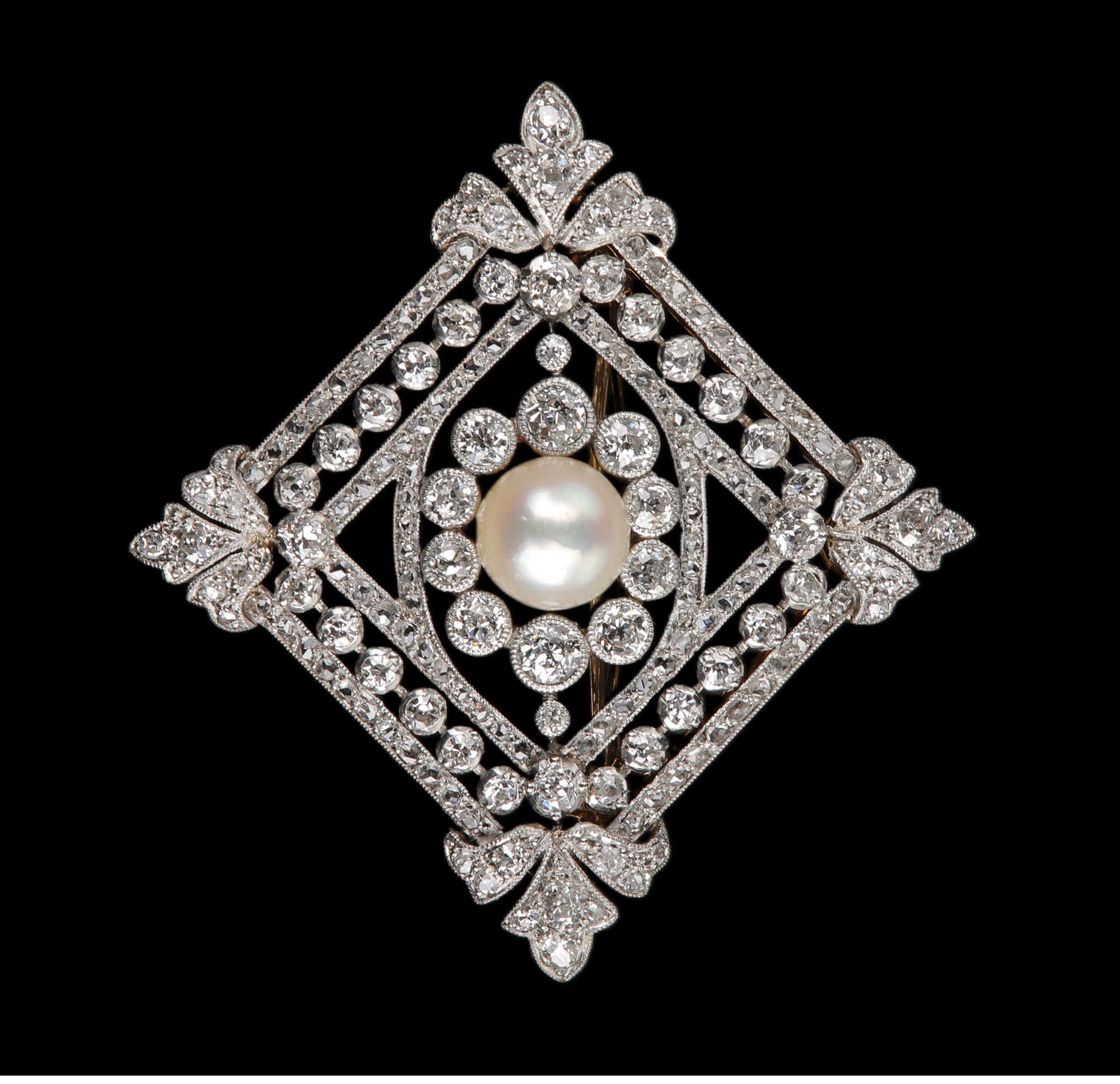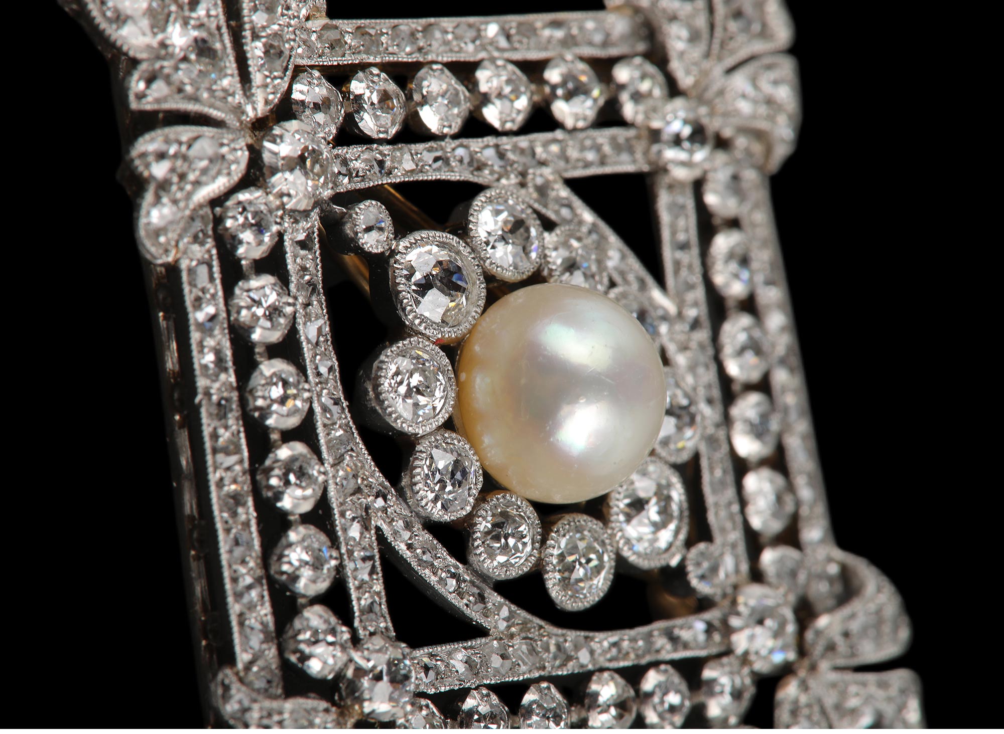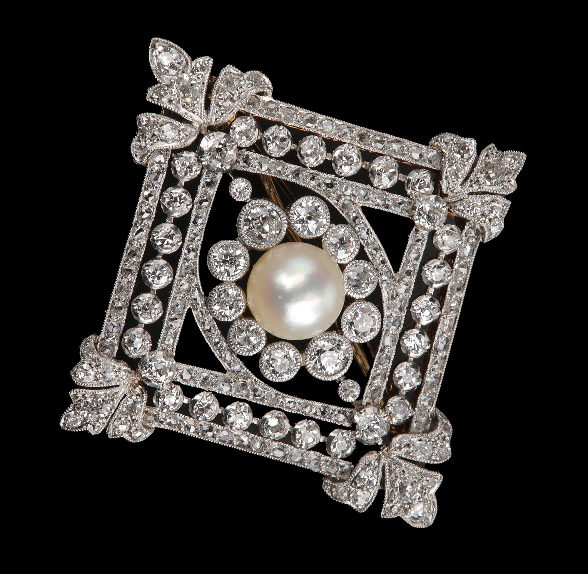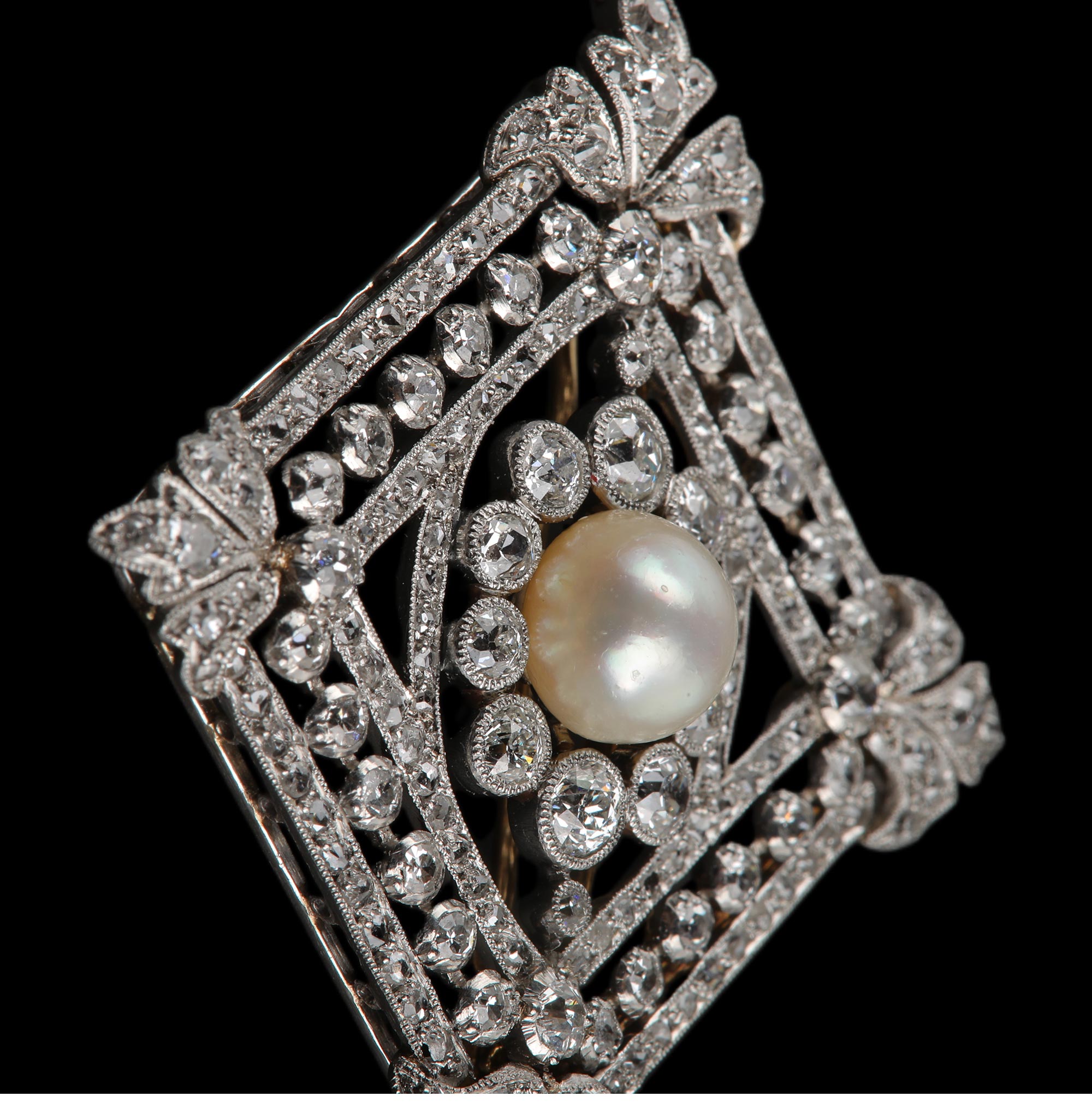1910年代法国出品几何缎带造型铂金镶嵌天然海水珍珠及钻石胸针