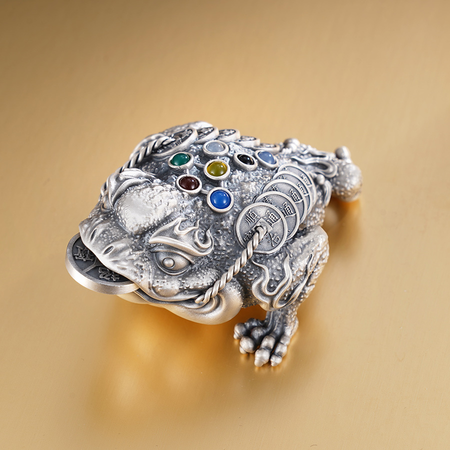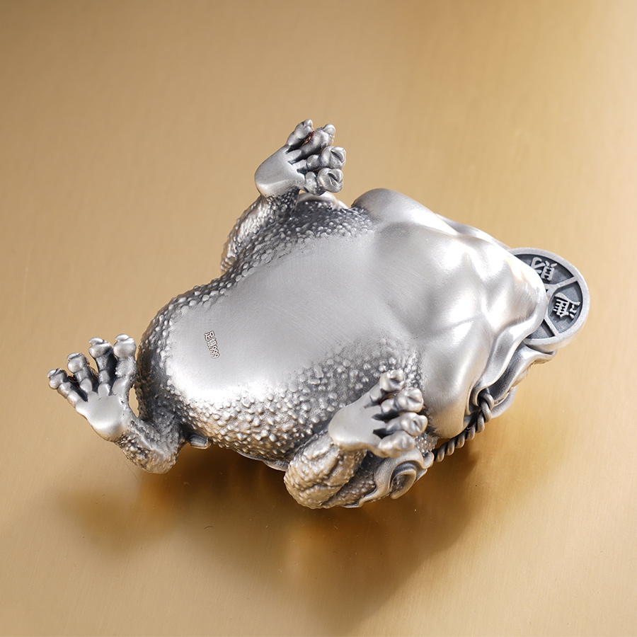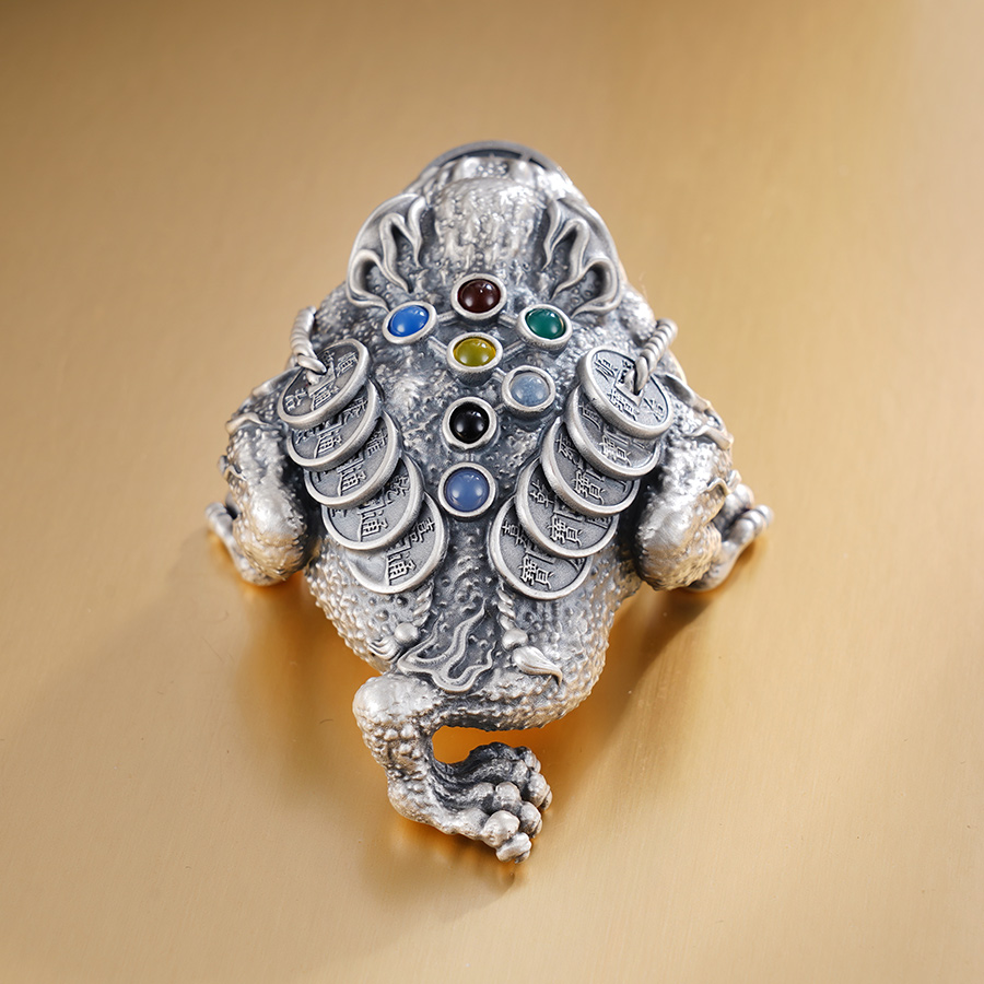 【寓意】:一款寓意聚财的风水珍品。蟾蜍匍匐半蹲,蓄势待发,似有磅礴之力欲喷薄而出。蟾蜍口衔铜钱,背上亦堆叠铜钱,无不寄托对持有者的美好祝愿。